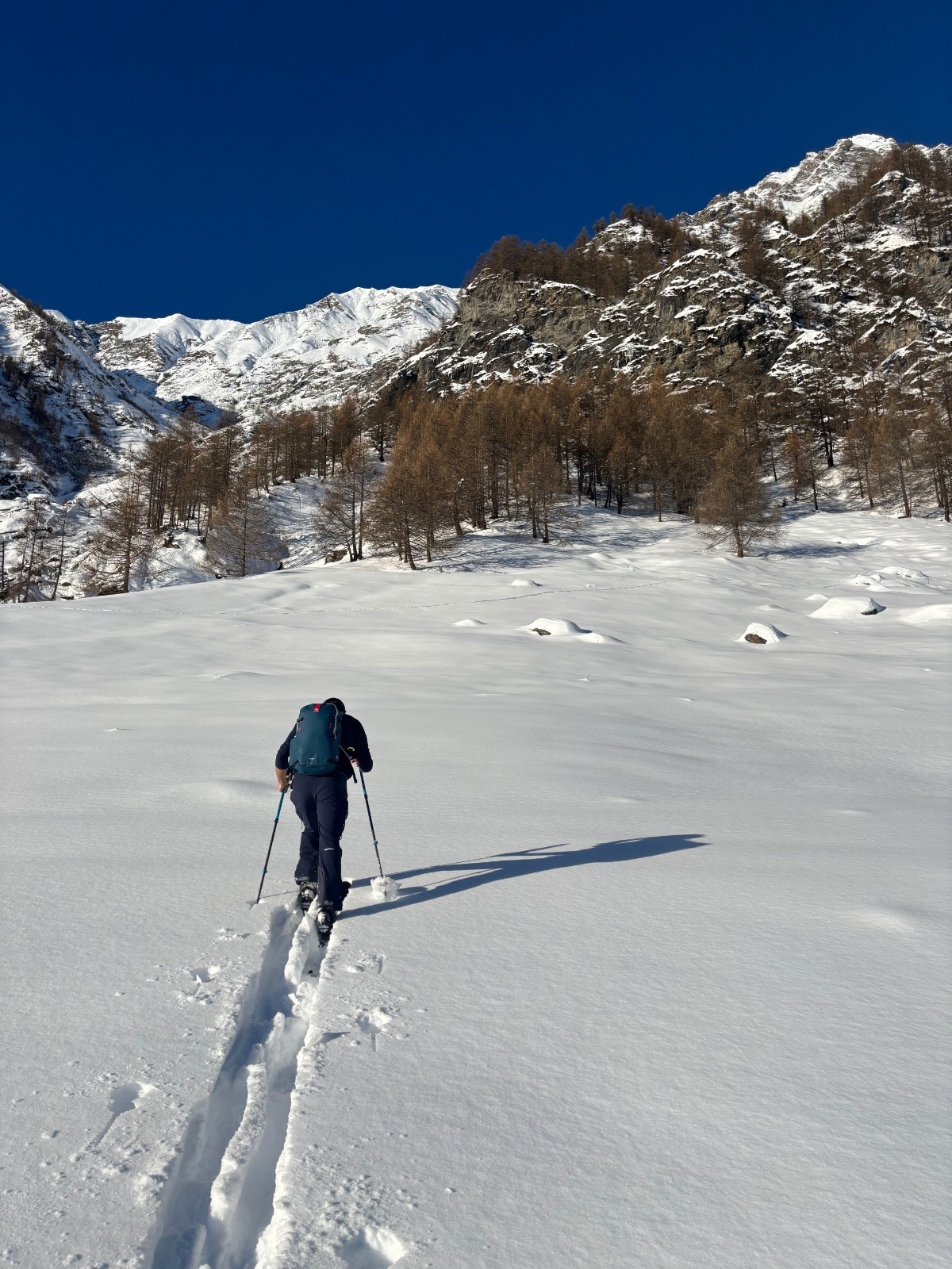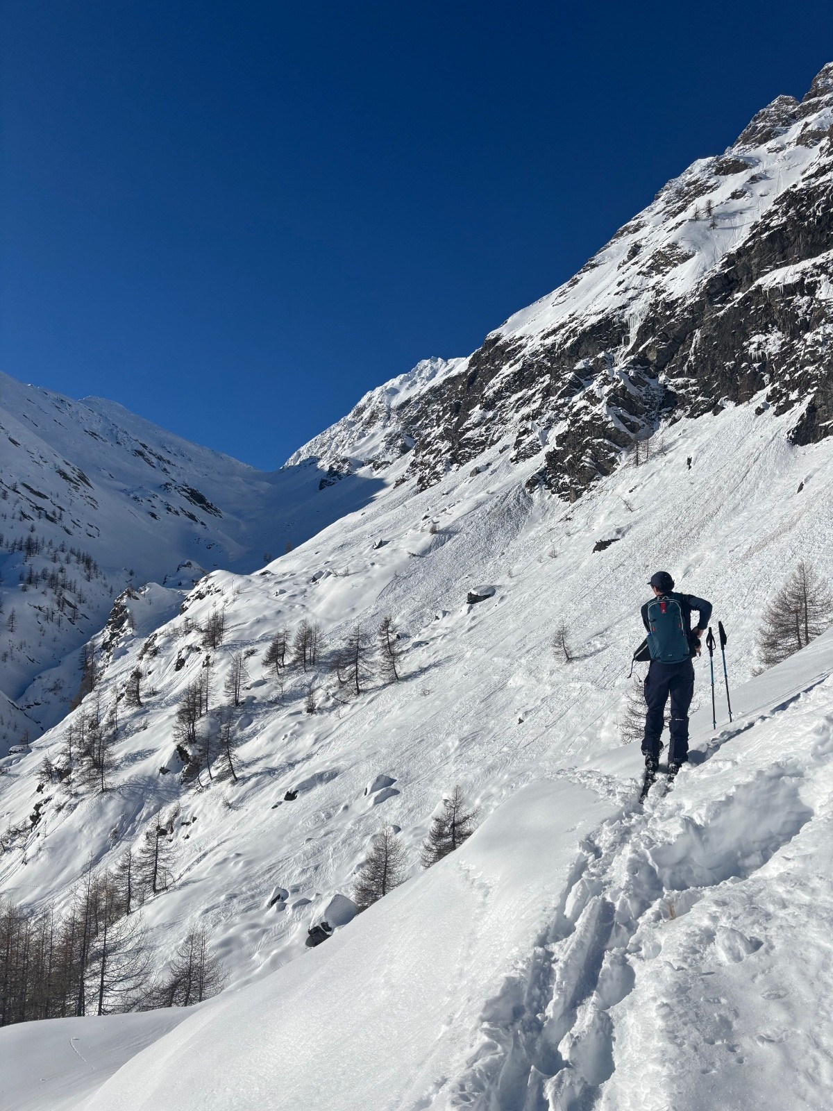 Ici la neige était tellement bonne qu’on a finalement pas basculé de l’autre côté pour se mettre une magnifique descente au soleil. À la descente on a trav à droite quand le ruisseau plonge et on a bricolé dans les arbres et dans le raide pour se retrouver en bas d’un autre ruisseau.
