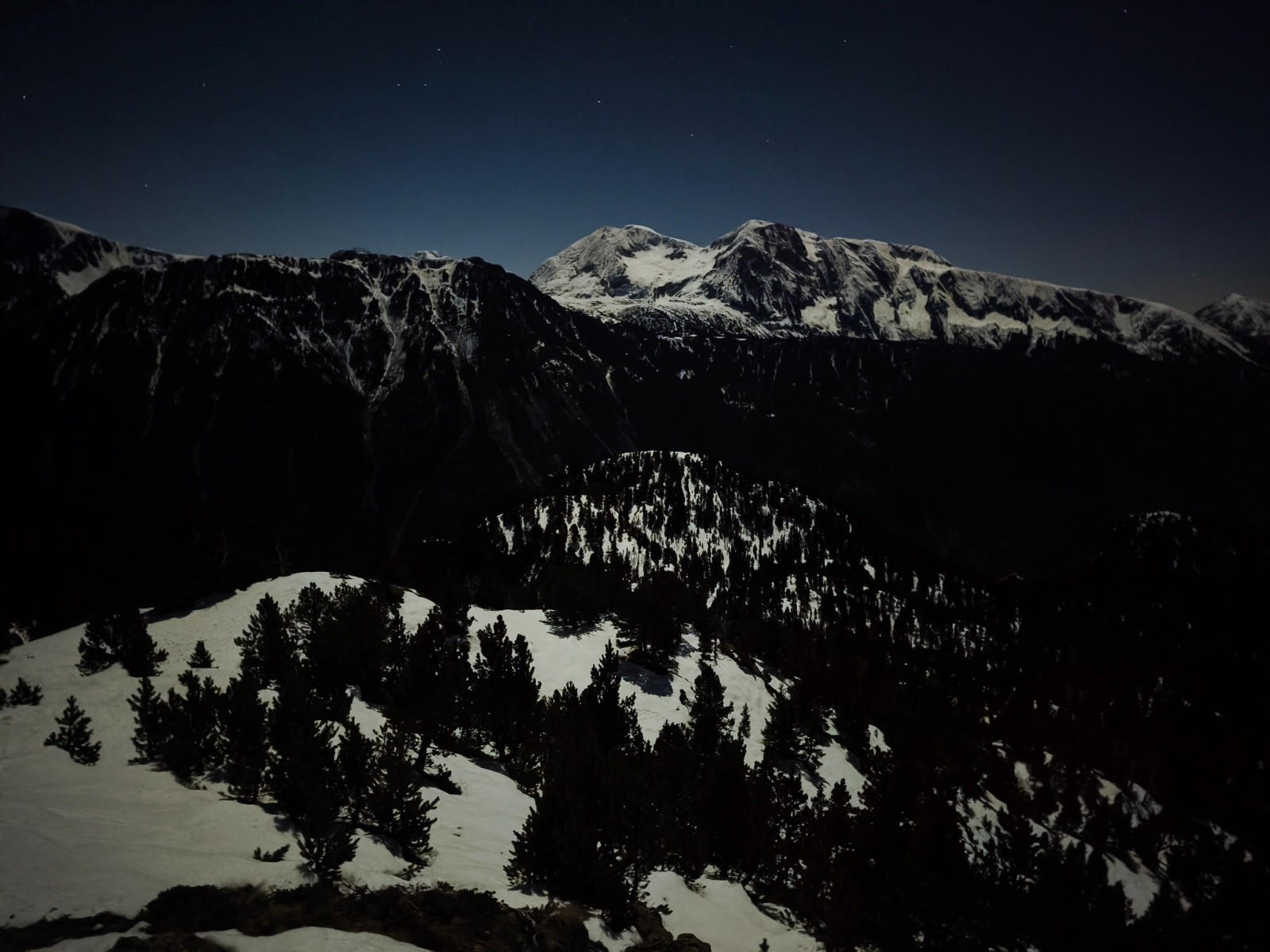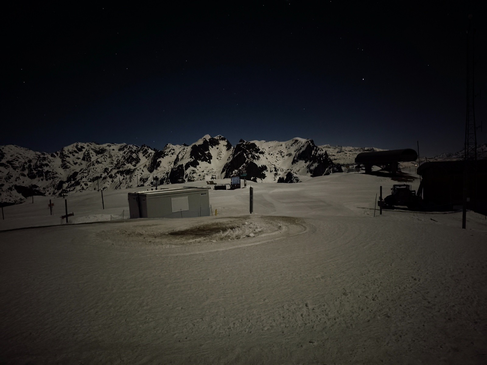 Donc petite remontée vers la voiture, puis prendre un peu d'élan car au fin fond de Roche-Bé, puis passage sur le snow park fermé donc libre de toute dameuse, puis croisé 2 randonneurs se faisant plaisir sur les pistes fraichement damé, plus de vent donc pas bien envie de m'arrêter car bien plus agréable et les dameuses qui laissait penser qu'elles allaient quitter le terrain. Donc initialement prévu pour m'arrêter une fois les dameuses en vue, puis sur le TSD de l'écrin ( tiens il a changé de nom celui là??? ) puis sur le bellevédère à la jonction avec les pistes en attendant que les dameuses redescendent, elles devaient partir sous 1/2 heure selon les webcams des jours précédents, donc autant attendre en profitant de la nuit étoilé et d'une lune grossissant. Prochaine étape le poste de secours, mais vu que les dameuses étaient bel et bien parti, autant monter à la Croix, car pas un vent sur les crêtes, le tour fût ainsi bouclé finalement même si ce n'était pas prévu, mais tellement bon qu'il aurait été dommage de s'arrêter avant le sommet.
