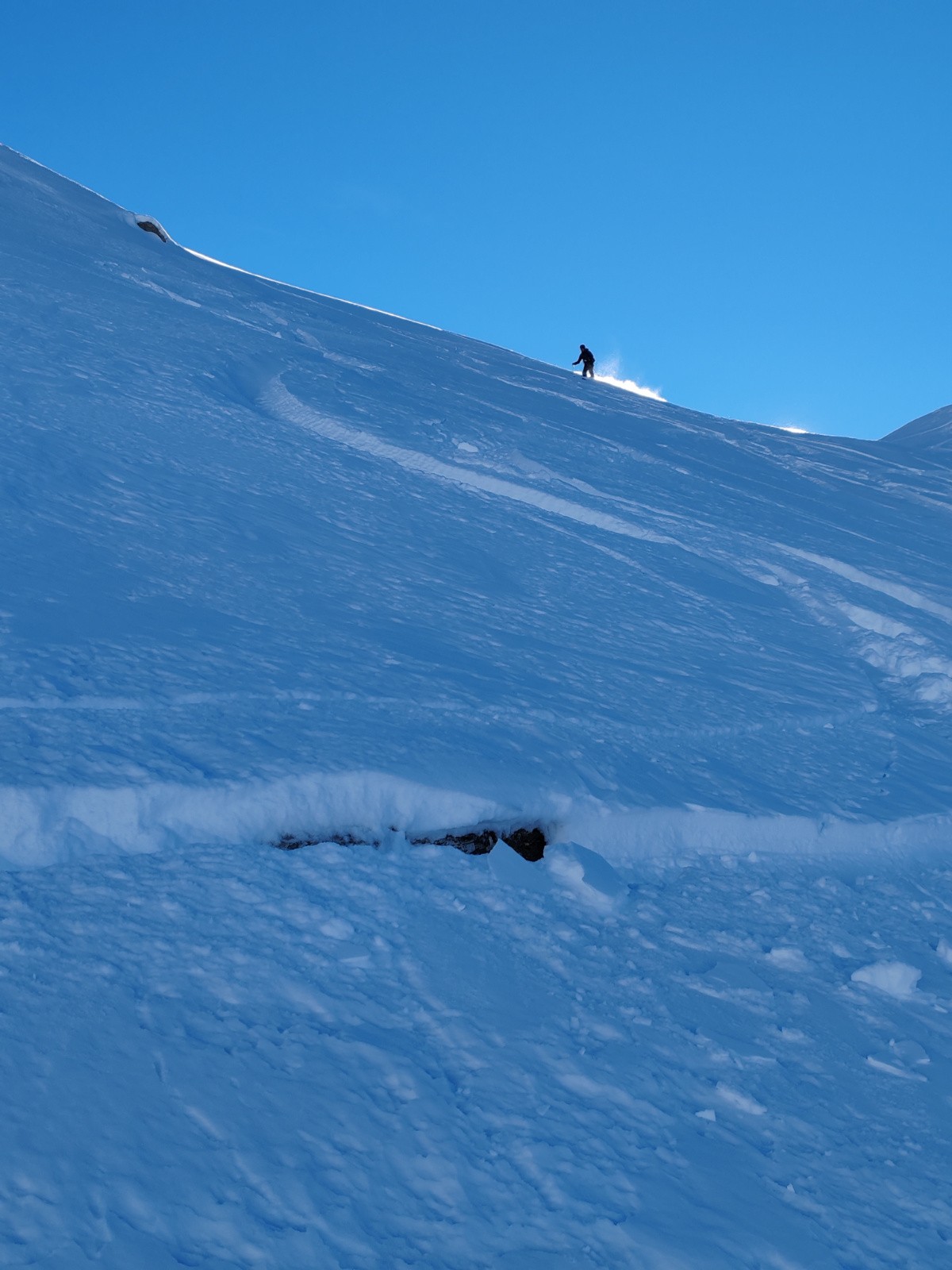 Conditions nivo et activité avalancheuse : RAS, poudre froide tombée sans vent fort, le risque demeure fort présent à cause des rochers sous-jacent...!