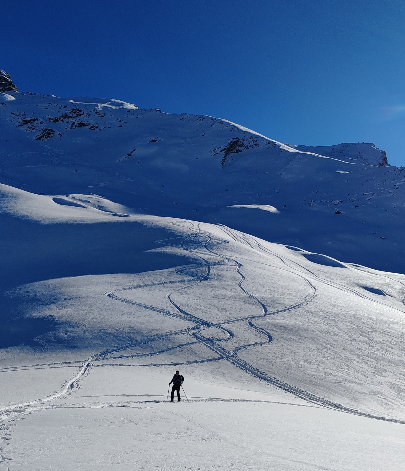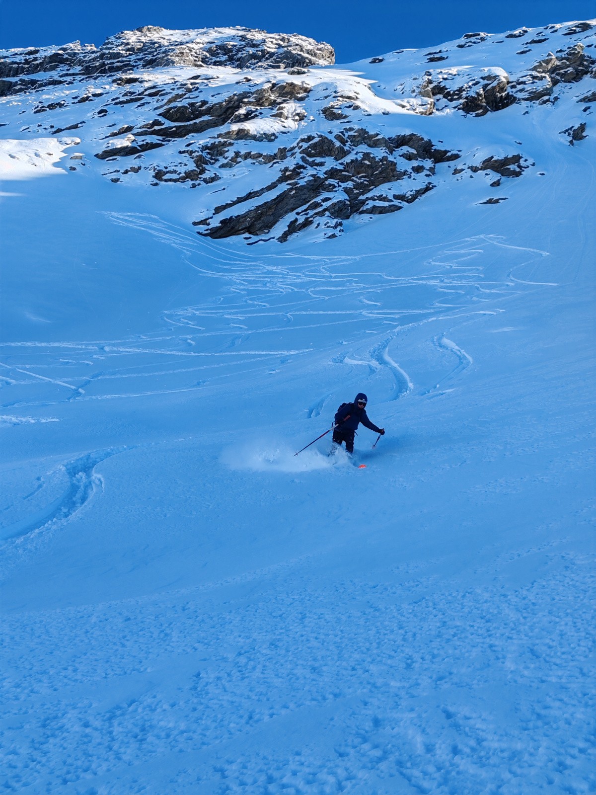 Conditions pour le ski :40cm de pow au départ, 1 m vers 2400m , 130 cm vers 2900, sans la moindre sous couche, c'est déroutant et dangereux.! Les boomers ont fait demi tour vers 2900m au dessus du col di Golien