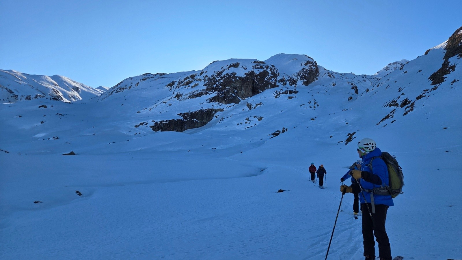 Conditions pour le ski : Pas si mal, malgré les conditions. Quelques très courts passages en poudre dans la cuvette de départ puis ça secoue , mais sans plus , c'est assez consistant et vue notre itinéraire nous étions plus en traversée , ensuite vers 2500 m on retrouve de court passage en poudre polystyrène. Ensuite piste de ski assez dur sous 2000 m.