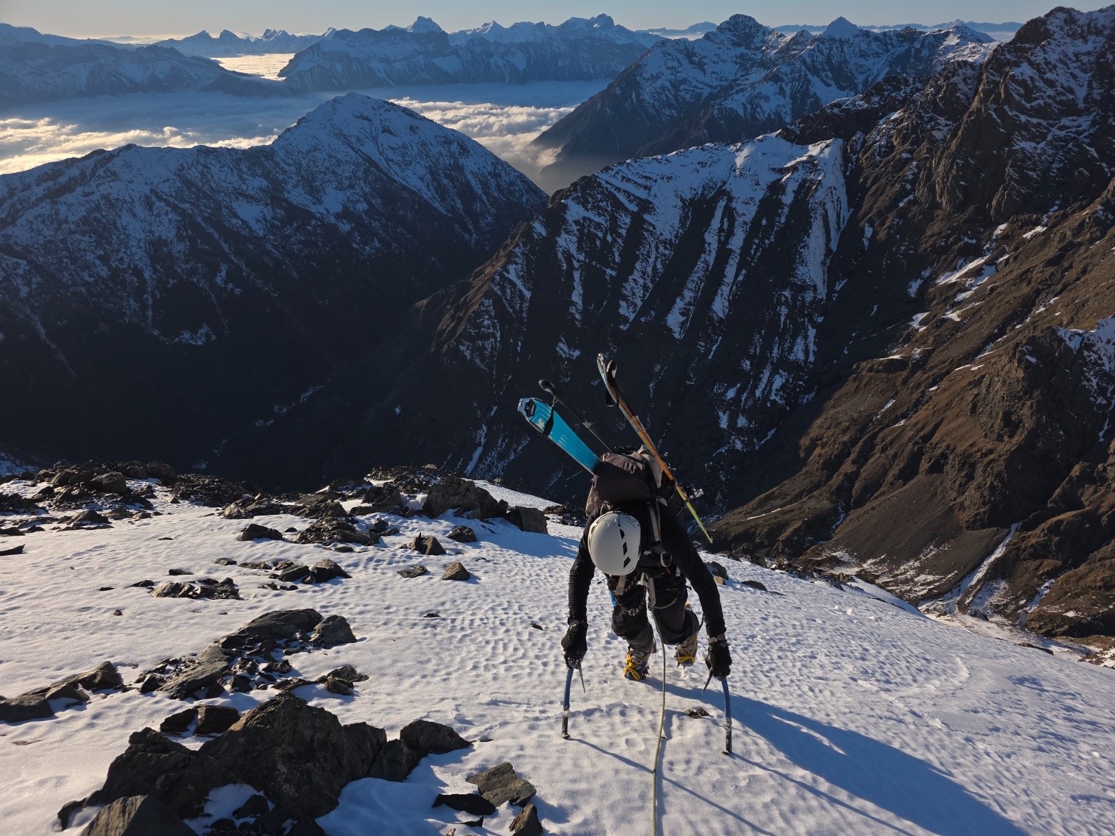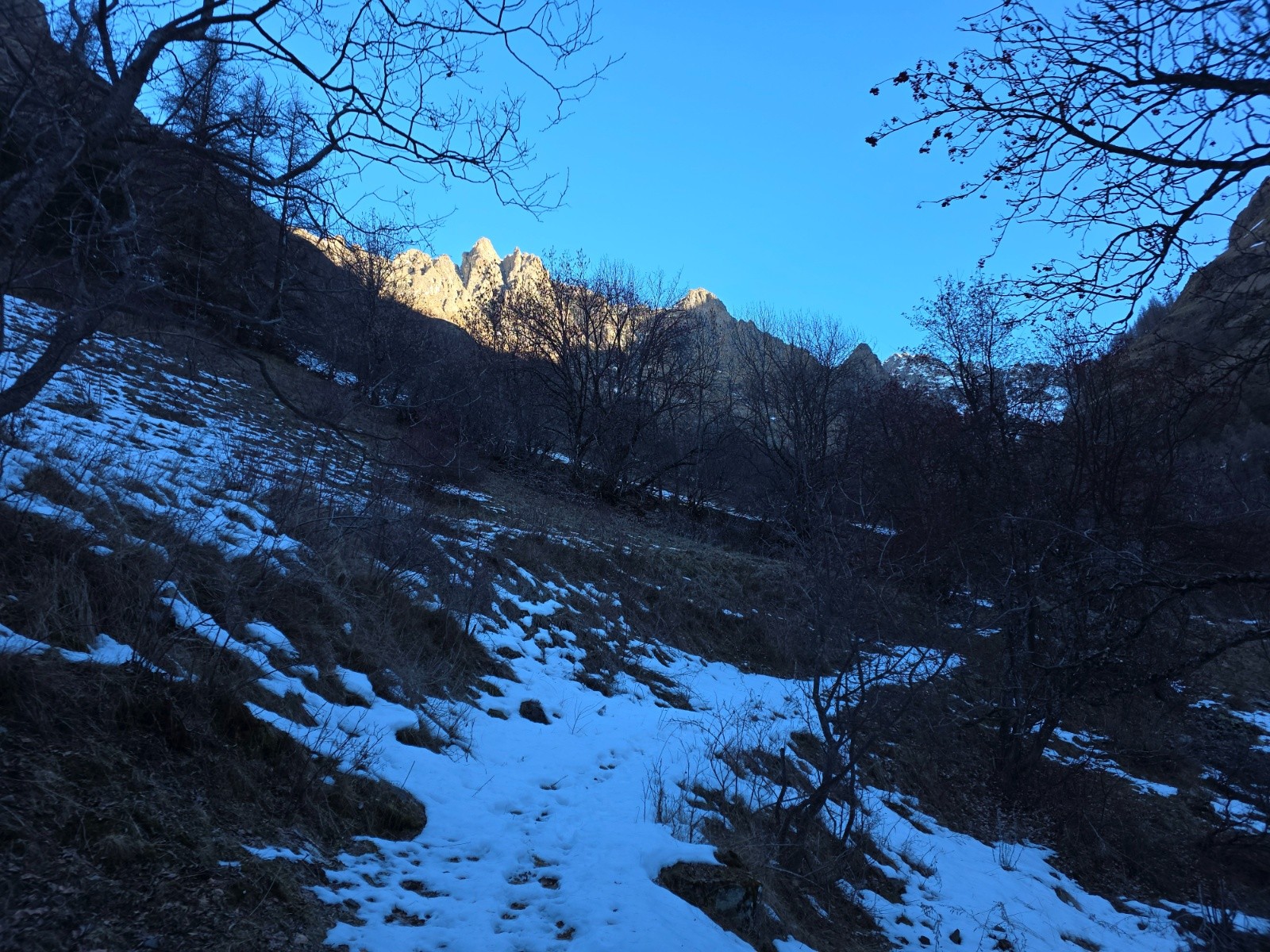 Horaires : tres lent départ 8h, remontée à pied en basket jusqu'à la cabane jas de jartier. Entrée du couloir 10h30 pauvre en neige quelques petits ressauts en glace plutot cools à grimper. Des restes de cascades en passant mais glace decollée pas engageante à grimper. Premier tiers à l'arbre 12h (alti 2100m), neige tantôt portante dans les traces des chamois nombreux tantôt brassage dans du gobelet 30cm. On retrouve cette neige changeante entrecoupée de passages rocheux affleurant et rhododendrons pour la grande traversée a gauche. Petit collet 2350m à 13h15. Traversée encore à gauche pour poursuivre l'itinéraire. Mais gros brassage donc on s'échappe plus tôt sur l'arête 2550m que l'on remonte. Passage au sud sans neige ret remontée dans des gradins plutôt facile. Retour sur la neige 2700m 14h45. Pause rapide puis pousuite de la traversée à gauche, à nouveau, pour chercher les zones moins raides. Belle ambiance dans cette traversée au dessus des barres. Notre progression est lente avec cette neige toujours changeante en mode 2 pas en avant 1 en arrière. Cela nous amène à traverser à droite cette fois ci et voir gentiment mais sûrement le soleil se coucher 2900m pour sortir de la face tout droit au soleil couchant. Début descente 18h30, belle lumière avec le premier quartier de la lune et la frontale. On cherche plus l'efficacité que le grand ski. Ca tombe bien, le regel est fort et la section de neige dure et lisse s'enchainent plutôt bien. Ski jusqu'à la cabane du vaccivier puis fallait pas louper le sentier. Descente jusqu'à 1600m. Fin bien longue à pied avec objectif gestion de la fatigue de mon second. Voiture à 23h. Bien longue sortie comme on les aime dans les ecrins.