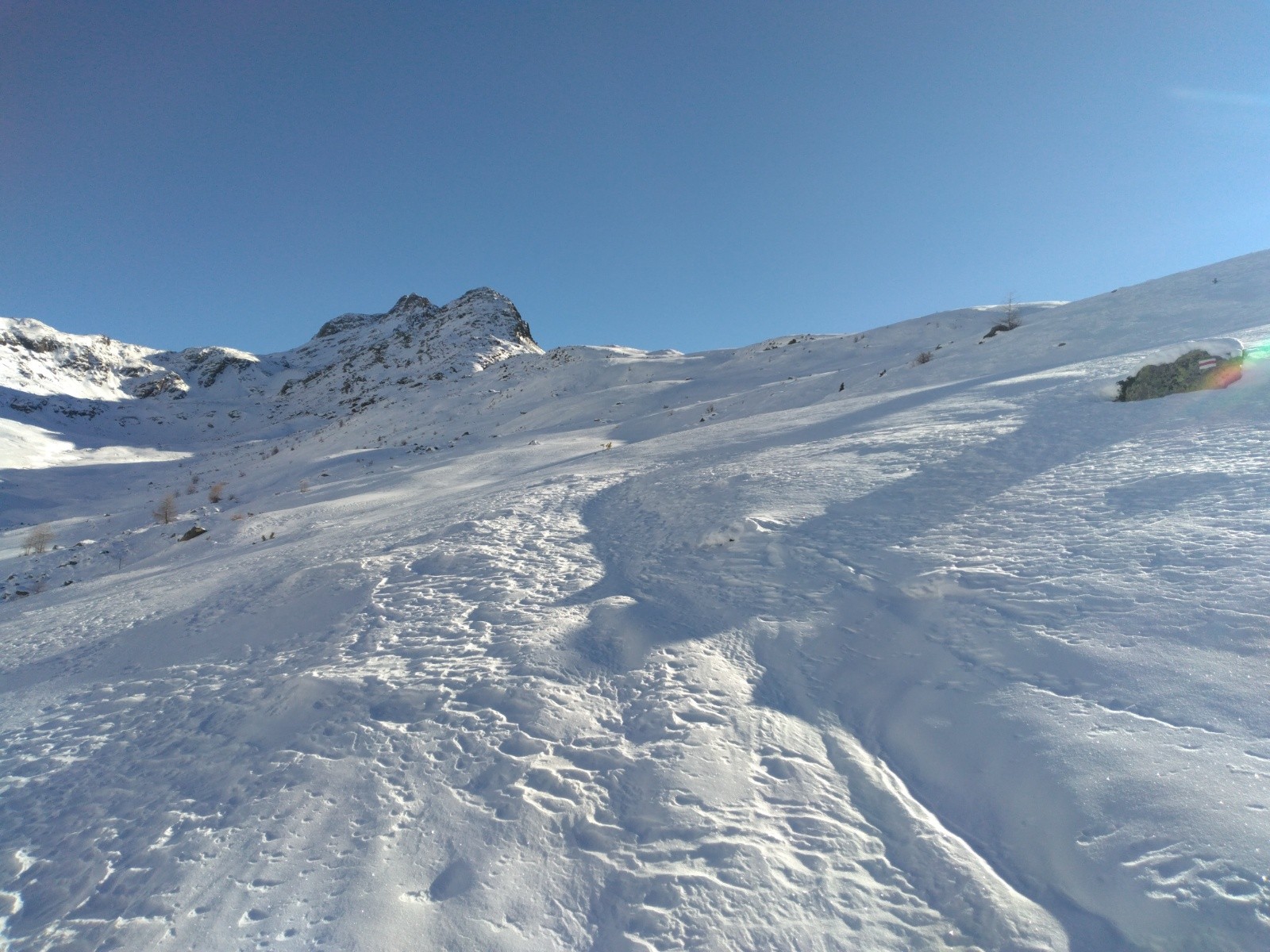 Conditions pour le ski : sur la crête, de Paradis à l'entrée de la forêt, alternance de frisette et de carton, plaisante en visant bien ; dans le mélézin - pinusin : poudre préservée du vent, légèrement lourde, très ludique ❄️; de l'Alp Languard à la piste : traffolée partiellement regelée, minée de cailloux, descente piano-piano mais bon exercice technique 😄