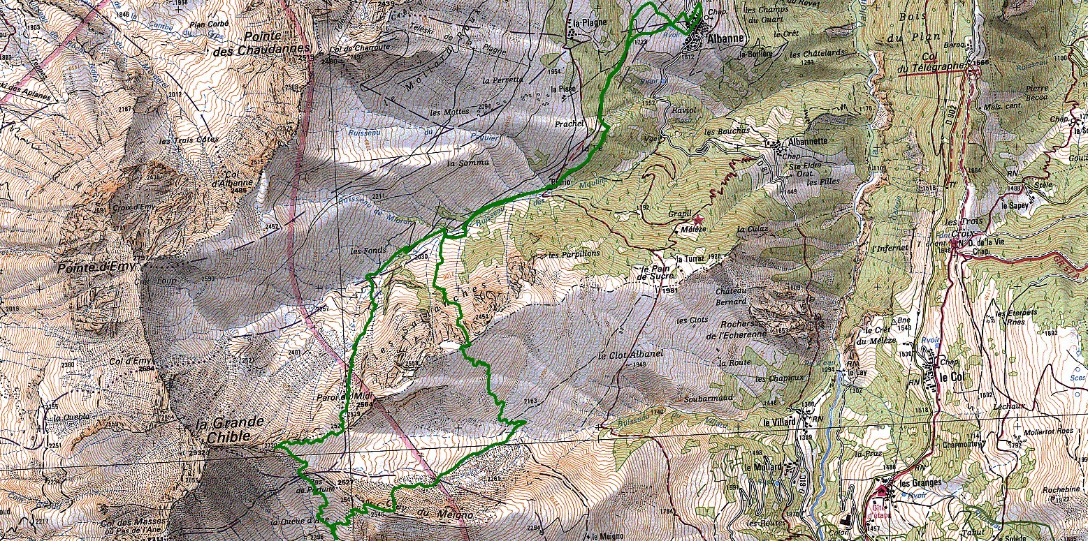 Itinéraire suivi : Albanne->Paroi du Midi -> Antécime de la Grande Chible 2720 -> Pas de Pertuité -> Queue d'Ane-> Crey du Meigno (Sud->Nord)-> couloir de Sallanches en boucle sous la pointe 2454m