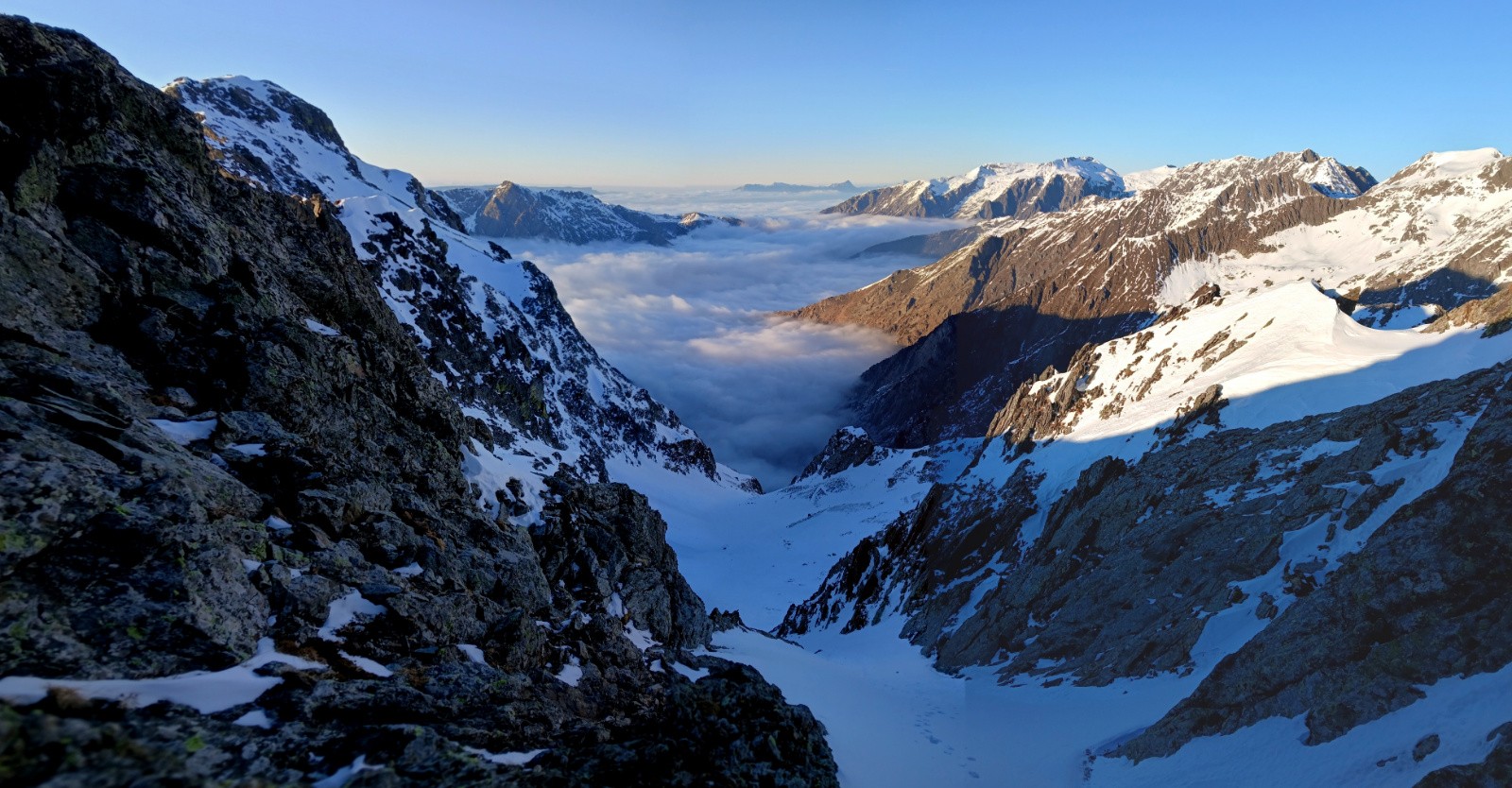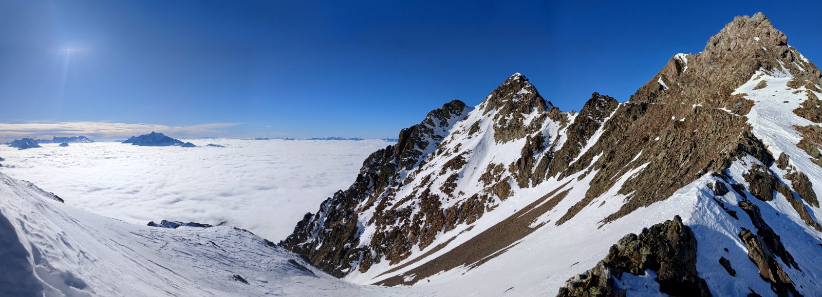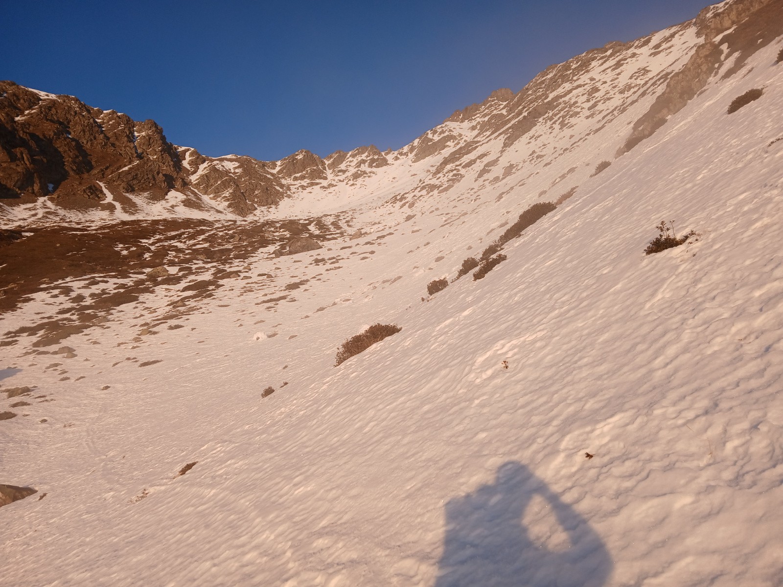 Conditions pour le ski : ski “Parkinson”, c’est dur partout, sauf dans le haut du couloir qui est en poudre tassée. Il y a deux ressauts en glace dans le couloir : le premier se contourne très bien par la droite, le second se fait par une désescalade de 2 m. J’aurais apprécié un piolet et des crampons en acier.