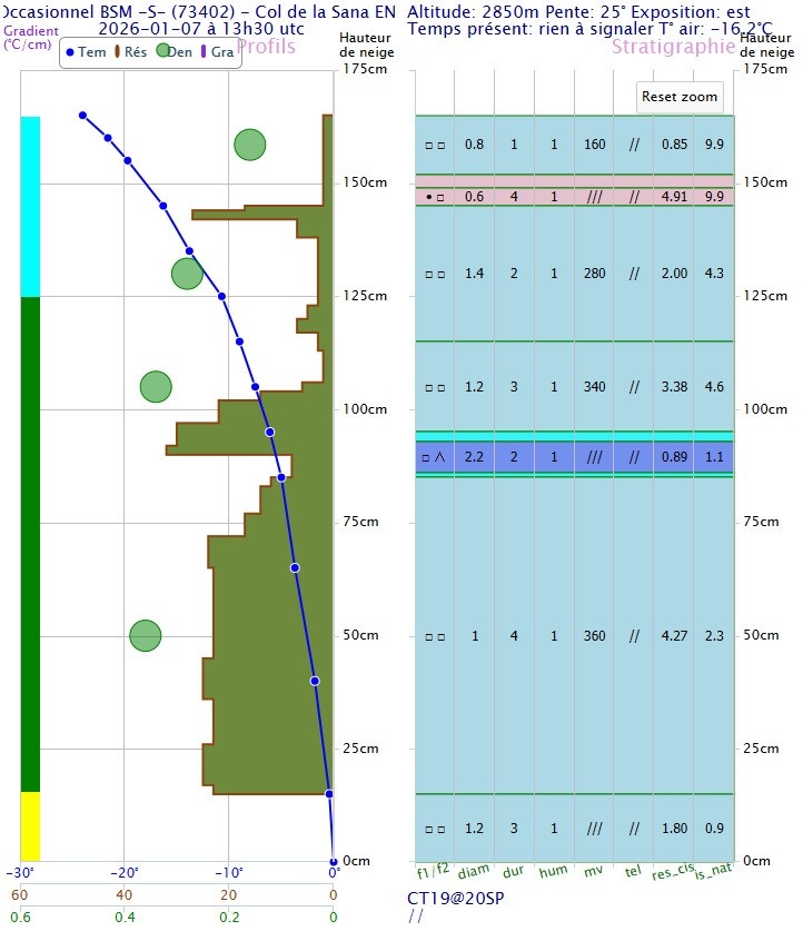 Historique du manteau : dans le secteur, il n'a pas neigé depuis 4 semaines (dernière vraie perturbation -> début décembre). Le blocage anticyclonique a permis au manteau, alors peu épais en ce début de saison, de vivre des nuits claires, sèches, et particulièrement froides, notamment cette dernière semaine. La surface du manteau dans les pentes ombragées d'altitude atteint -25 °C pour des températures de l'air comprises entre -15 et -20 °C. Dans ces conditions, les métamorphoses de fort gradient ont tourné à plein régime. Résultat, le manteau héberge de grandes quantités de grains anguleux bien formés, allant de la grosse face plane au gobelet. Rares sont les pentes abritées des vents, en vieille poudreuse (neige meuble en face plane) car les épisodes récents de vent (Foehn/Lombarde à répétition puis Nord Ouest) ont largement transporté la neige de surface. Ces épisodes de transport ont donné lieu à de nombreuses avalanches, naturelles et accidentelles. Actuellement, la majorité des vallons est en neige dure ou cartonnée. Des nombreuses pentes sont hachurées par les anciennes traces de ski désormais en relief (seule la neige compactée par les skis a résisté aux vents forts). Sauf que dans ces pentes dîtes froides (Ouest à Est en passant par le Nord à cette période de l'année), les grains anguleux sont faiblement enfouies. Parfois, ils sont même simplement sous les 10 cm de neige dure.
