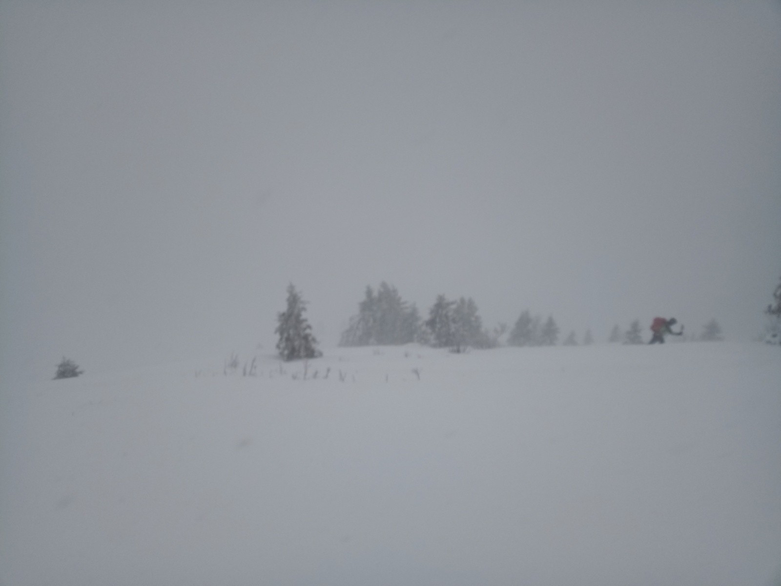 Enfin ça dure un temps car encore plus haut le vent nous reprend. Il neige assez fort. Les conversions vers l'ouest sont plutôt désagréables. Le haut de la prairie n'est plus très loin, on atteint la première petite barre. L'habituelle accu est bien là, j'arrive pas à la passer à ski. Emeric s'y colle sans plus de succès. On remonte à pied c'est facile outre le vent qui nous malmène mais c'est sans doute l'effet venturi entre ces petites barres.