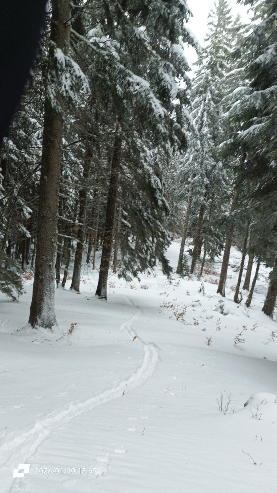 On a le temps d'admirer le monde qui monte à Pravouta, on est mieux en face. Descente franchement top jusqu'en bas de la clairière en N. Super poudre. Ensuite c'est un peu encombré en arbustes, on a peut être pas géré au mieux les trouées pour cette fois. Sous 1400m, faut gérer au milieu des branches et arbres au sols, on est content de retrouver la piste. Stop à 1230m, c'est l'heure de remonter si on veut finir de jour.