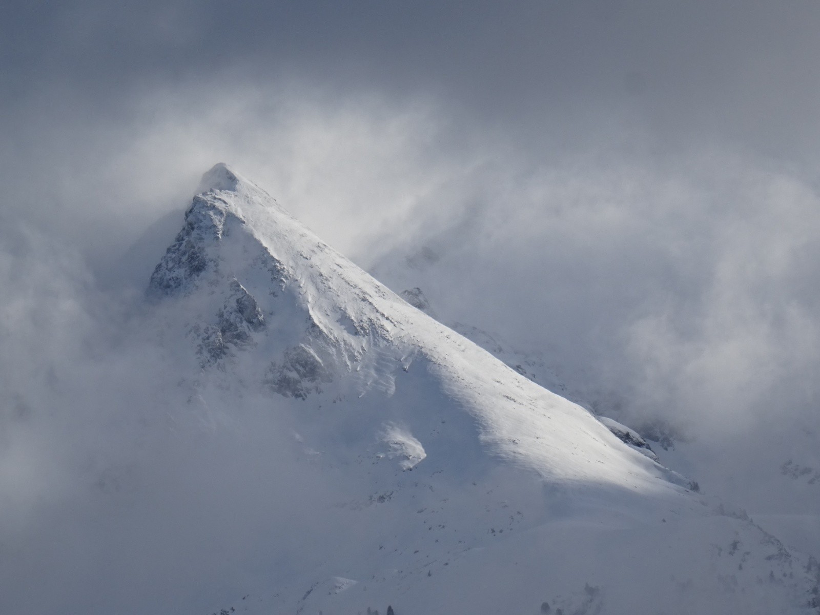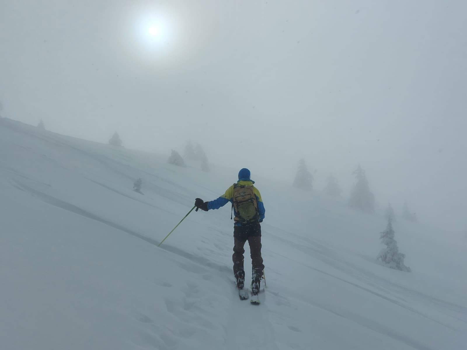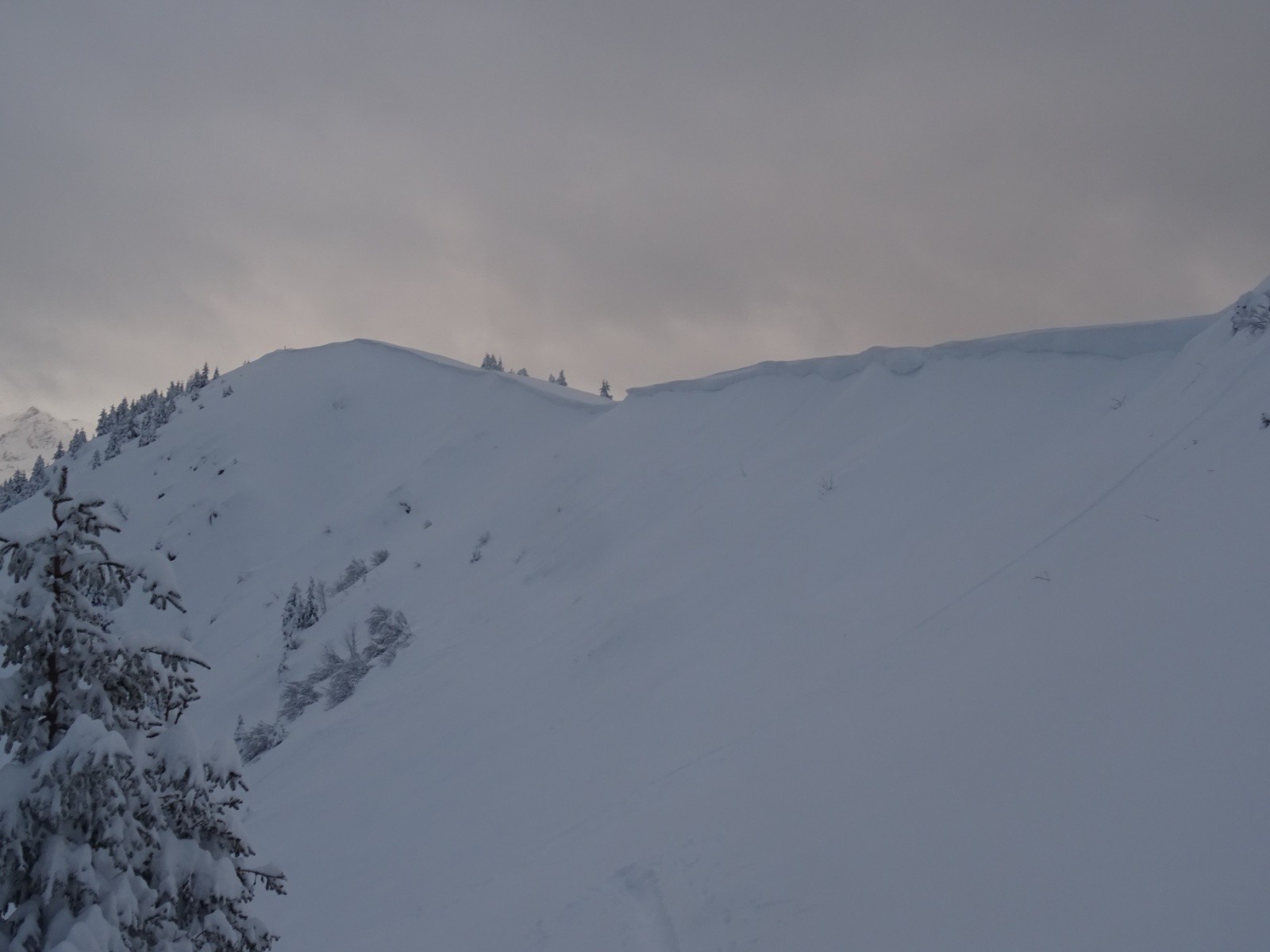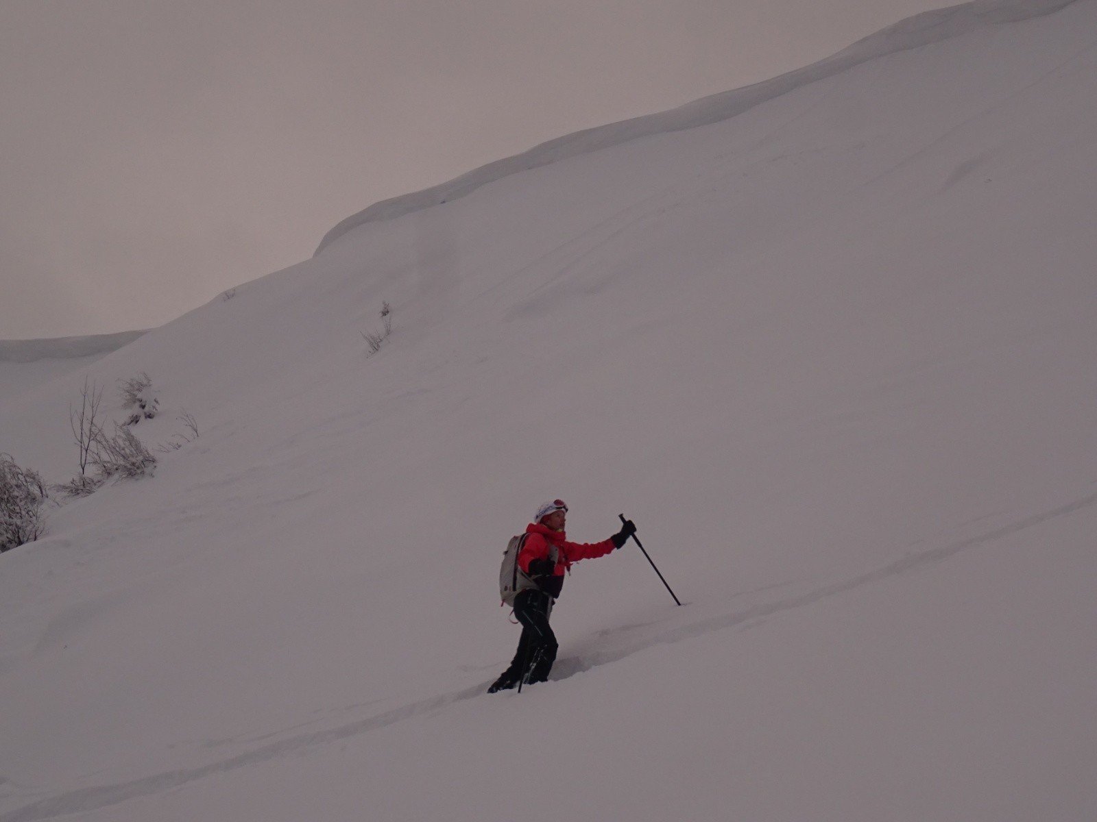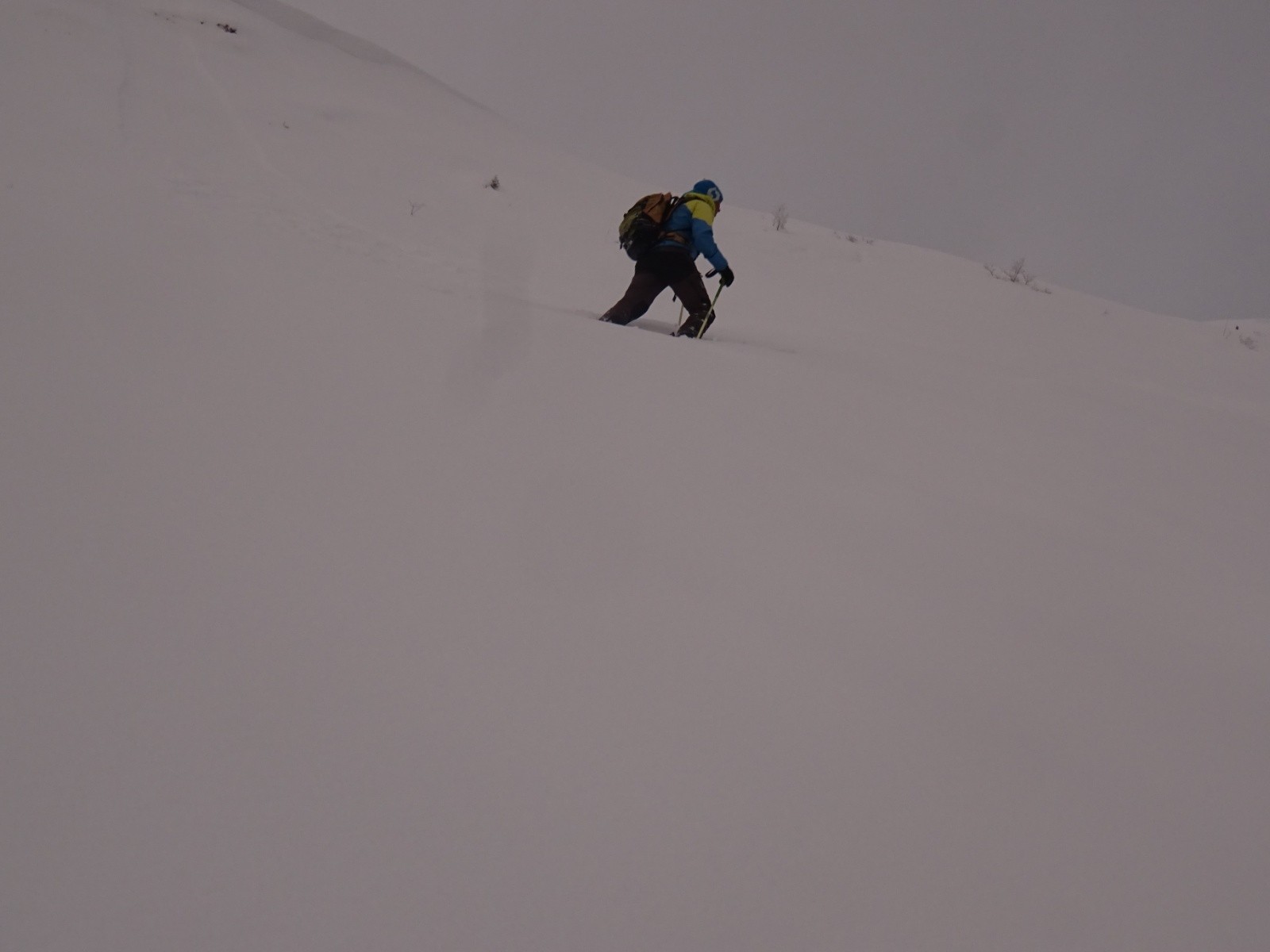 Conditions nivo et activité avalancheuse : ça semblait bien stable pour un risque 4, quelques 'sluffs' en zone plus pentue sous les skis (nous sommes restés prudents dans le choix des pentes/passages), 2 récentes petites 'coulures de surface' aperçues en remontant de la combe Est en zone plus pentue, et quelques menues cassures de surface (20cm d'épaisseur, <1m2) dans les conversions en remontant aussi de la combe Est