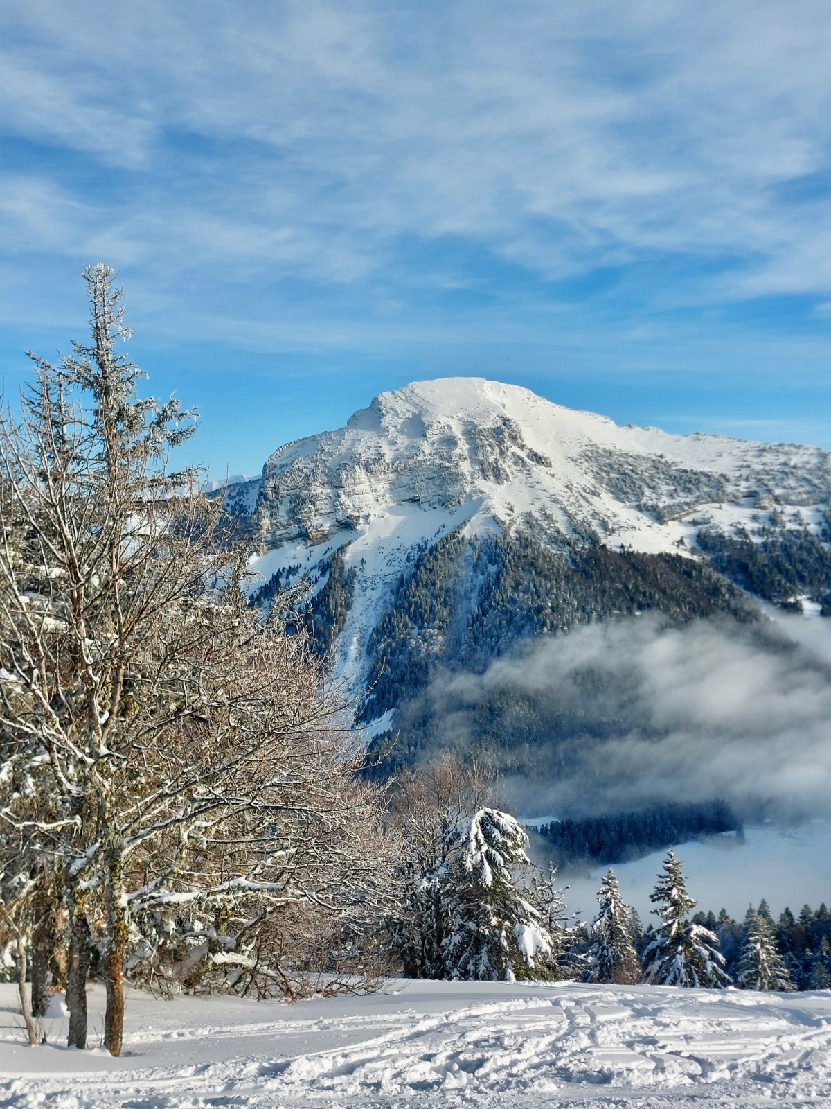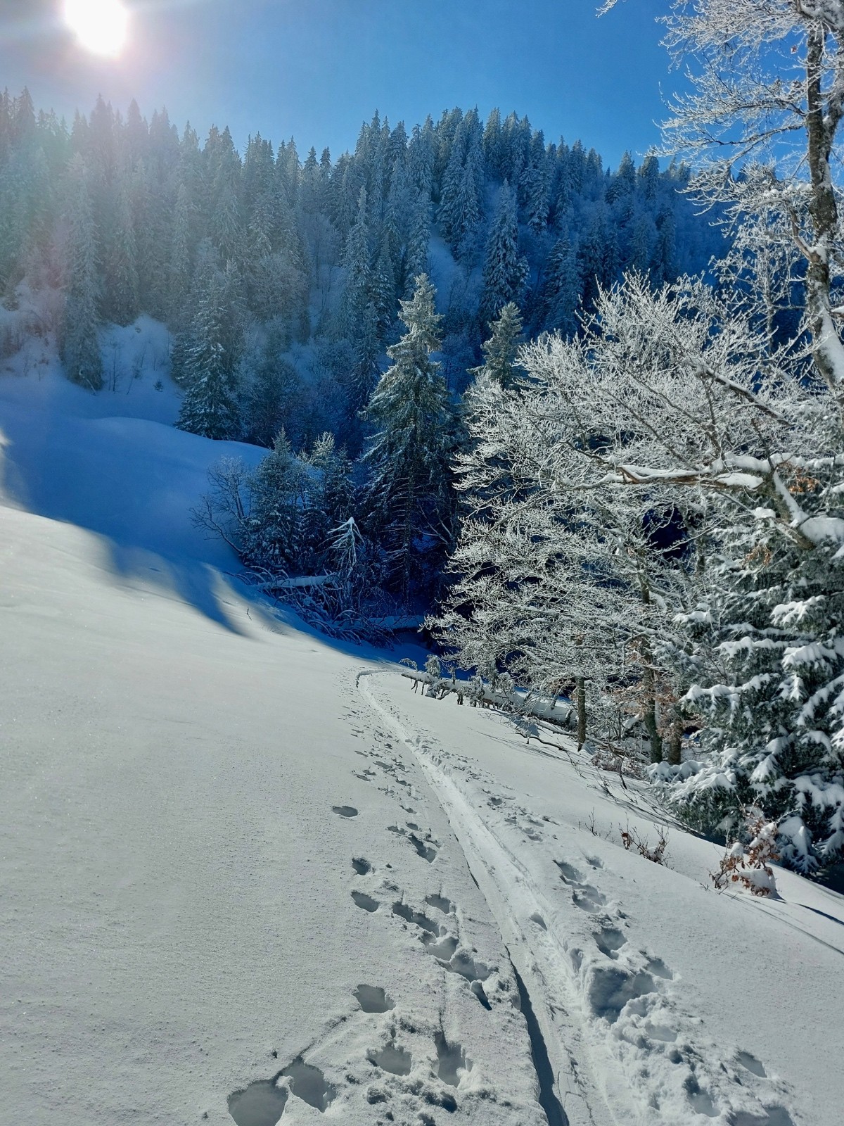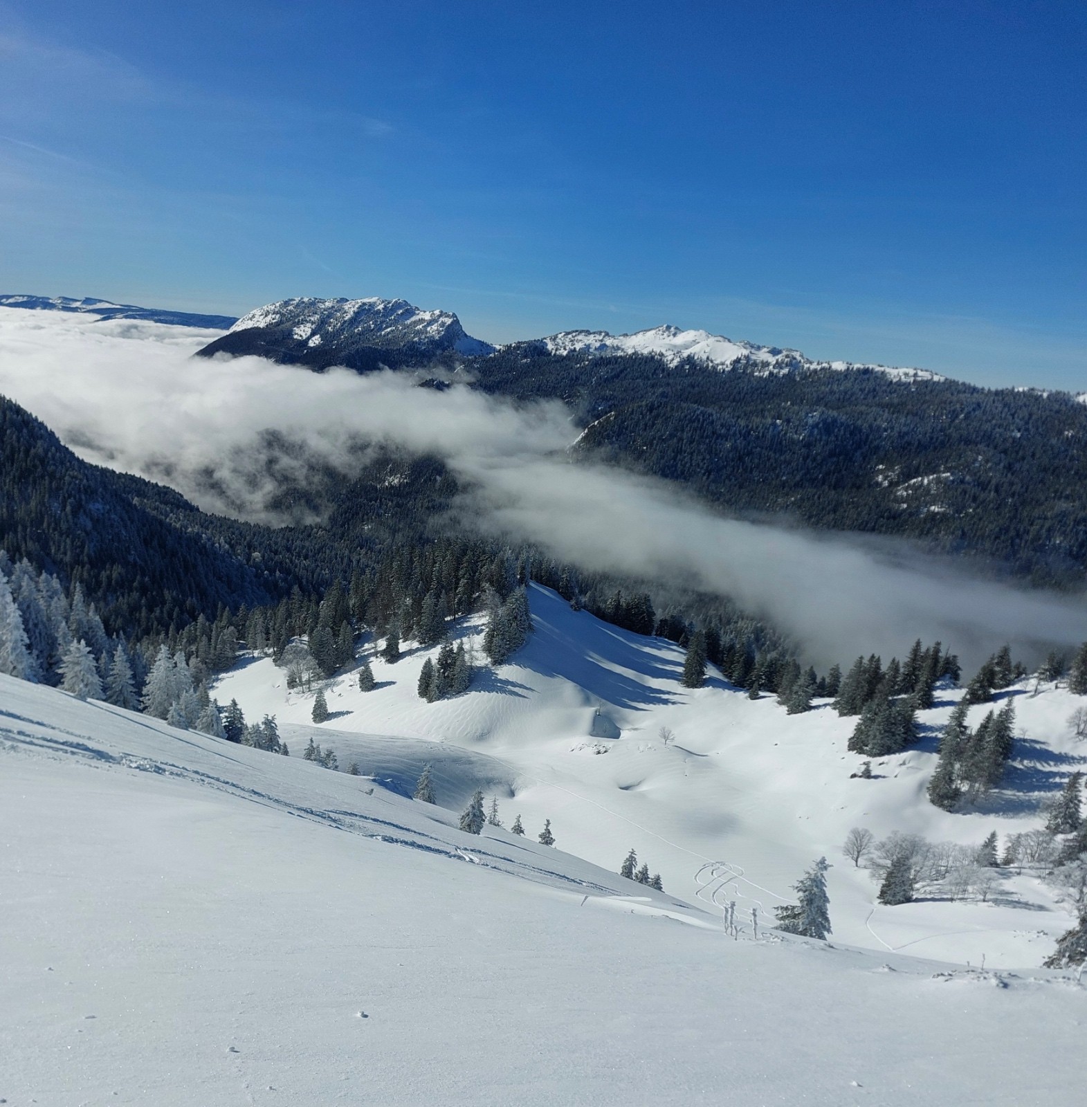 Conditions pour le ski : très bonne.50cm de neige bien conservée par le froid en toute altitude et versants .Bon grip a la montée dans les traces déjà faites ce qui limite la dépenses énergétique.Descente dans de la neige parfaite , déjà bien exploitée sous le charmant som mais encore vierge dans la foret