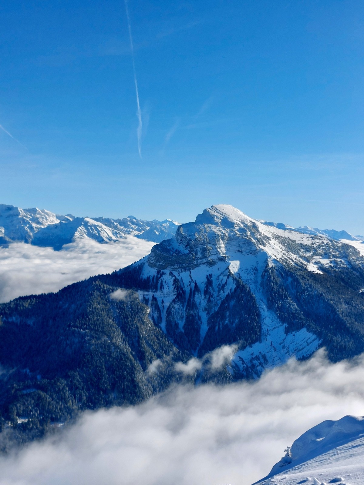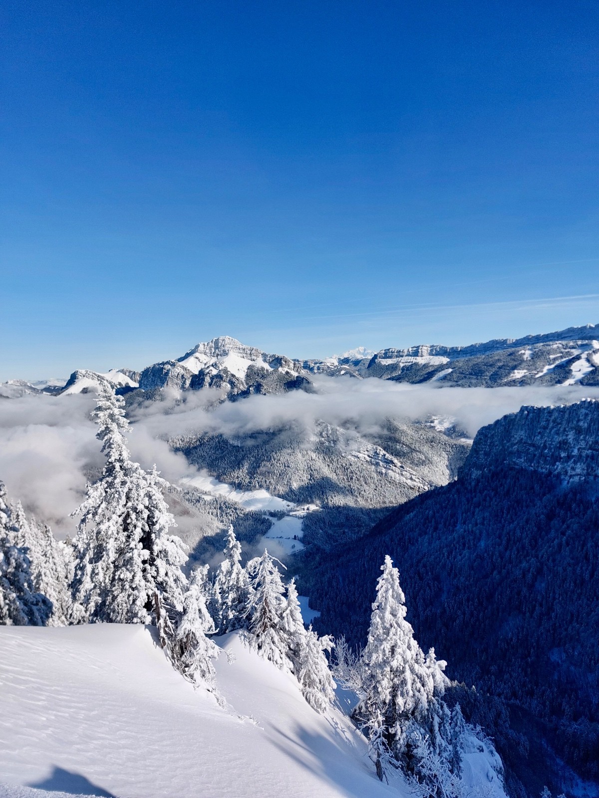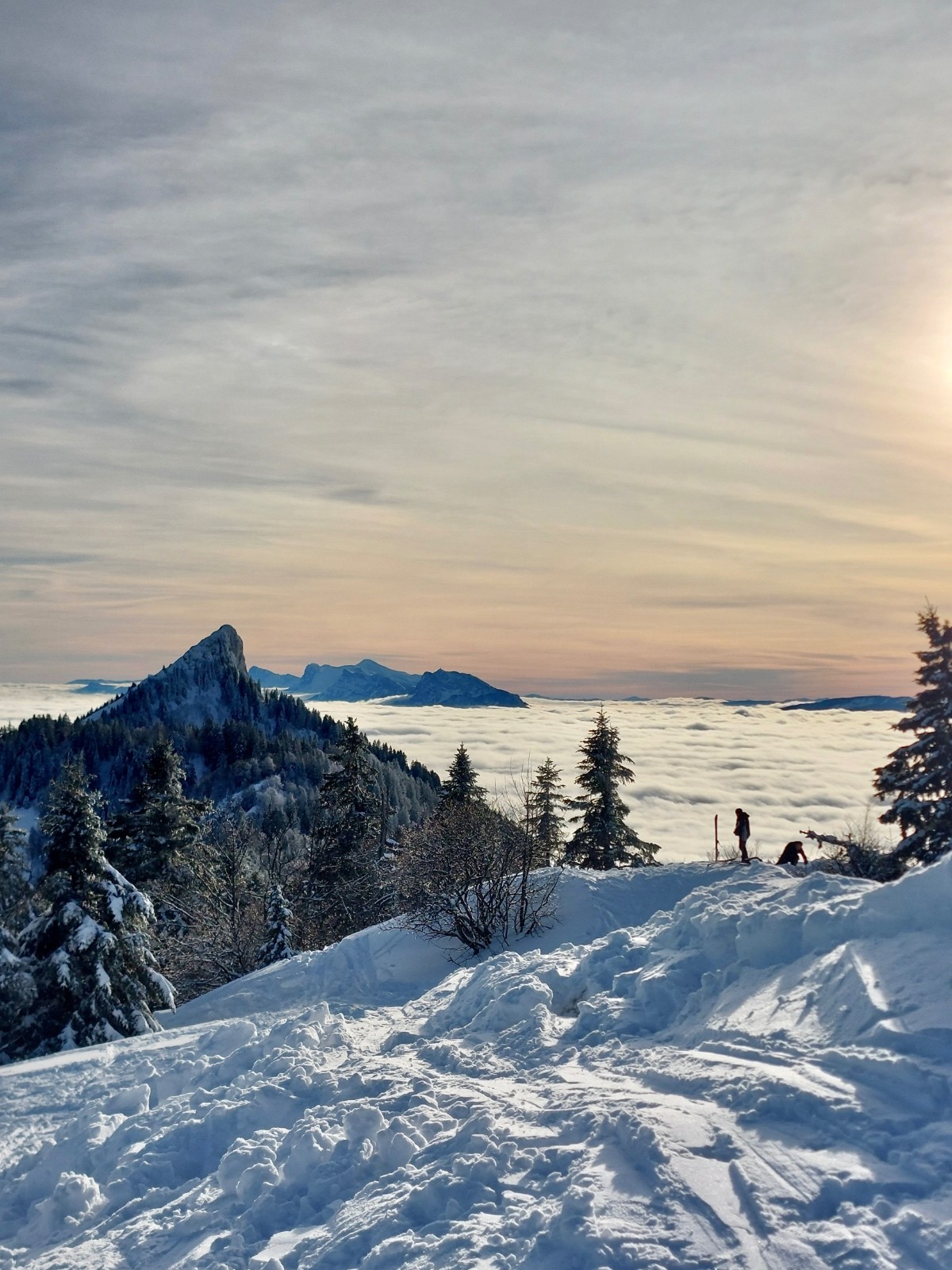Conditions pour le ski : très bonne.50cm de neige bien conservée par le froid en toute altitude et versants .Bon grip a la montée dans les traces déjà faites ce qui limite la dépenses énergétique.Descente dans de la neige parfaite , déjà bien exploitée sous le charmant som mais encore vierge dans la foret