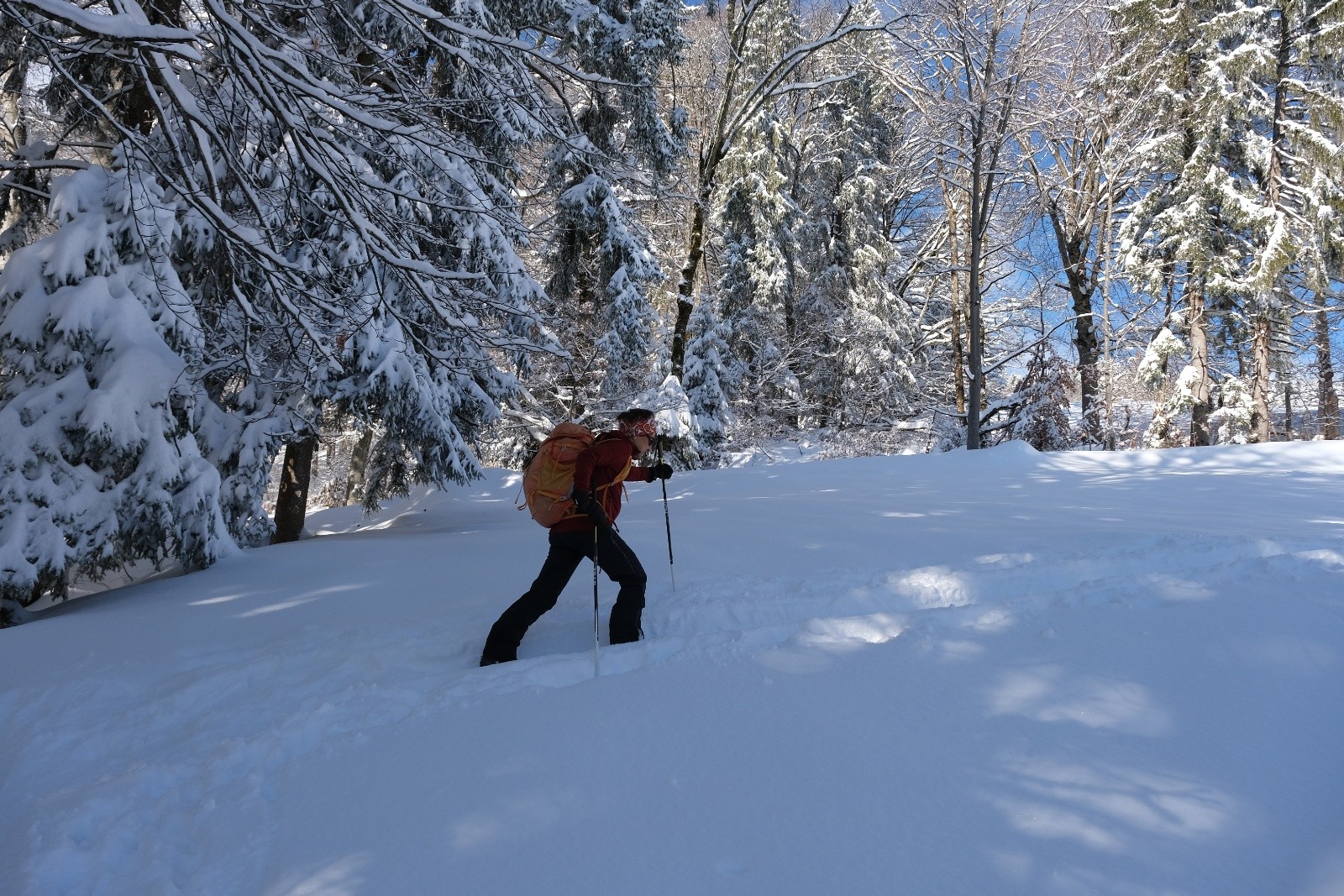 Sous le Rafort (1200 m) orientation sud-est: la neige est déjà bien lourde et collante. Nombreuses traces
