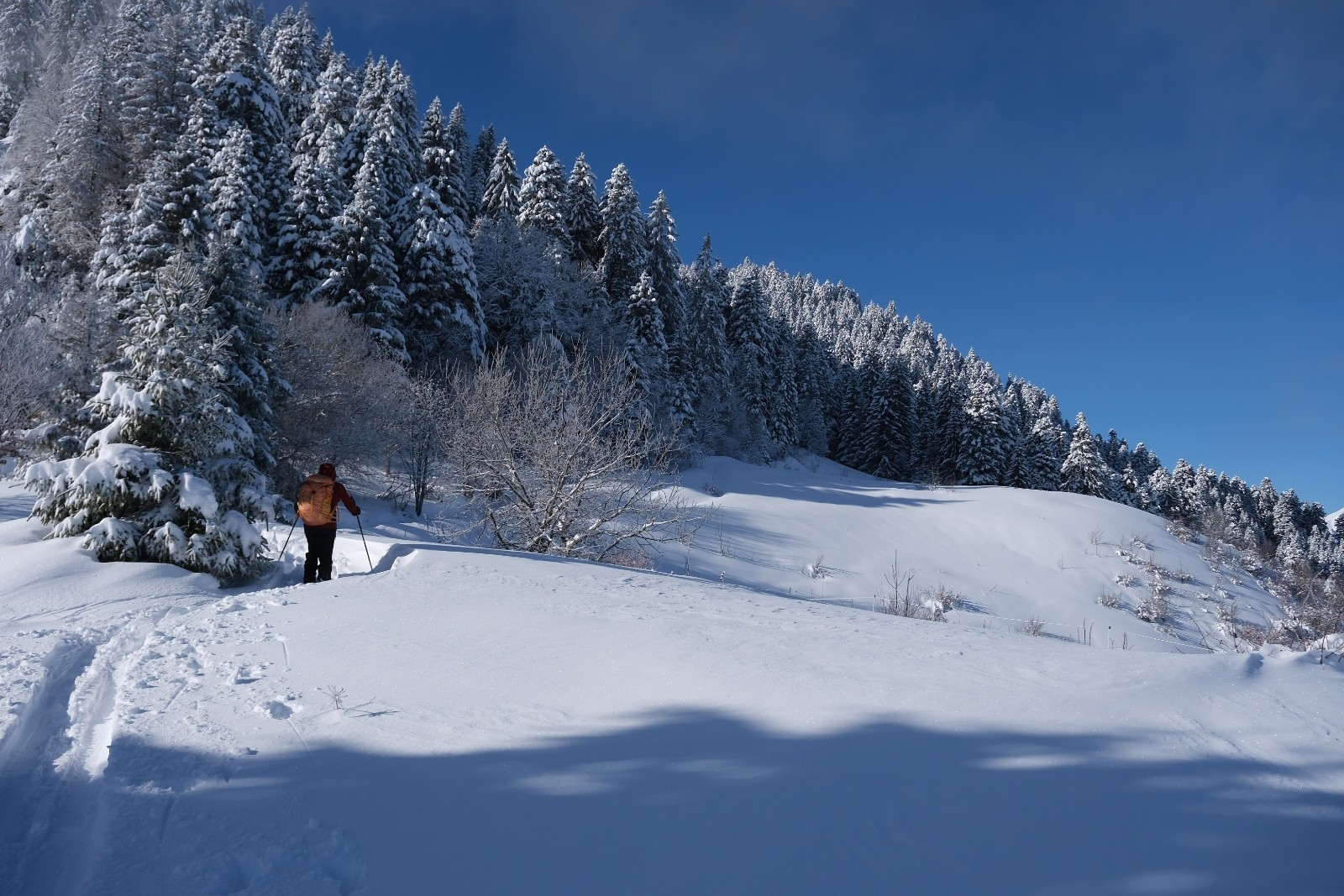Sous l'Alpettaz (1400 m) orientation sud, essentiellement ombragée. Border cross tous types de neige. En partie damé par les passages.