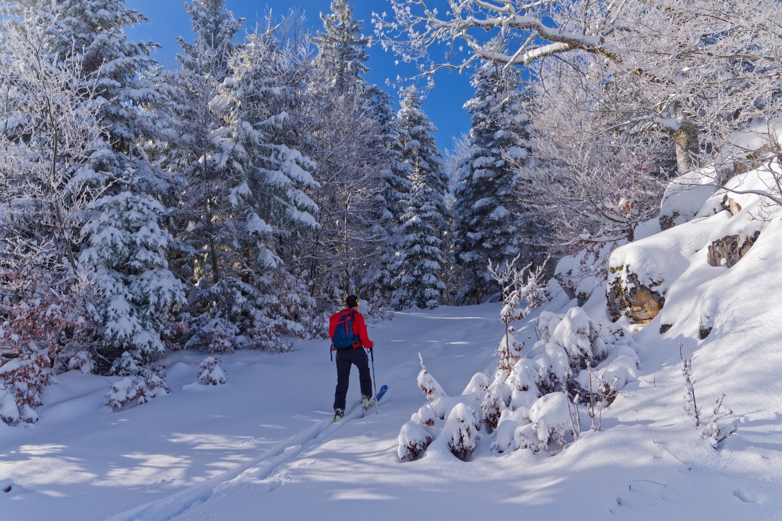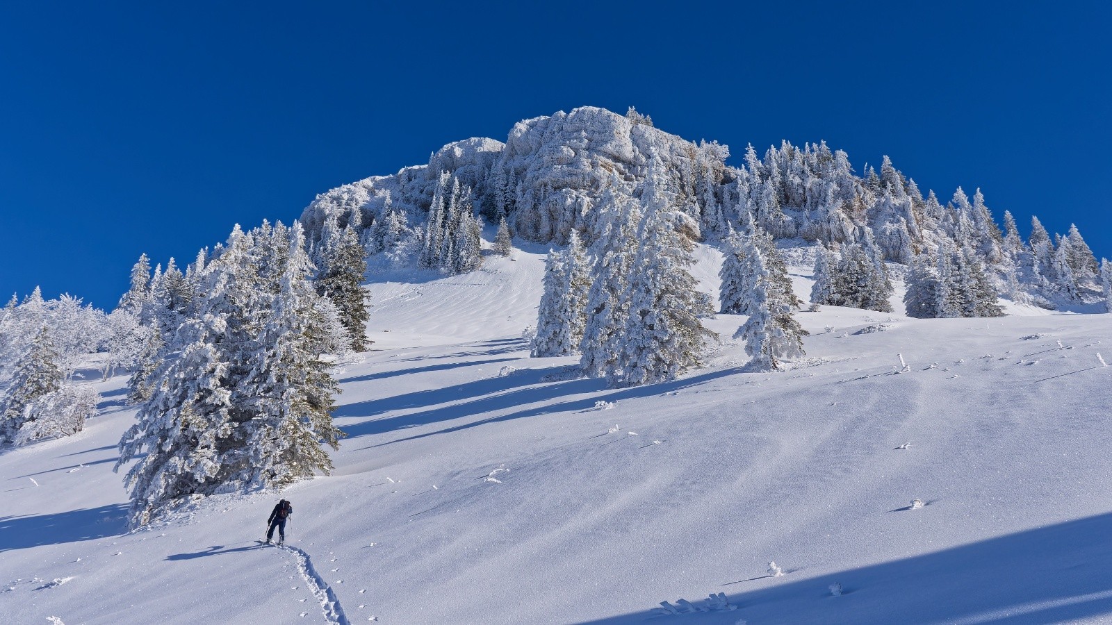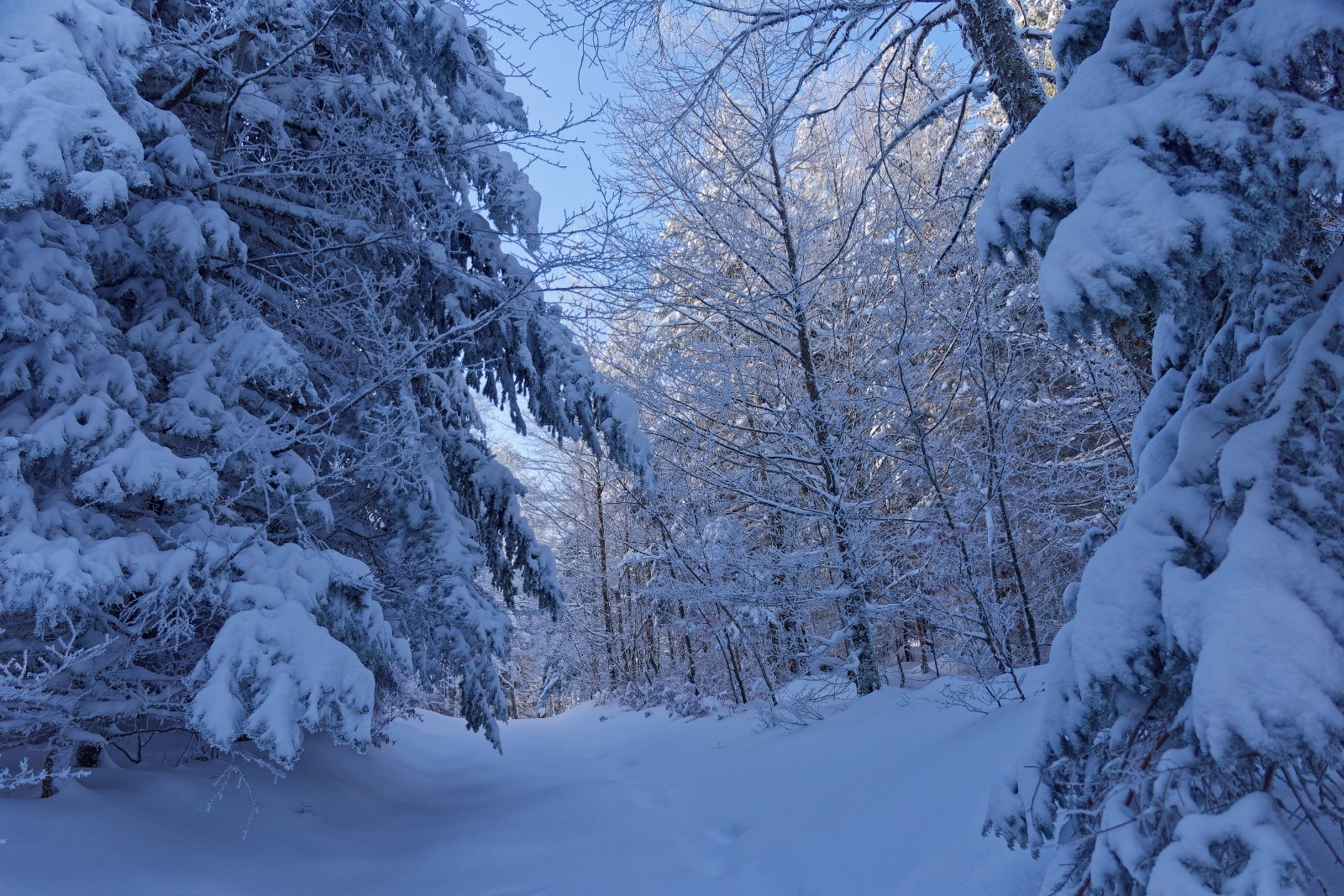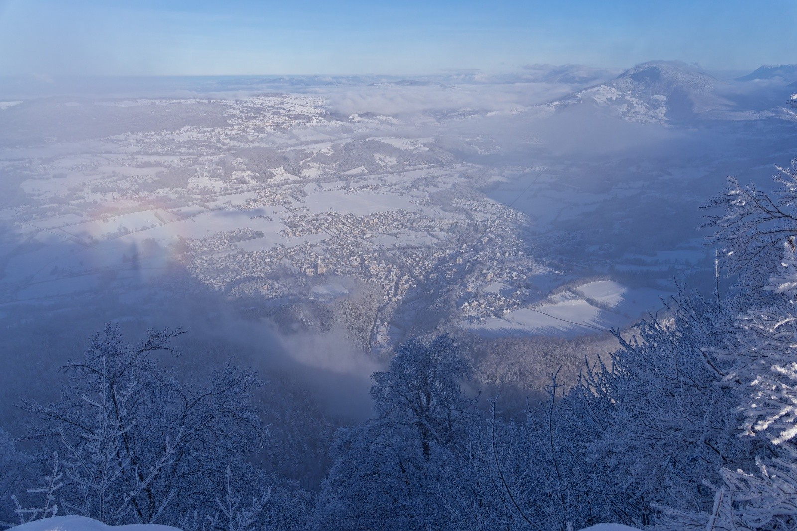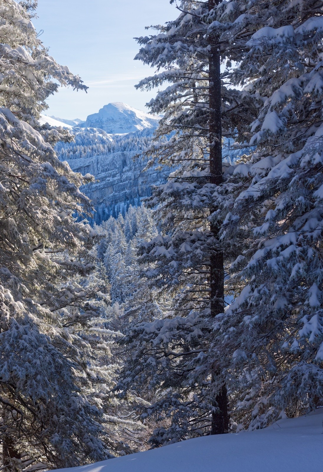 "Tu crois qu'il y aura assez de neige au départ ?" Par deux fois j'ai répondu à cette question par un haussement d'épaules, s'il faut porter quelque peu ce n'est pas un bien grand prix à payer... J'aurais plutôt dû me poser la question inverse ! Partis dès potron-minet, à 7h45, nous faisons la grimace en voyant la route d'accès à Curière, qui part raide, couverte de 10-15 cm alors que son départ n'est qu'à 425 m ! Sagement nous rebroussons chemin pour garer la voiture à S-Laurent-du-Pont, qui est un départ peu commun. A peine chaussons-nous sur la route de la chartreuse, que voici les déneigeurs qui arrivent et, après un ballet de quatre passages, nous mettent la route au noir ! Nous voilà bons pour marcher, mais dans ces forêts enneigés ce n'est pas un bien grand supplice. Nous rejoignons le parking de la chartreuse en même temps que les premières voitures et allongeons la foulée pour garder un peu de tranquillité. La route du belvédère est vite avalée, puis nous attaquons la traçage de la forêt raide, qui me donne du fil à retordre et permet au groupe suivant de faire la jonction. Nous abordons les rochers sous la crête avec circonspection car nous savons l'itinéraire peu évident. Et de fait, tandis qu'un courageux part explorer ma fausse piste d'il y a quelques années dans un raide entonnoir d'herbe gelée qui ne permet le passage que d'un sanglier, j'aperçois à gauche sous la branche d'un sapin un replat ascendant bien caché qui se révèle être le sentier, bien tracé par Arnaud. La crête des Charmilles est un enchantement à parcourir, les panoramas se découvrent et la Grande Sure étincelle dans sa carapace blanche. Après une descente sous le couvert de la forêt, remontée à la Petite Vache, et descente par un pas de la Biche bien rempli et une forêt comme on en voudrait tous les jours !