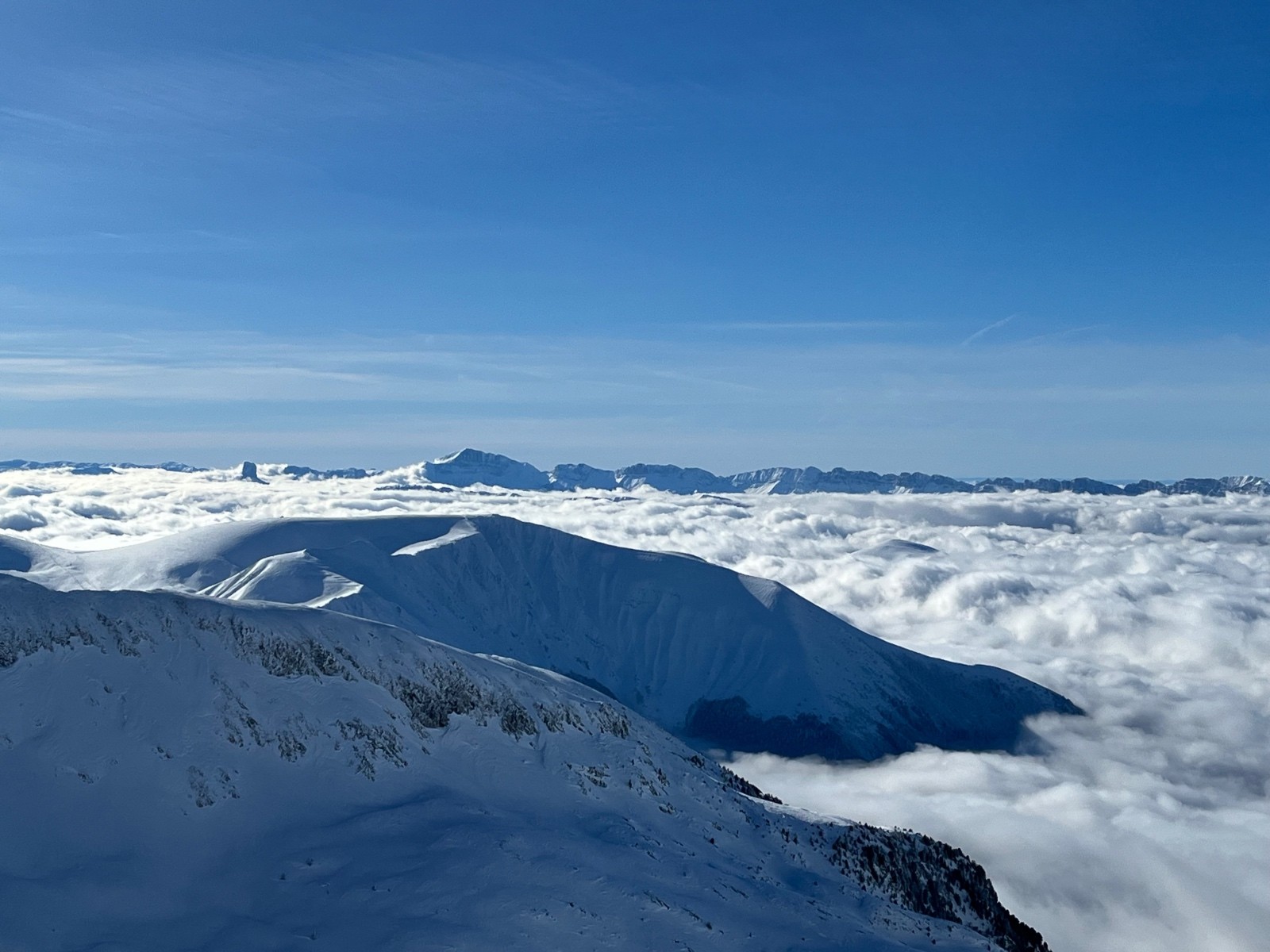 Ensuite remontĂ©e rapide sur la crĂȘte oĂč le vent est tombĂ© et oĂč nous profitons de la vue splendide sur le Devoluy (tĂȘte de l Obiou), le Vercors (avec le mont Aiguille qui Ă©merge de la mer de nuage), la Chartreuse et Belledonne.
