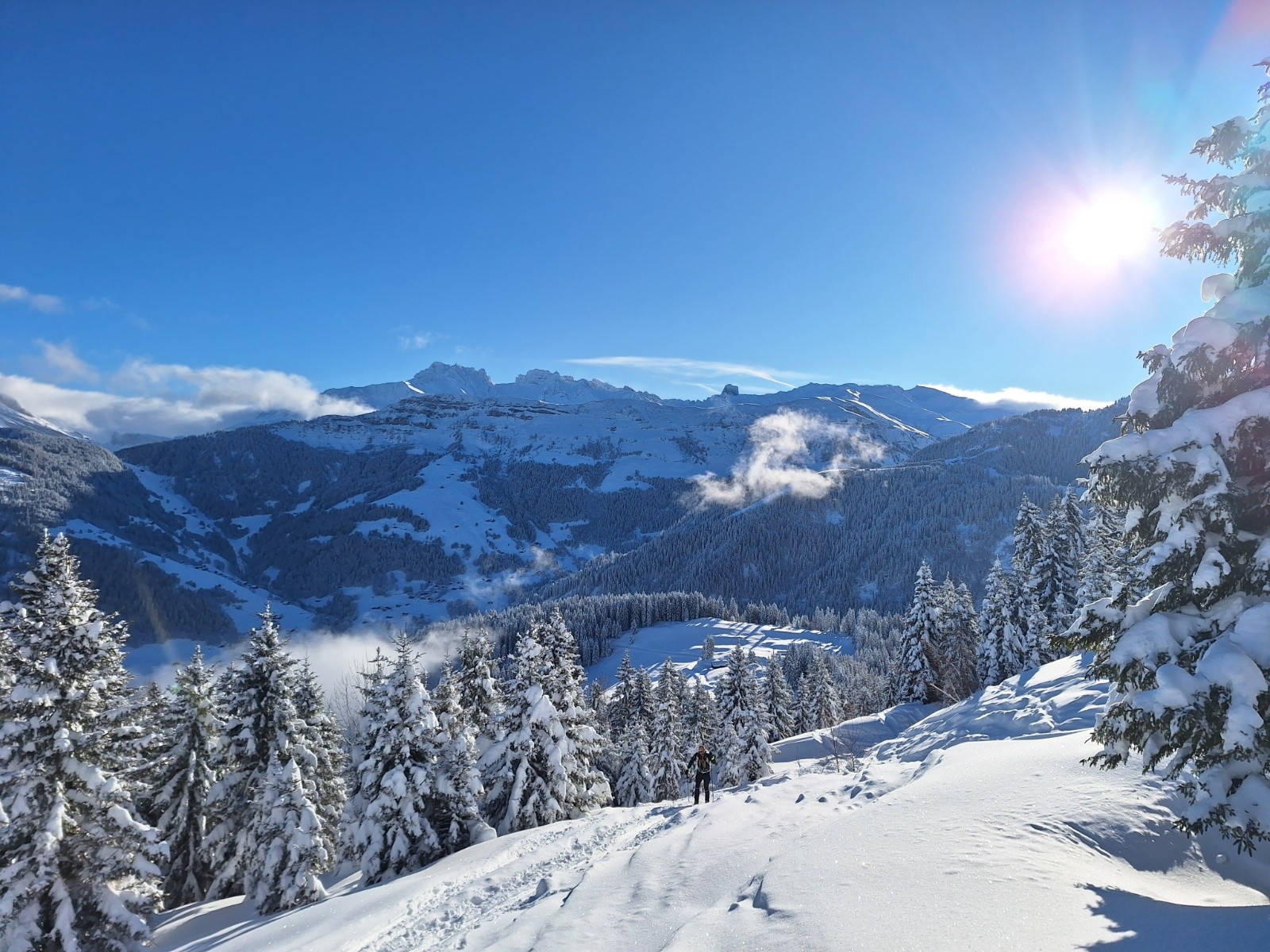 Le froid étant un peu saisissant, on ne traîne pas trop! Direction le Planay. La descente au milieu des sapins face au Mont-blanc et à la Pierra Menta est fabuleuse, avec cette neige légère. Surtout qu'il y a largement de la place pour faire sa trace!