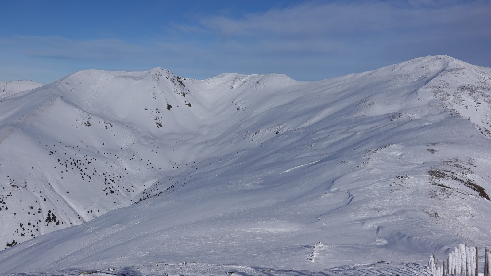 Conditions pour le ski : Bonne neige globalement : poudreuse bien froide mais le vent a bien œuvré en altitude où on retrouve de la vieille neige dure proche des crêtes et au sommet. En dehors des zones abritées, neige poudreuse lissée ou cartonnée par le vent. Bon ski dans l'ensemble.