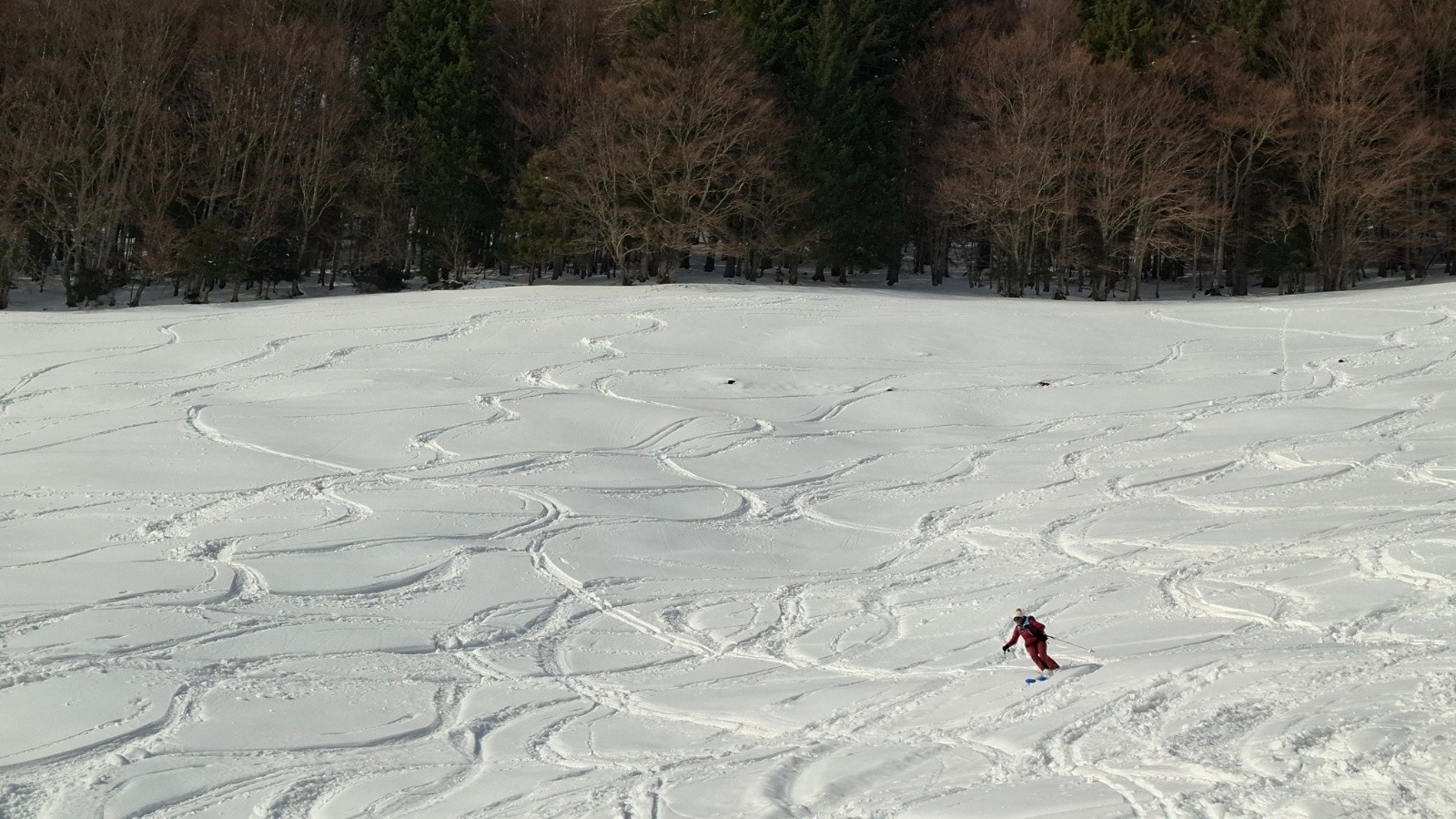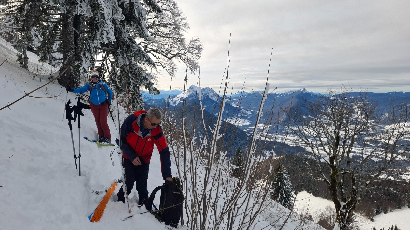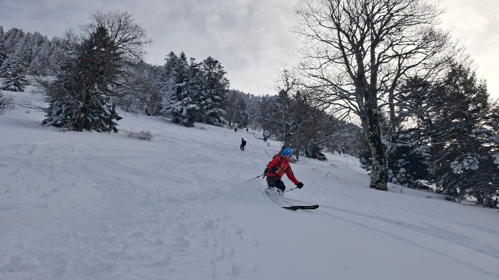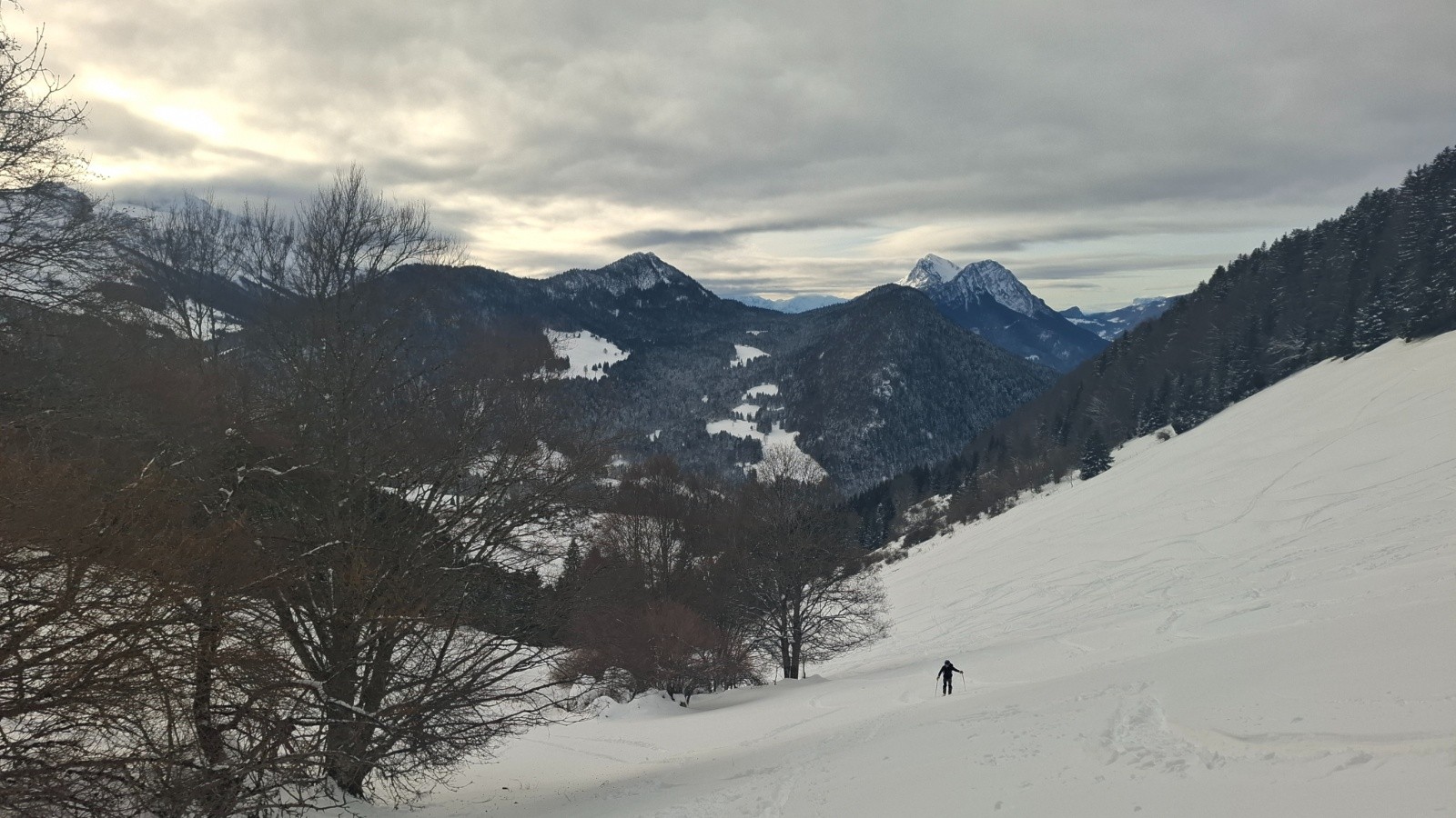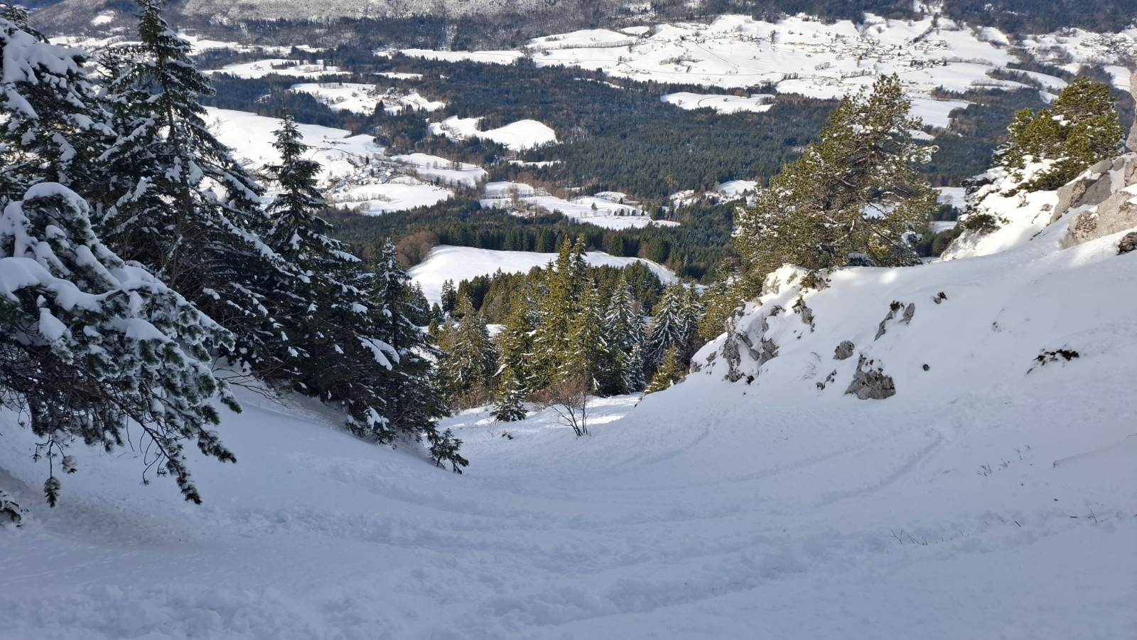 Conditions pour le ski : encore très correct malgré le redoux en cours de matinée, première descente bonne poudre, s’alourdissant sous 1400, deuxième descente poudre trafolée sous le sommet, devenant lourde sous 1600 en toutes orientations, ça colle un peu où il n'y a pas d'anciennes traces, contre-pentes SE passe bien grandes courbes, chemin nickel, dernier champ pas dégueu, qq requins par-ci par-là.
