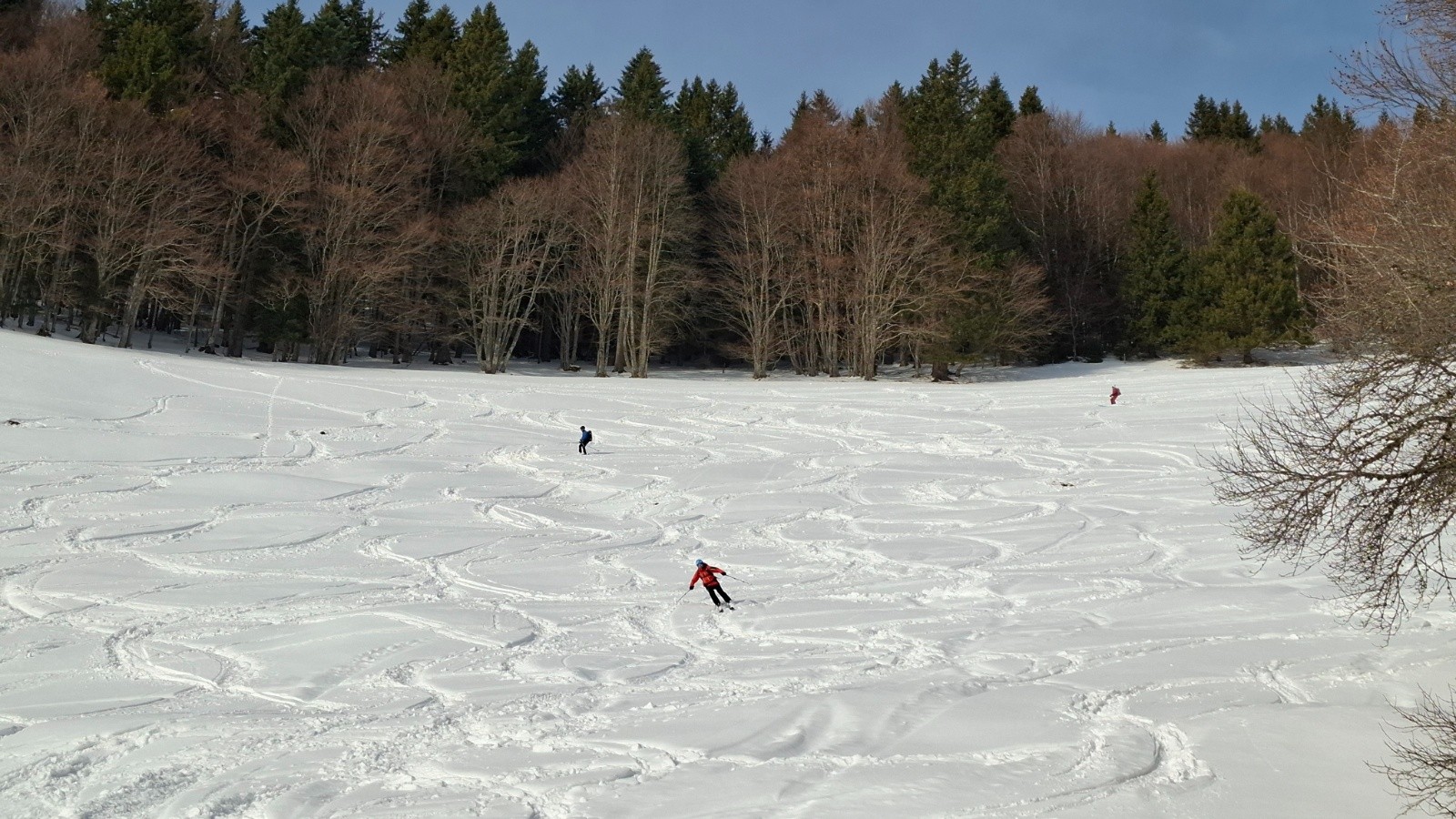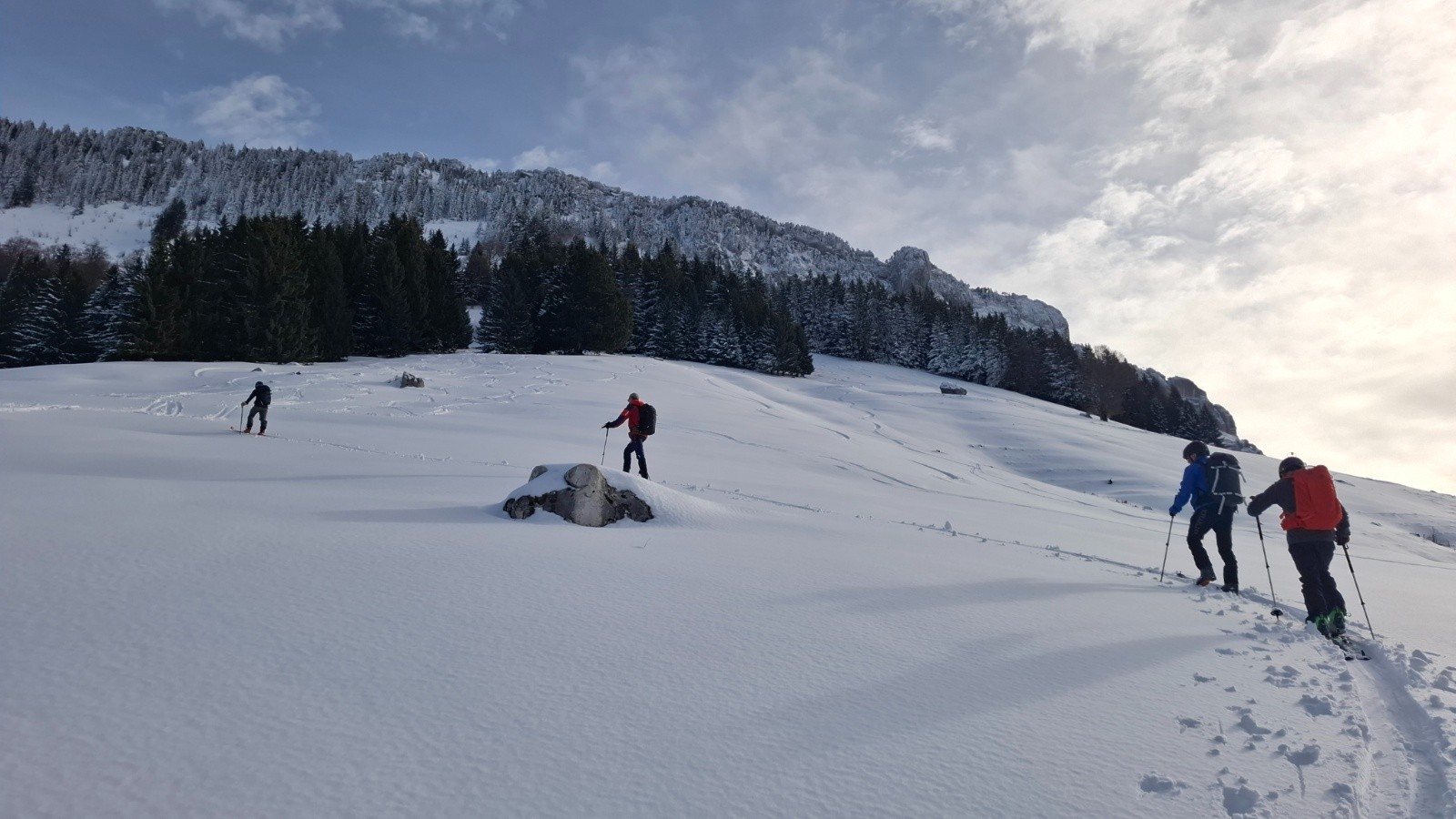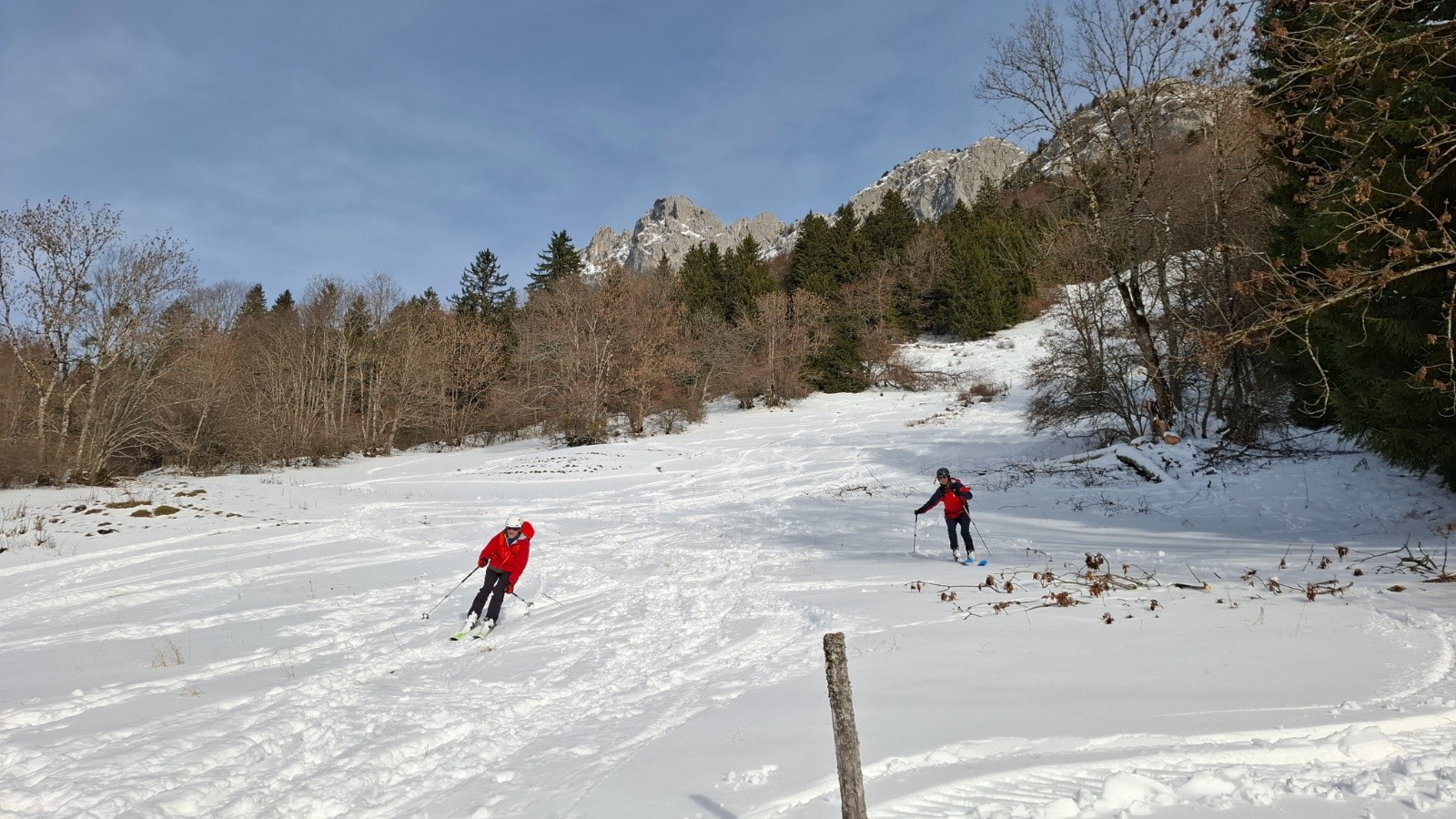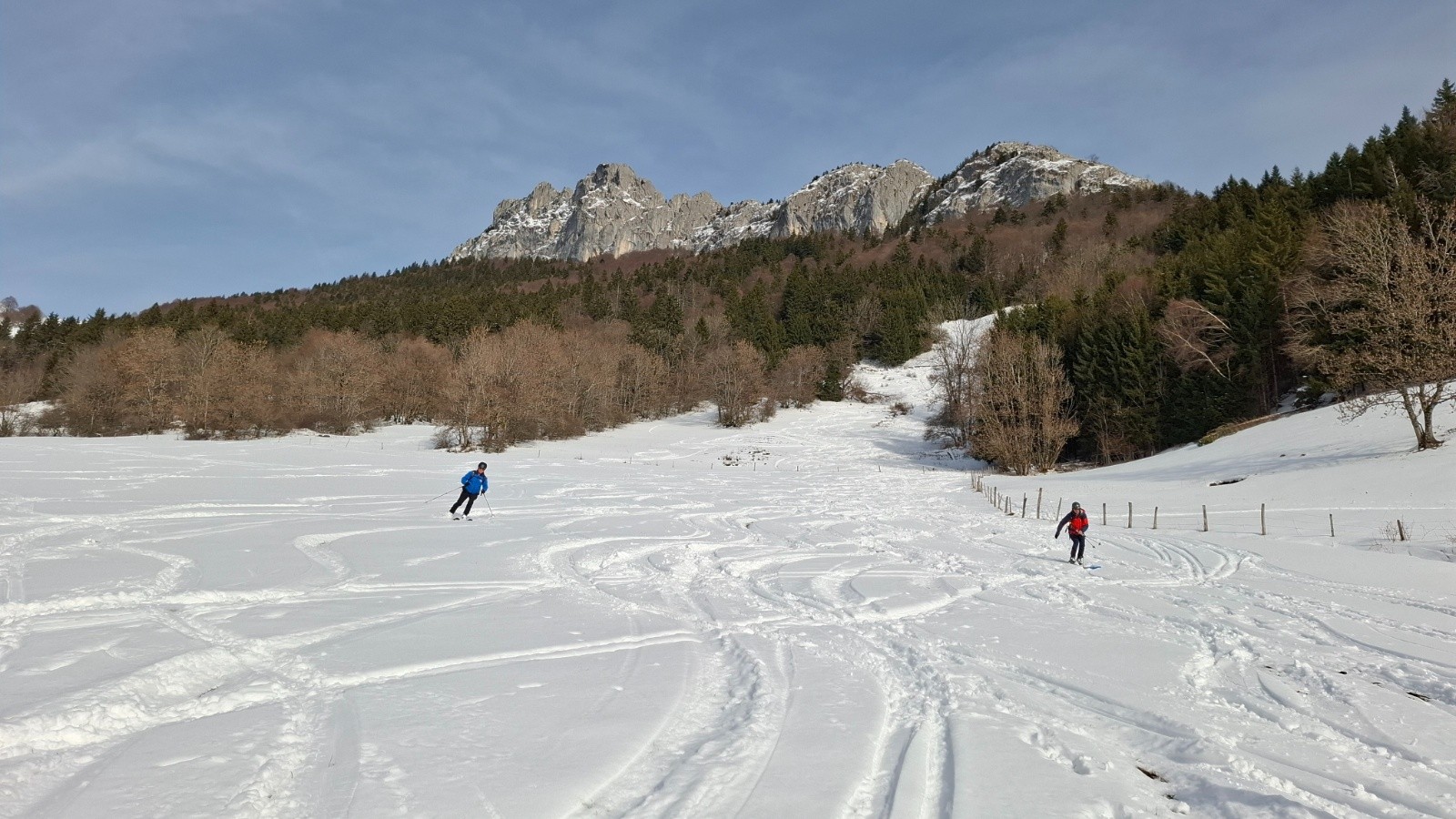 Conditions pour le ski : encore très correct malgré le redoux en cours de matinée, première descente bonne poudre, s’alourdissant sous 1400, deuxième descente poudre trafolée sous le sommet, devenant lourde sous 1600 en toutes orientations, ça colle un peu où il n'y a pas d'anciennes traces, contre-pentes SE passe bien grandes courbes, chemin nickel, dernier champ pas dégueu, qq requins par-ci par-là.