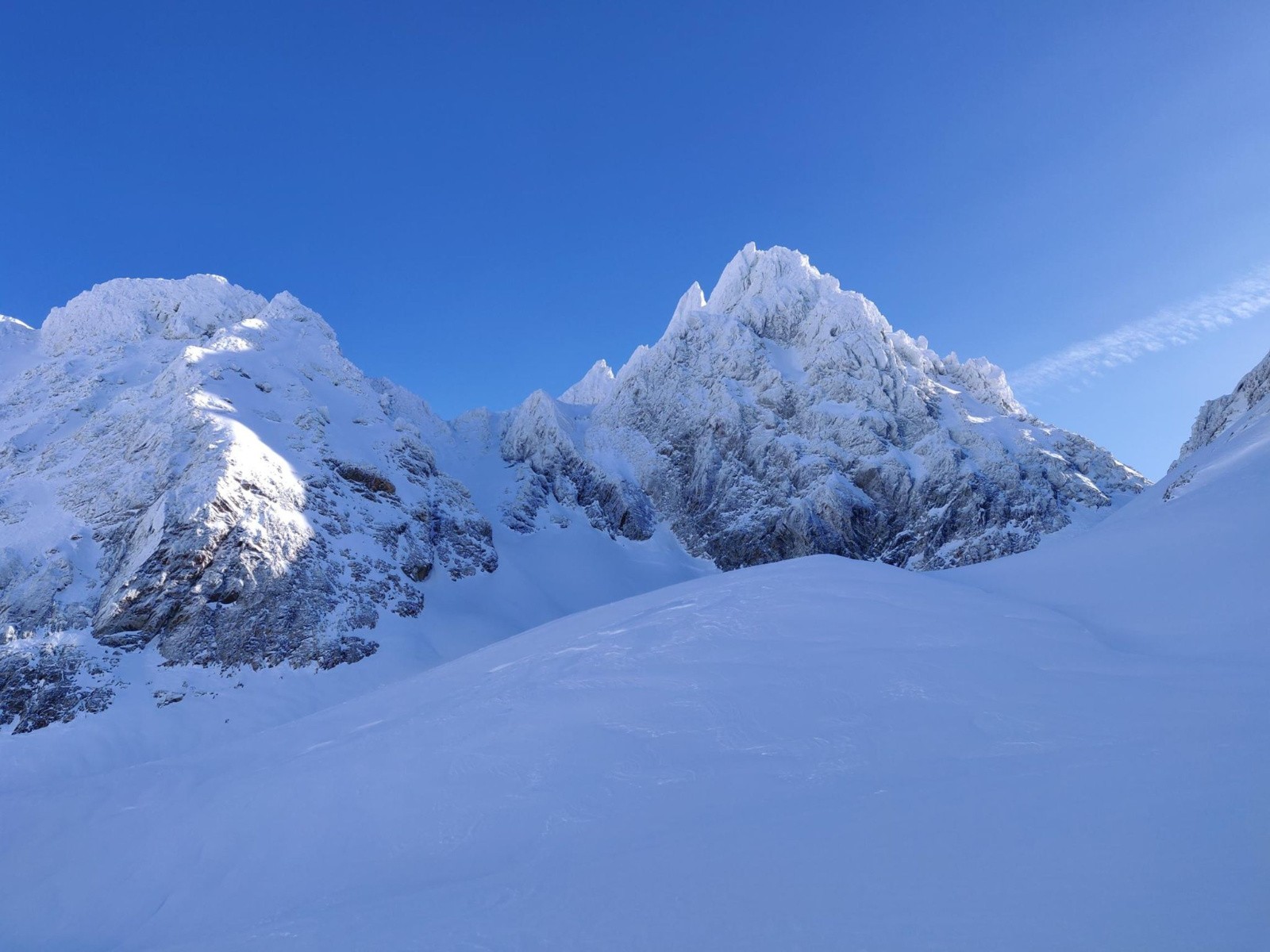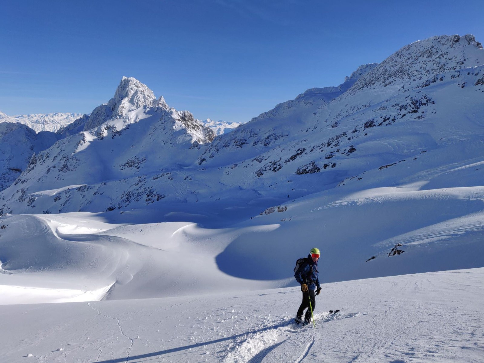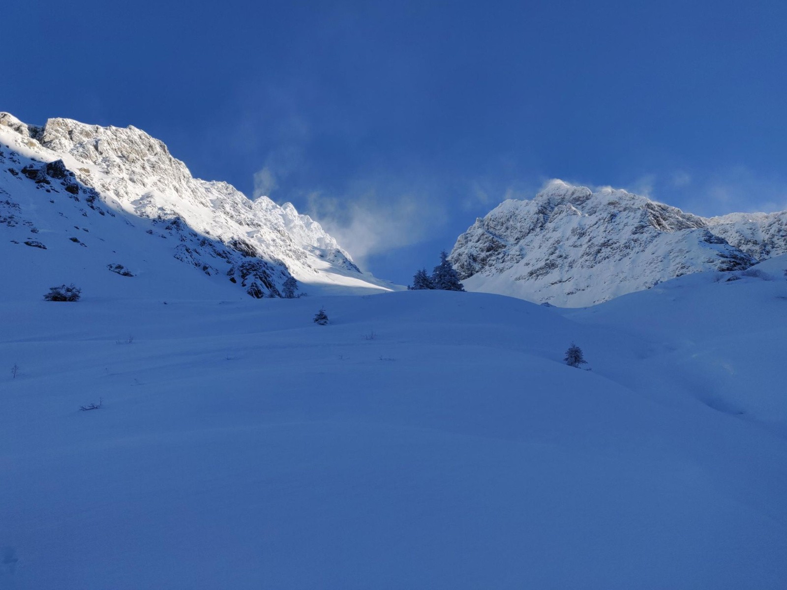 Conditions pour le ski : 40-60cm de poudreuse en début de tassement, très largement préservée par le vent