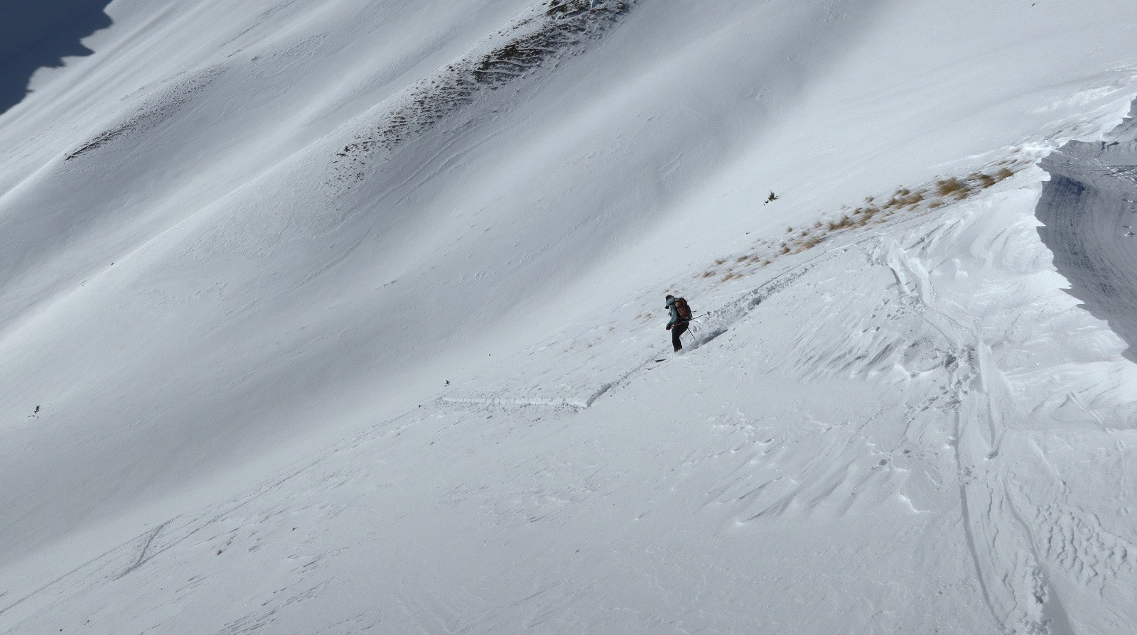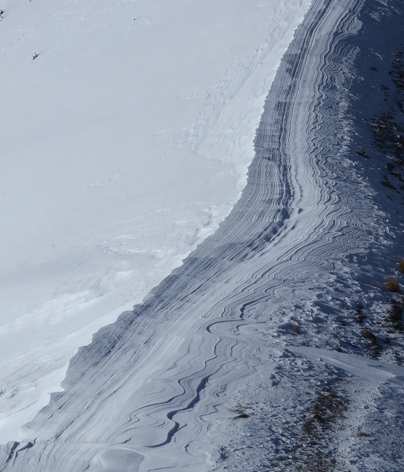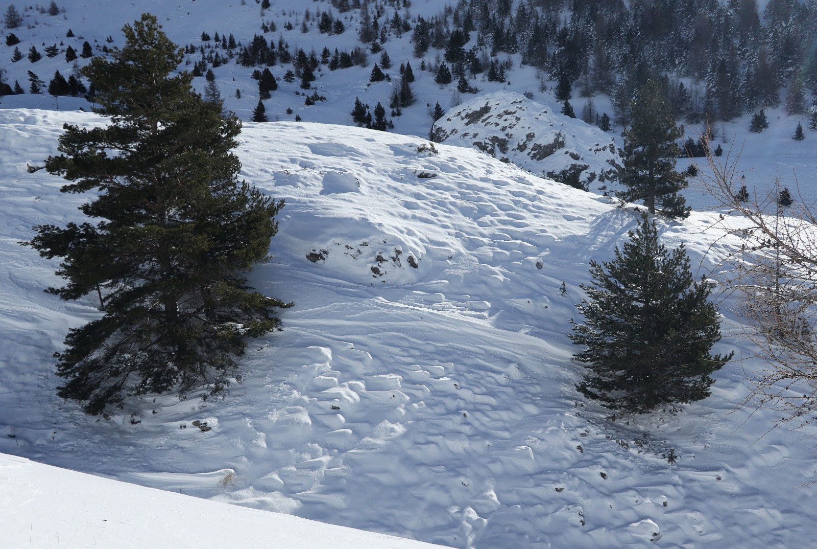 Beaucoup de pentes en toutes orientations totalement décapées par le vent.