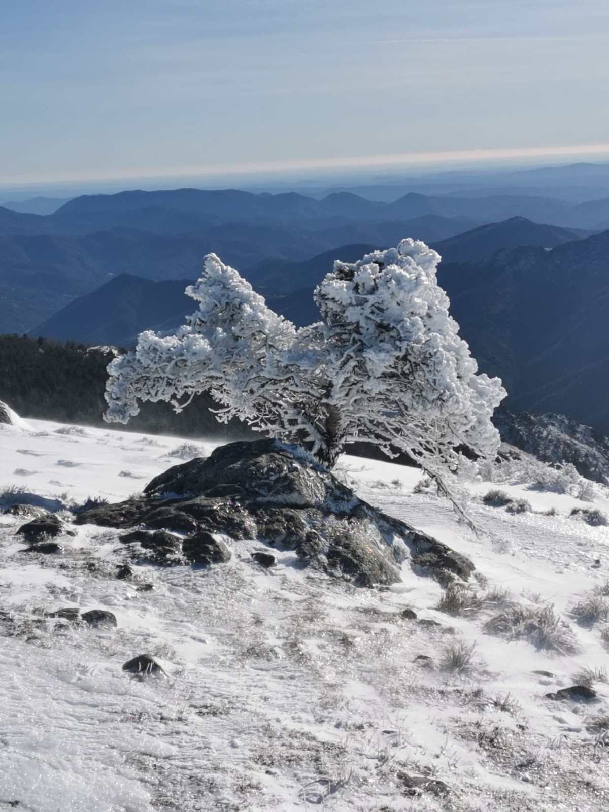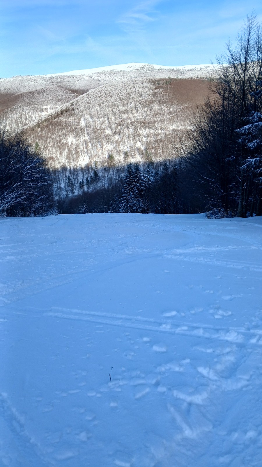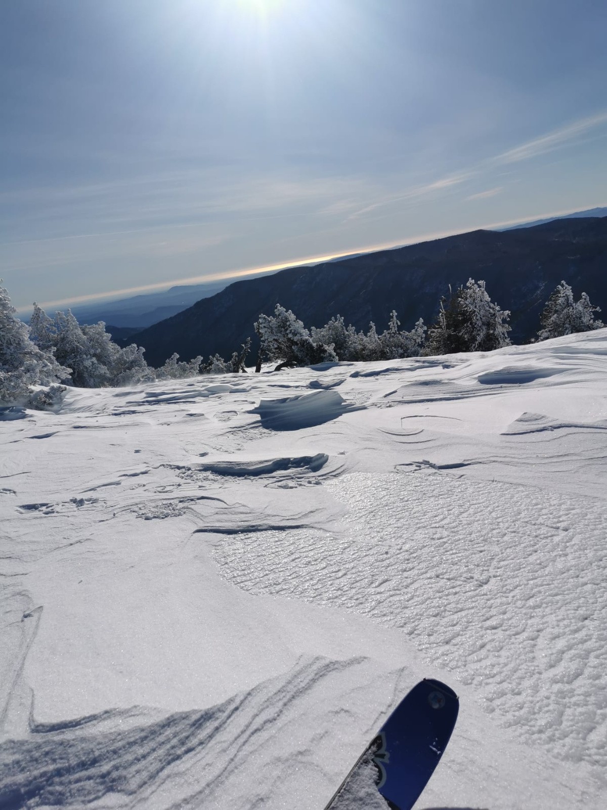 Itinéraire suivi : De Prat Peyrot, montée à l aigoual par le GR, descente en foret jusqu'à la citerne versant sud, faut chercher des trouées, mais il y en a, 10 cm de poudre sous les arbres, traversée jusqu'à l ancienne piste de la Breze, descente jusqu'au départ du teleski des Tindelles fermé, puis 3 remontées et descentes des Tindelles en poudre, 20 cm parfaites en nord.