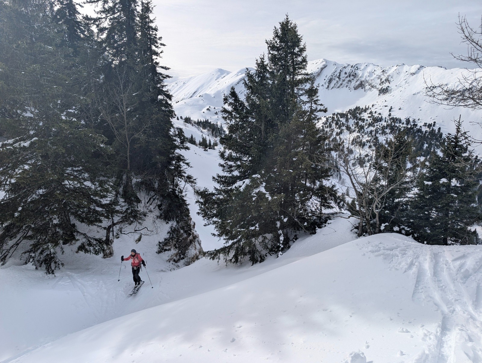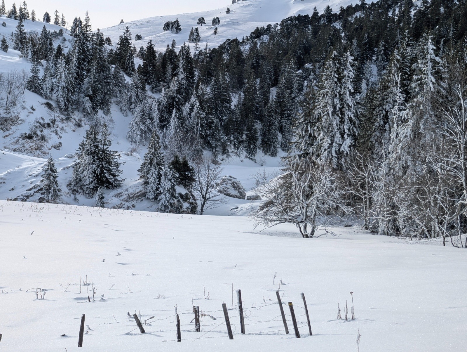 Conditions pour le ski : encore correctes en ce qui concerne la neige bien qu'en cours d'humidification - enneigement cependant encore un peu juste vu l'encombrement du terrain (rochers, branches, racines) ; par contre, à la montée bottage conséquent à partir du débouché du Cul de Lampe jusqu'au col de la Petite Vache