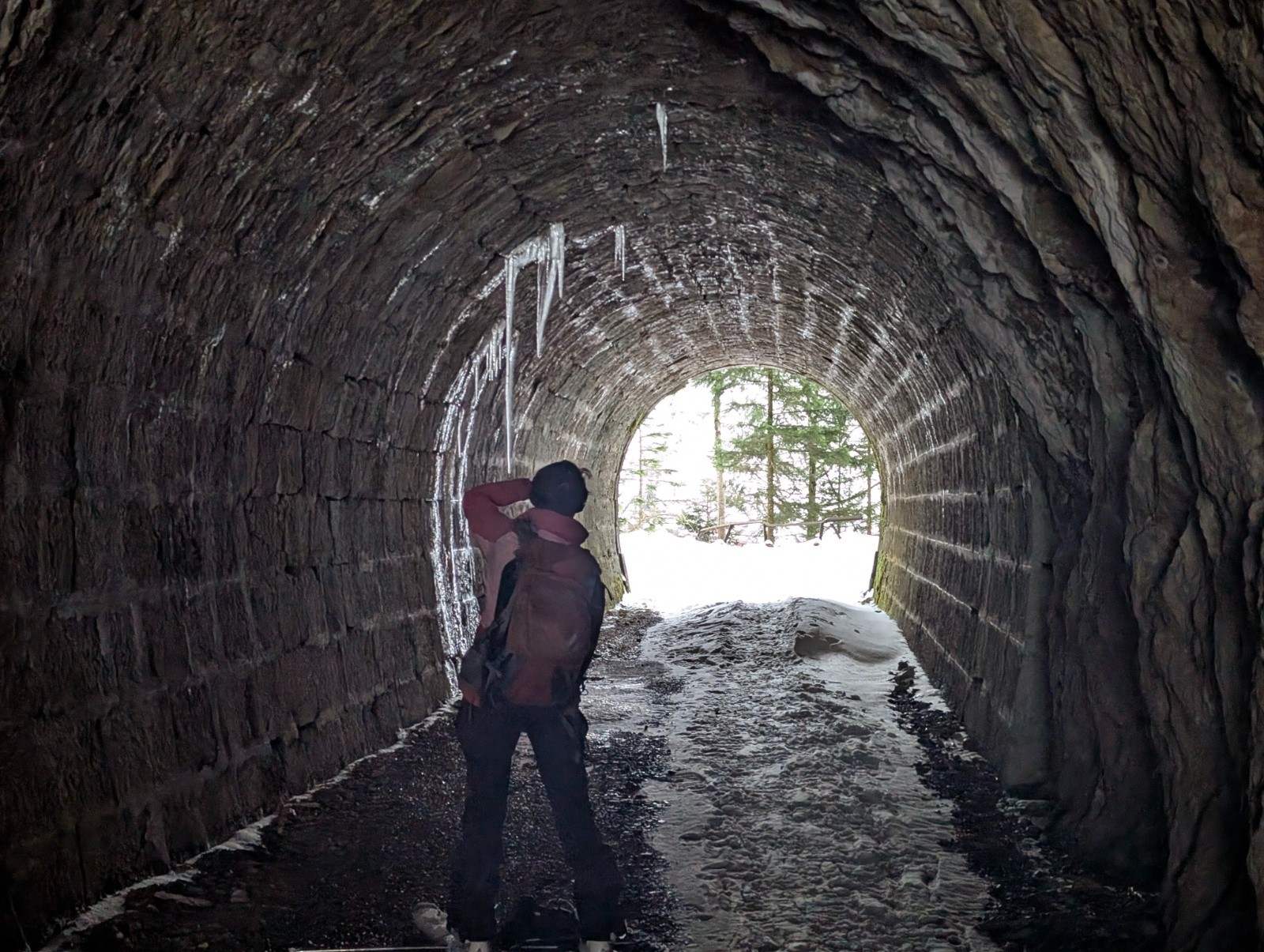 C’est là que le « drame » eu lieu : un bâton de Mr MiRO, qui n’avait servi que 2 fois, s’est coincé entre deux rochers et cassa net à 1/3 de sa longueur….Et justement, ce bâton aurait pu être très utile sur la longue RF de la Charmette avec ses sections plates, ses tunnels et, heureusement, ses dalles qui avaient eu le bon goût de décharger avant notre passage. Par contre, l’arbre que les forestiers venaient de couper n’était visiblement pas tombé du bon côté. Pour nous, un peu de gymnastique résolu le problème, pour les forestiers, je ne sais pas.