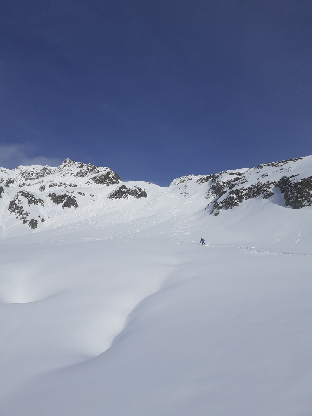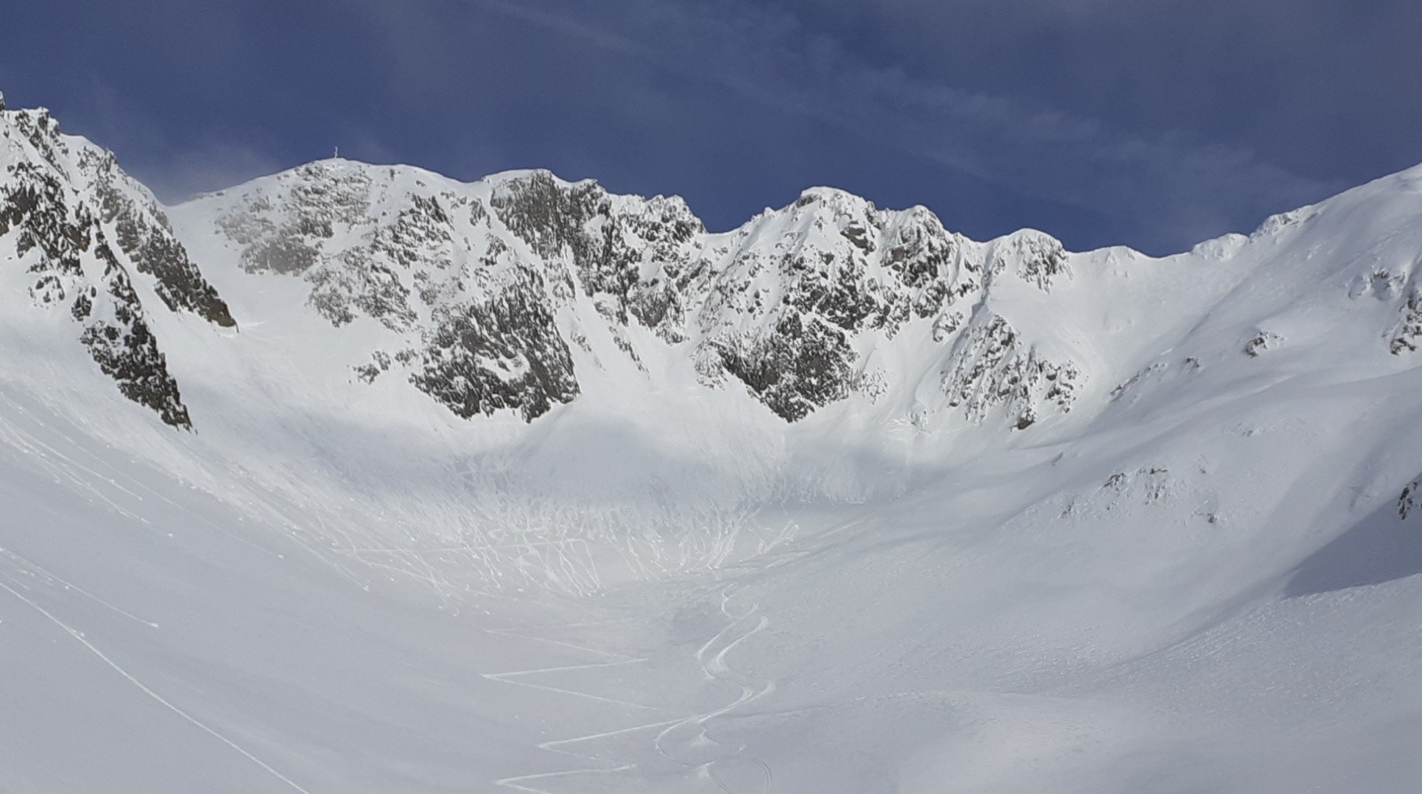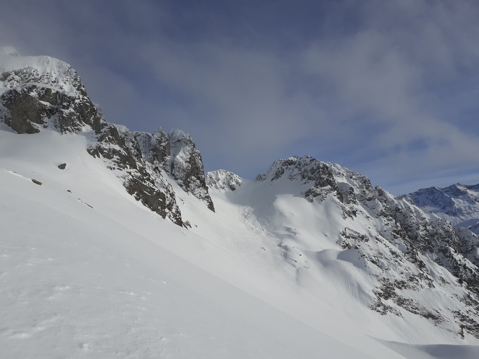 Conditions nivo et activité avalancheuse : Grosse cassure (1m30) sur le cirque sud Belle Étoile/Ilette. A priori la même cassure sur le versant sud du col de la Vache. Un dépôt sous le col de Vouteret. Plutôt bon tassement en sud.