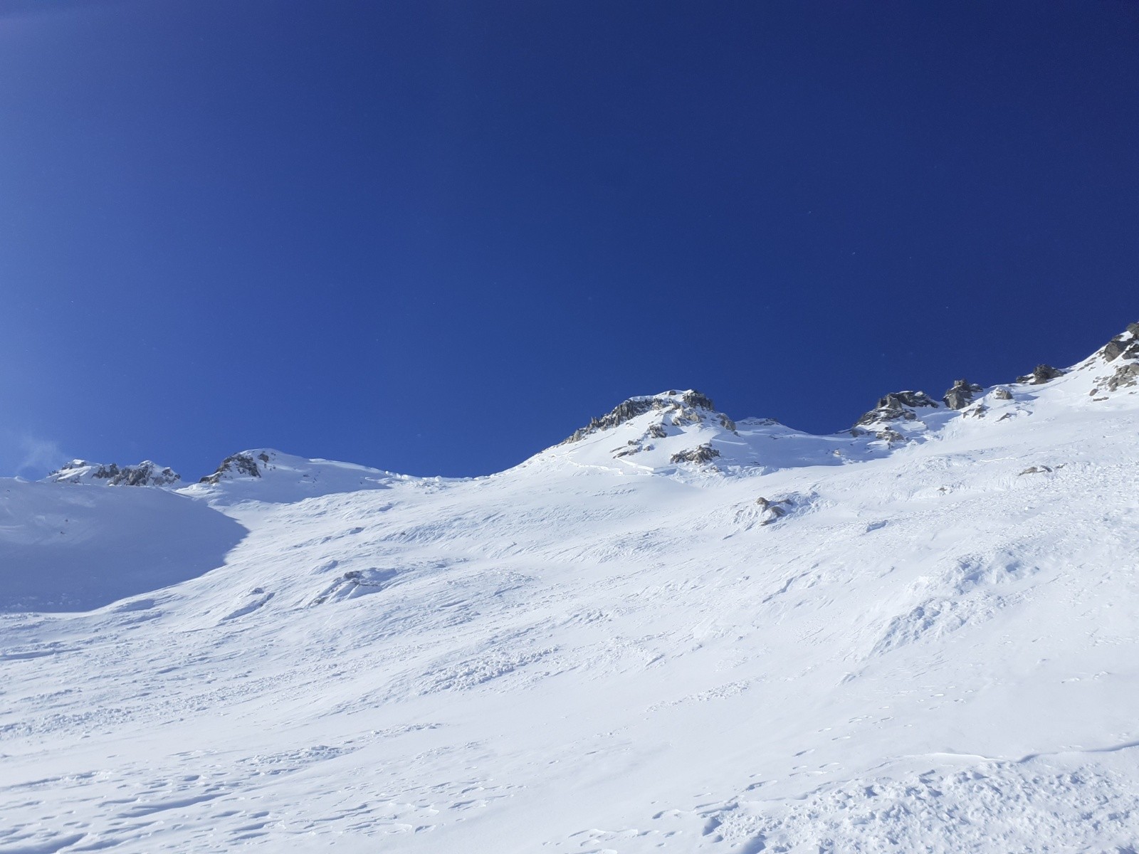 Mauvaise pioche pour la descente de la Belle Etoile vers les Lacs des 7-Laux: gros dépôt de neige balayé par le vent.