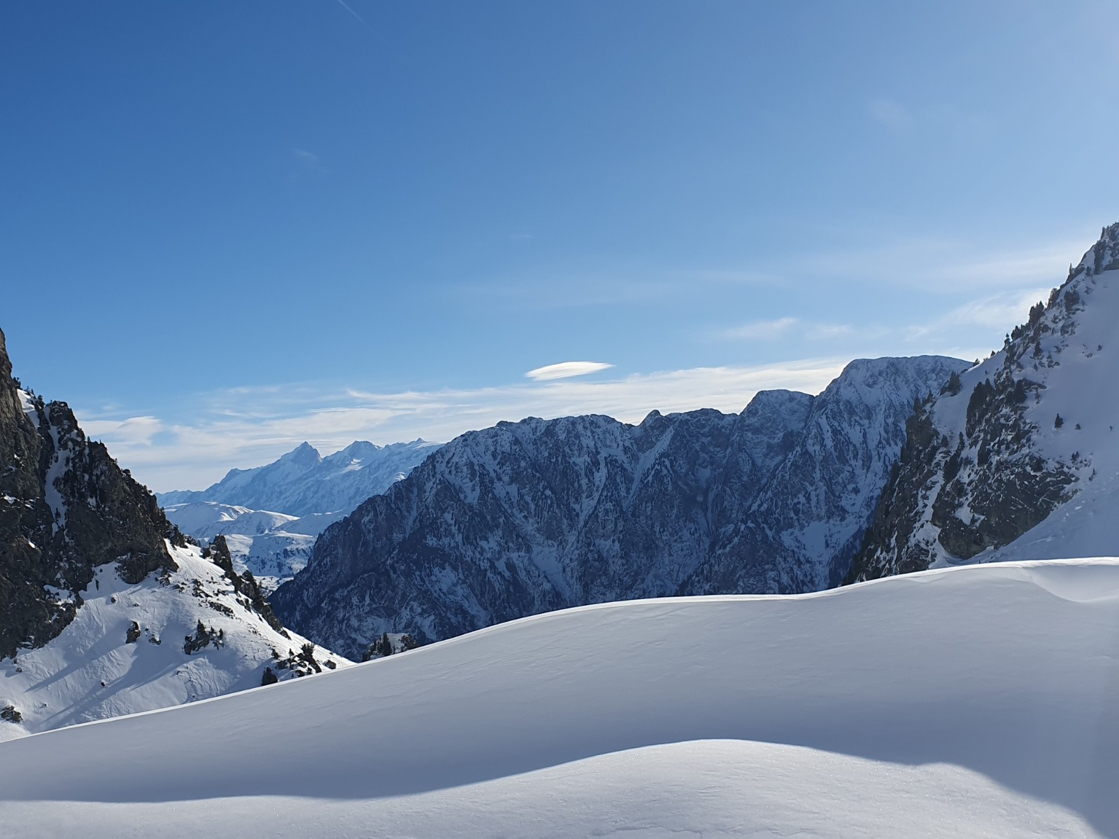 Conditions pour le ski : Poudre plus ou moins humidifiée selon exposition et altitude, sans logique nette. Mais c'est bien plus skiant que ce que je craignais (cela dit entre la douceur persistante et le vent se renforçant demain, cela devrait bien changer)
