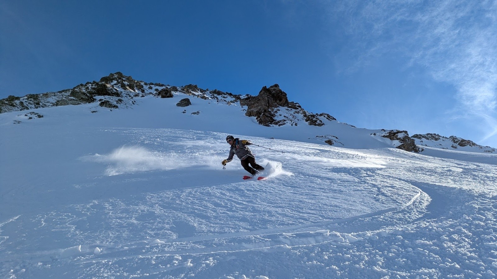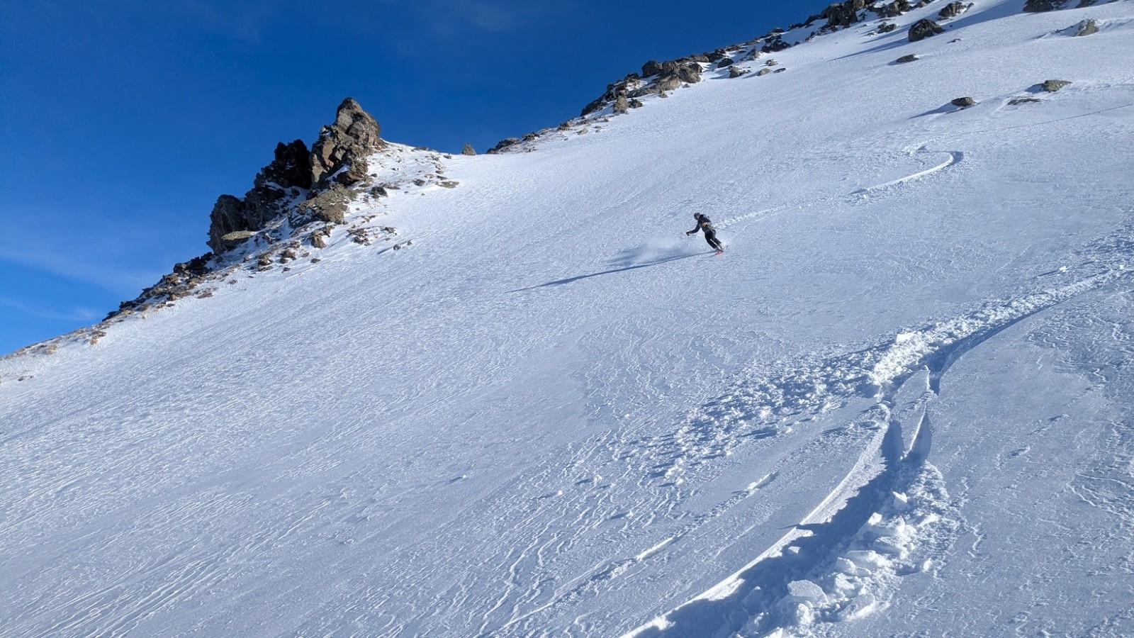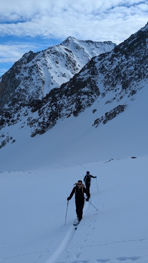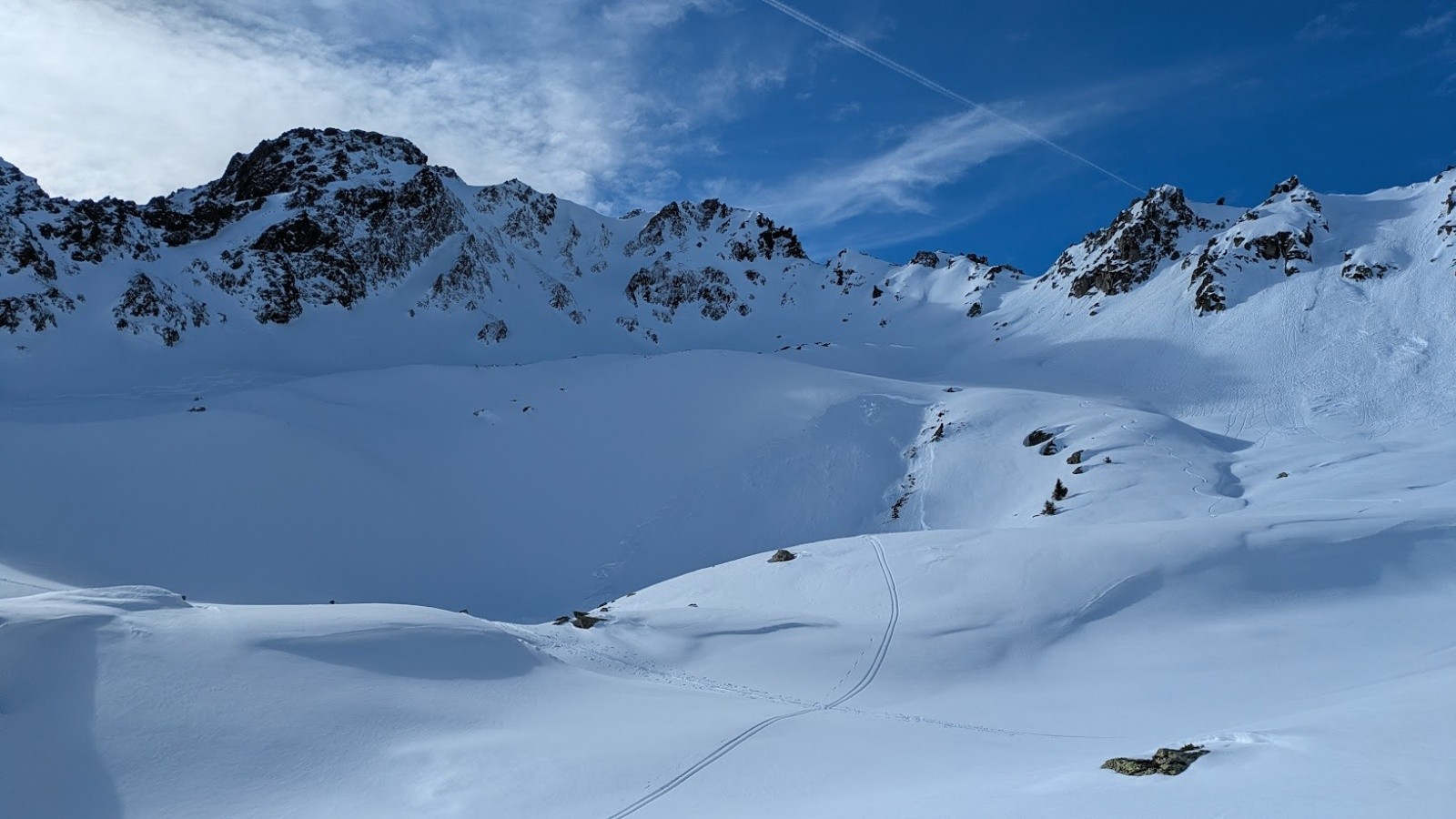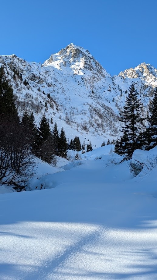 Conditions pour le ski : Poudre plus ou moins travaillée par le vent ou le soleil suivant les micro orientations du sommet jusque vers 1900. Quelques zone dures facilement évitable. Crouté en sud. Poudre dans le vallon bien à l'ombre entre 1950 et 1700. Poudre s'alourdissant entre 1700 et 1500. Piste de la prise d'eau en trafolée lourde limite collante à la fin.