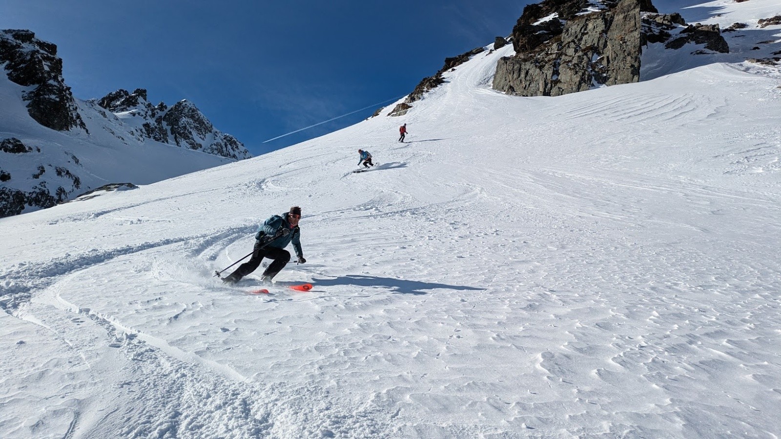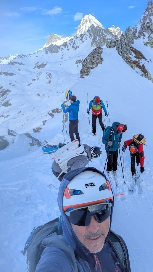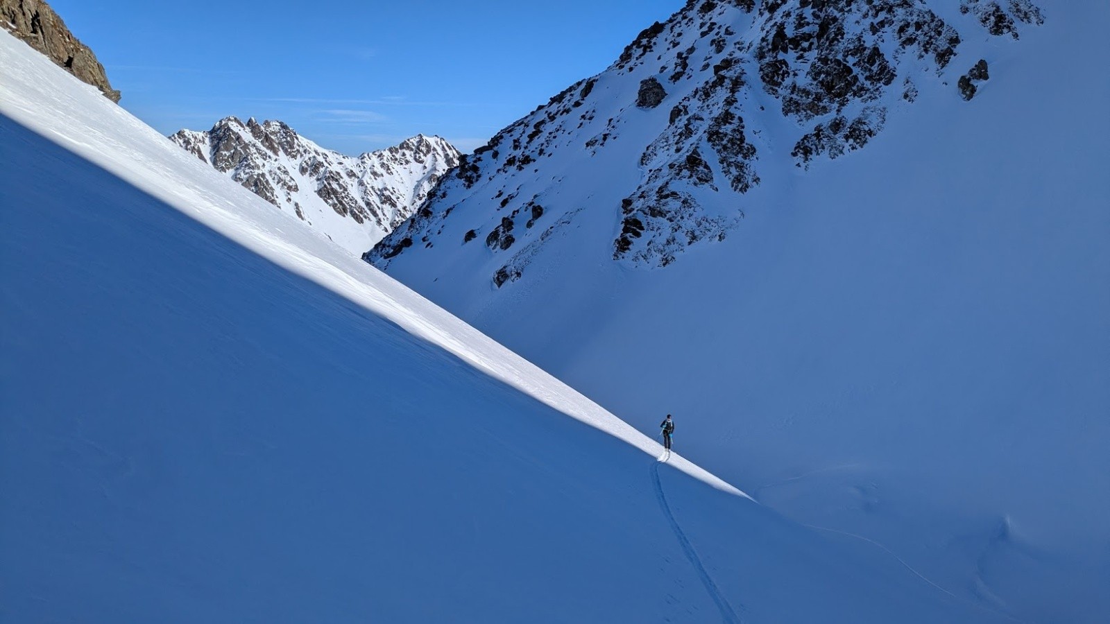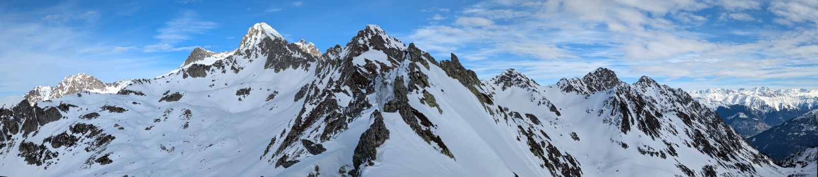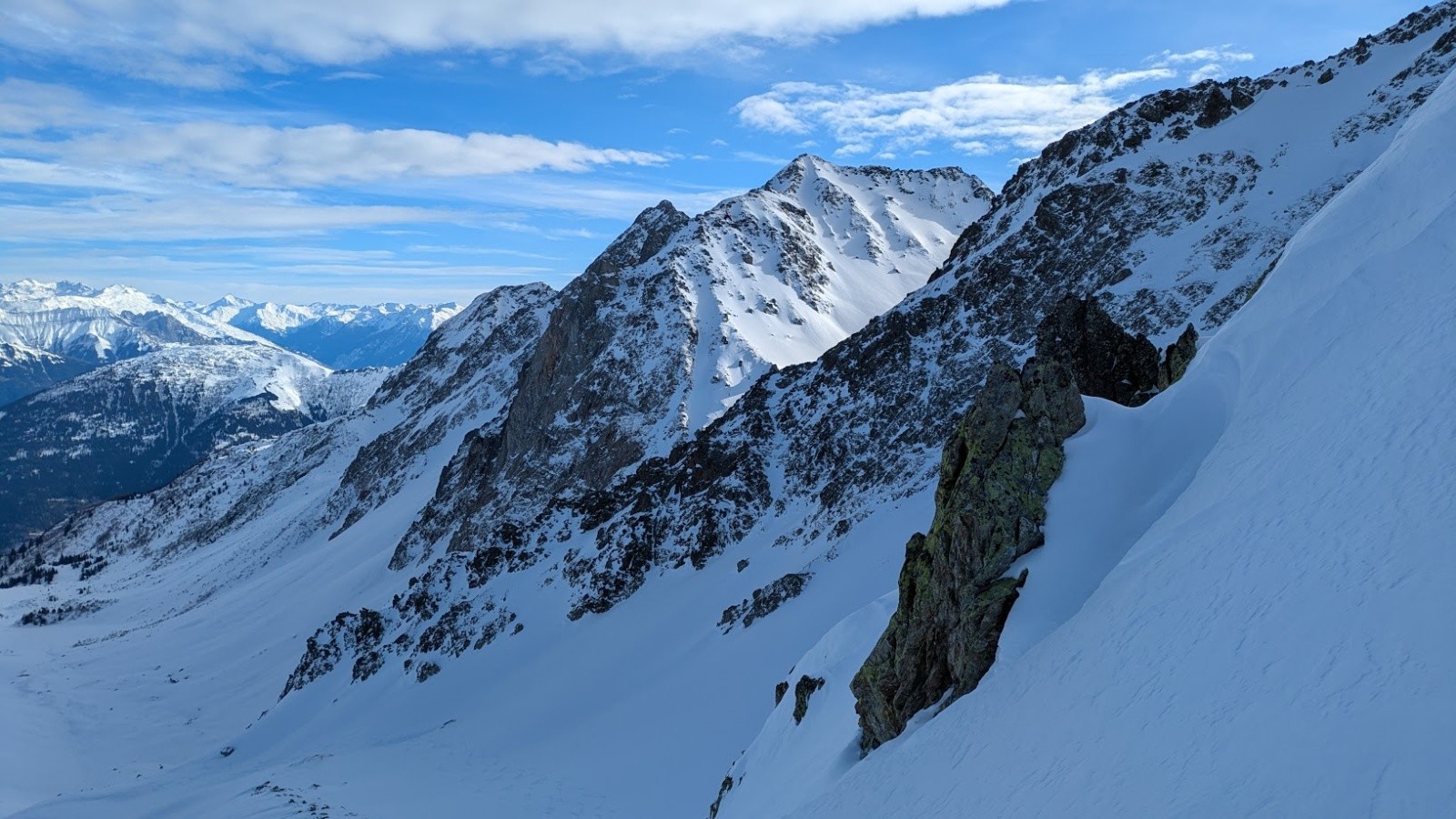 Conditions pour le ski : Poudre plus ou moins travaillée par le vent ou le soleil suivant les micro orientations du sommet jusque vers 1900. Quelques zone dures facilement évitable. Crouté en sud. Poudre dans le vallon bien à l'ombre entre 1950 et 1700. Poudre s'alourdissant entre 1700 et 1500. Piste de la prise d'eau en trafolée lourde limite collante à la fin.