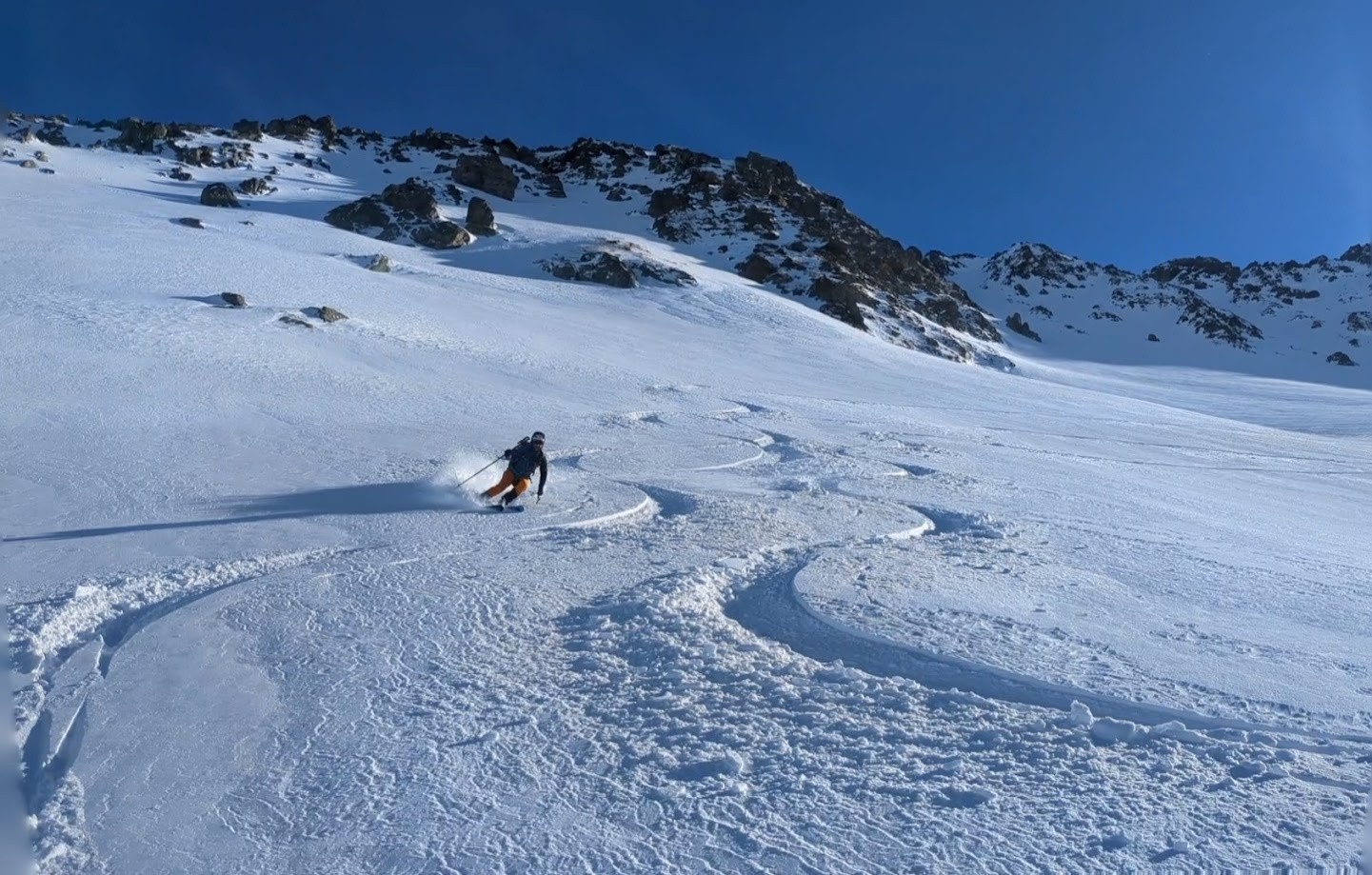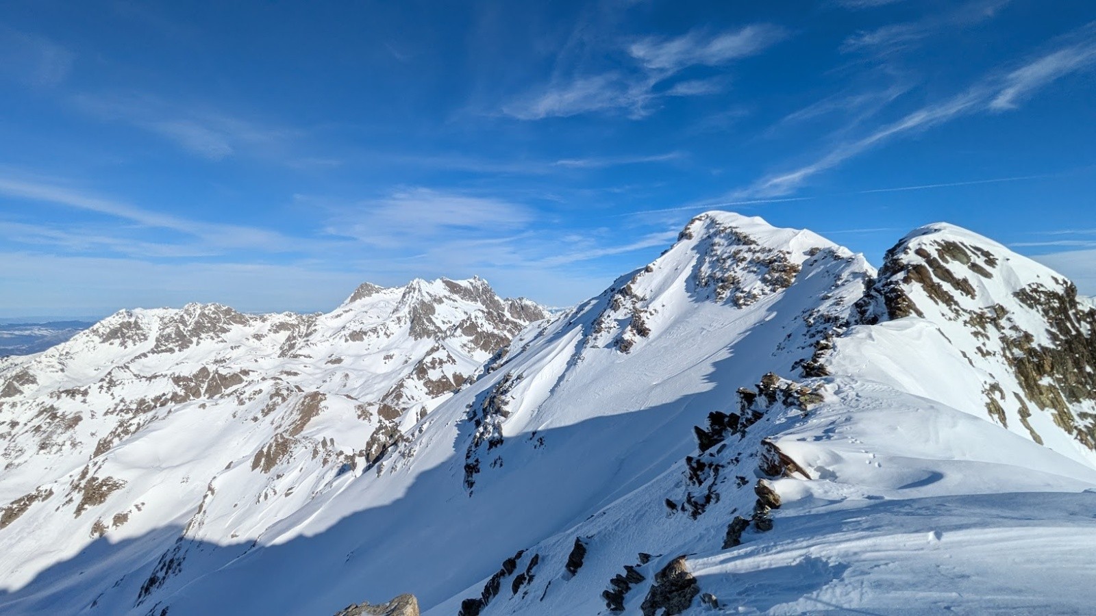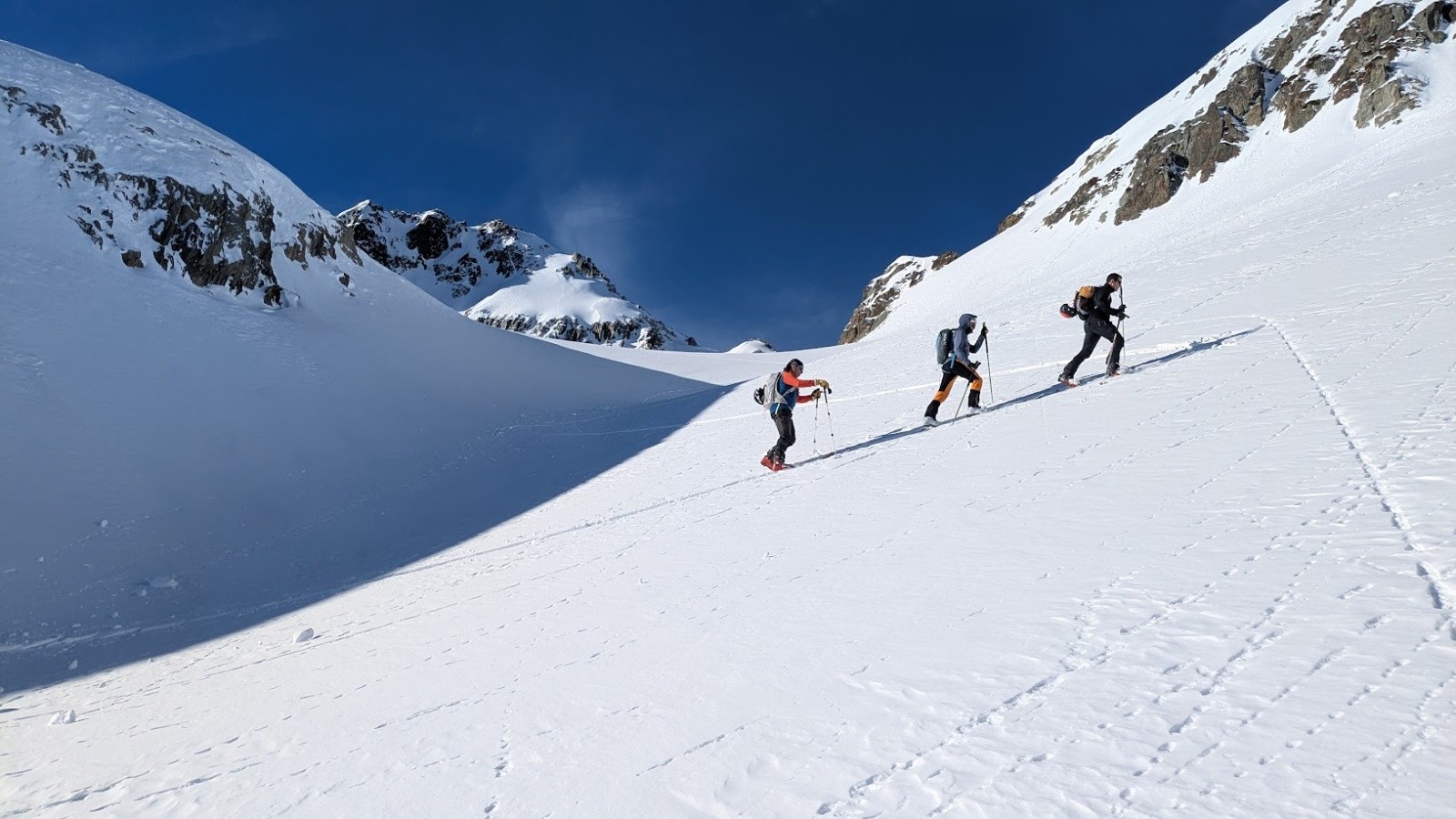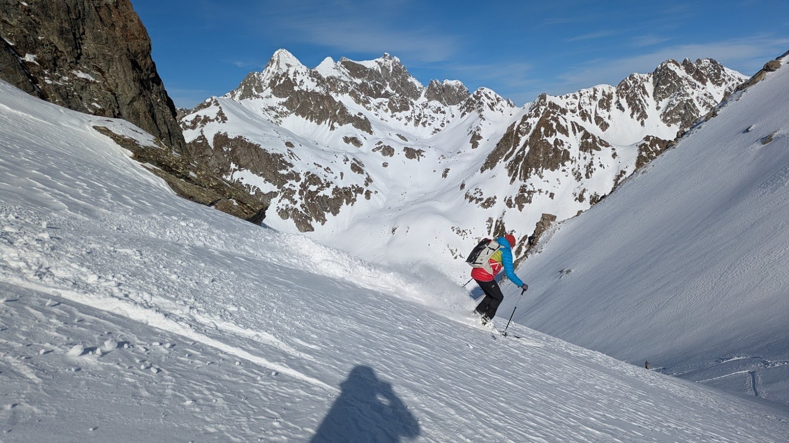 Conditions pour le ski : Poudre plus ou moins travaillée par le vent ou le soleil suivant les micro orientations du sommet jusque vers 1900. Quelques zone dures facilement évitable. Crouté en sud. Poudre dans le vallon bien à l'ombre entre 1950 et 1700. Poudre s'alourdissant entre 1700 et 1500. Piste de la prise d'eau en trafolée lourde limite collante à la fin.