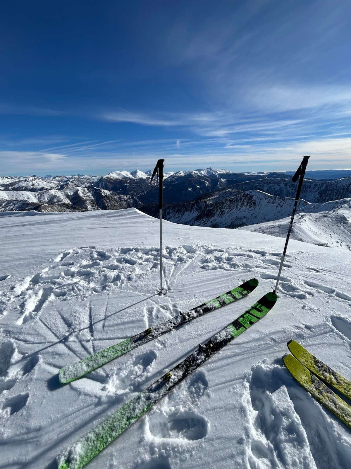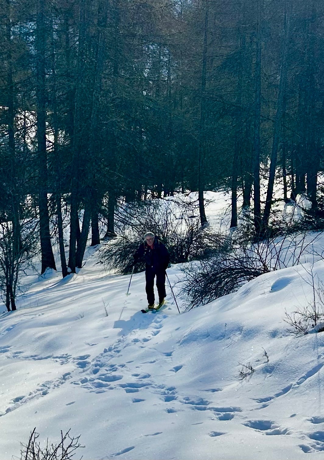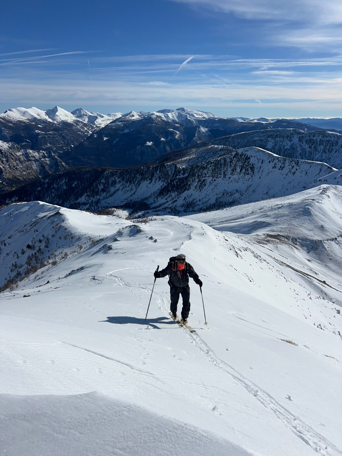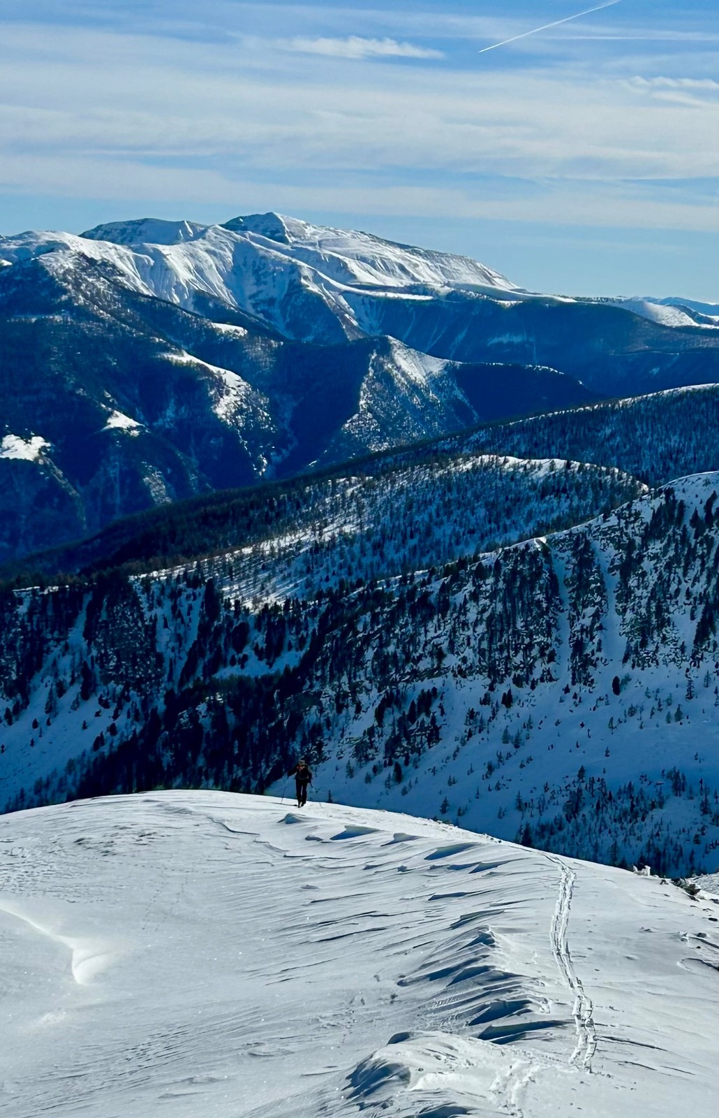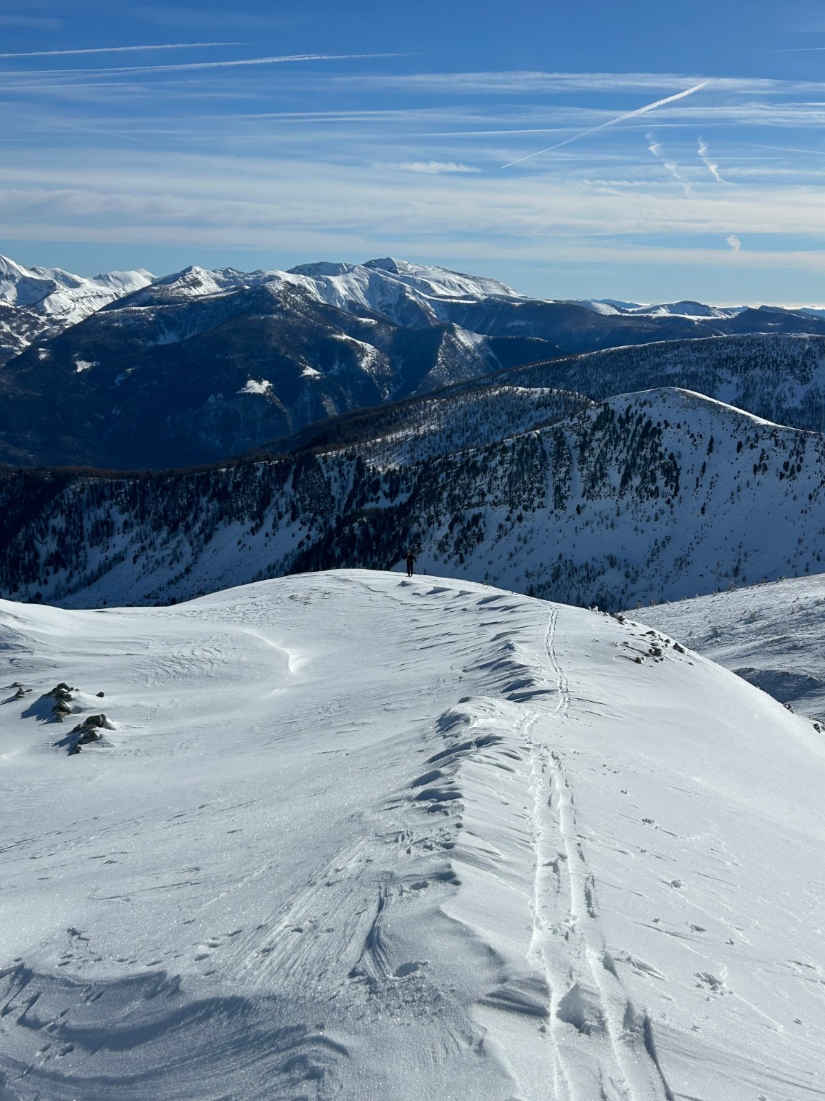 Conditions pour le ski : Bonnes conditions en sachant que le redoux des 2 derniers jours a commencé à stabiliser le manteau neigeux et à humidifier la neige surtout dans les versants Sud et Ouest. 400 mètres de poudreuse dans la descente Nord-Est sous le sommet vers la Cabane Joyeux , mais ensuite neige cartonnée en forêt pour rejoindre le sentier d'été dans le vallonn joyeux jusqu'à la cabane Chabaud et la passerelle