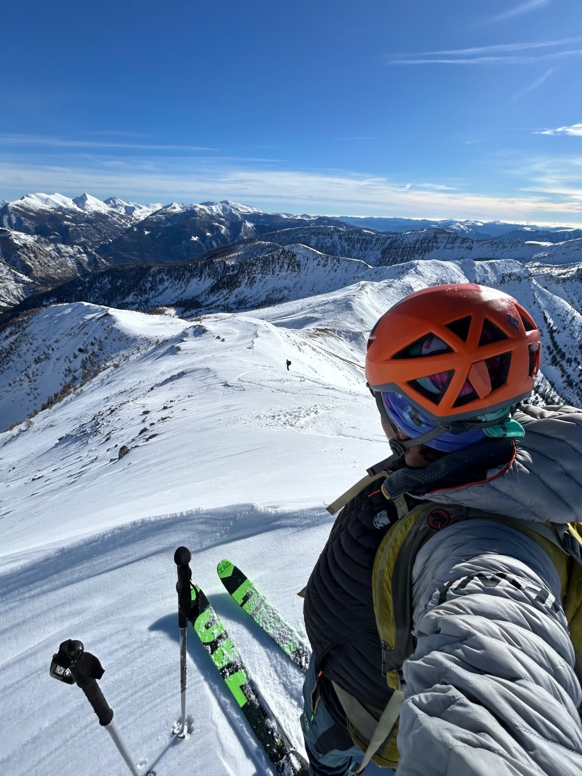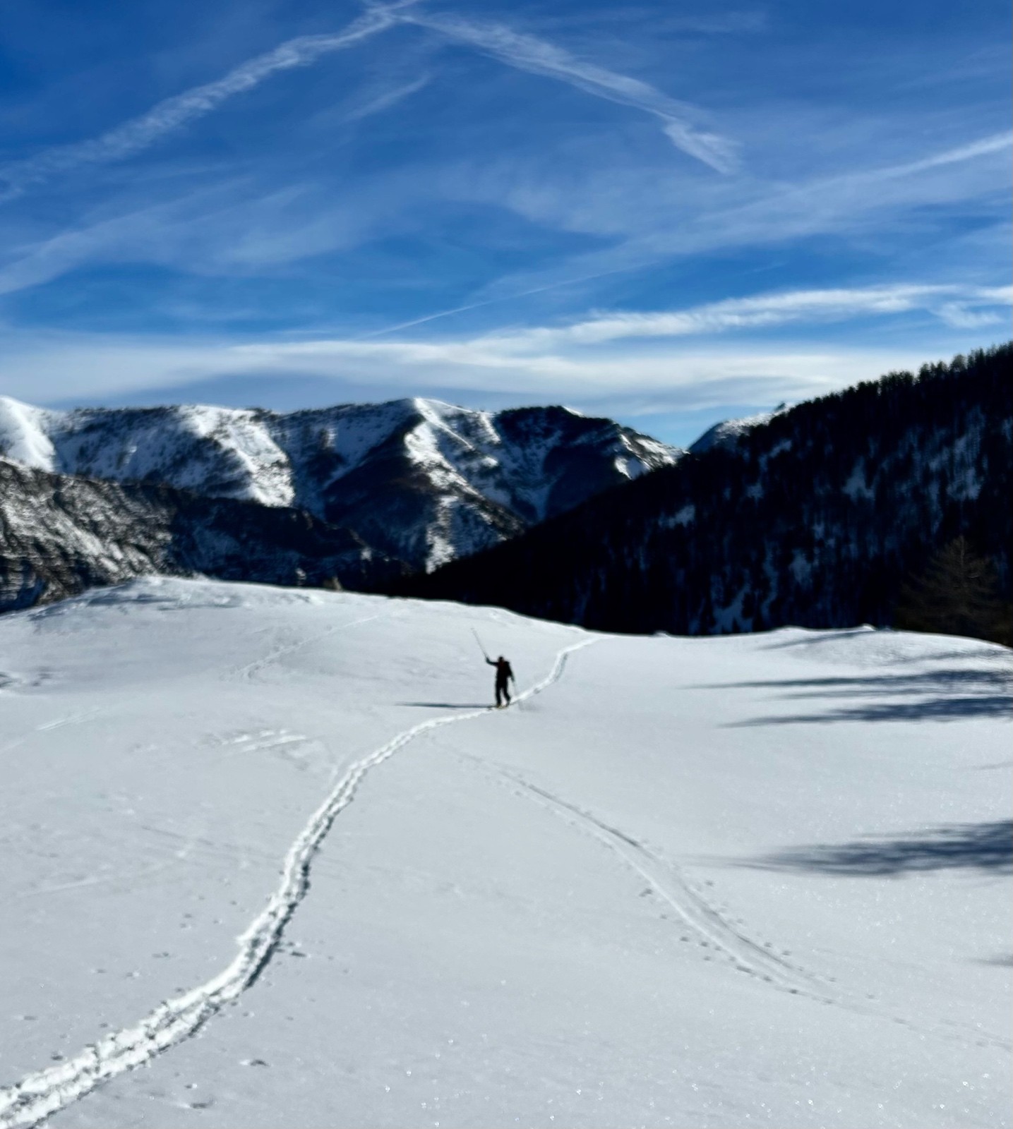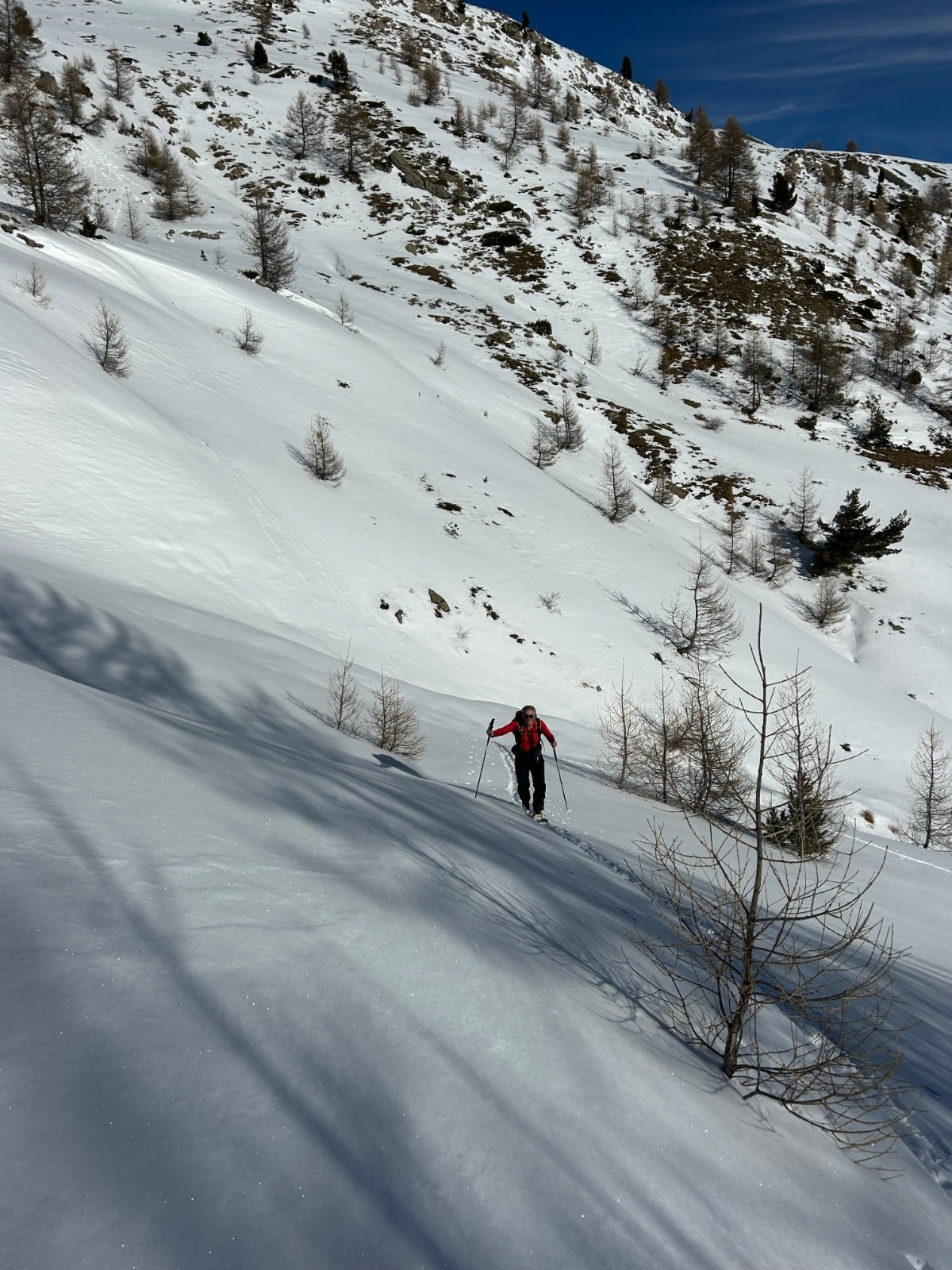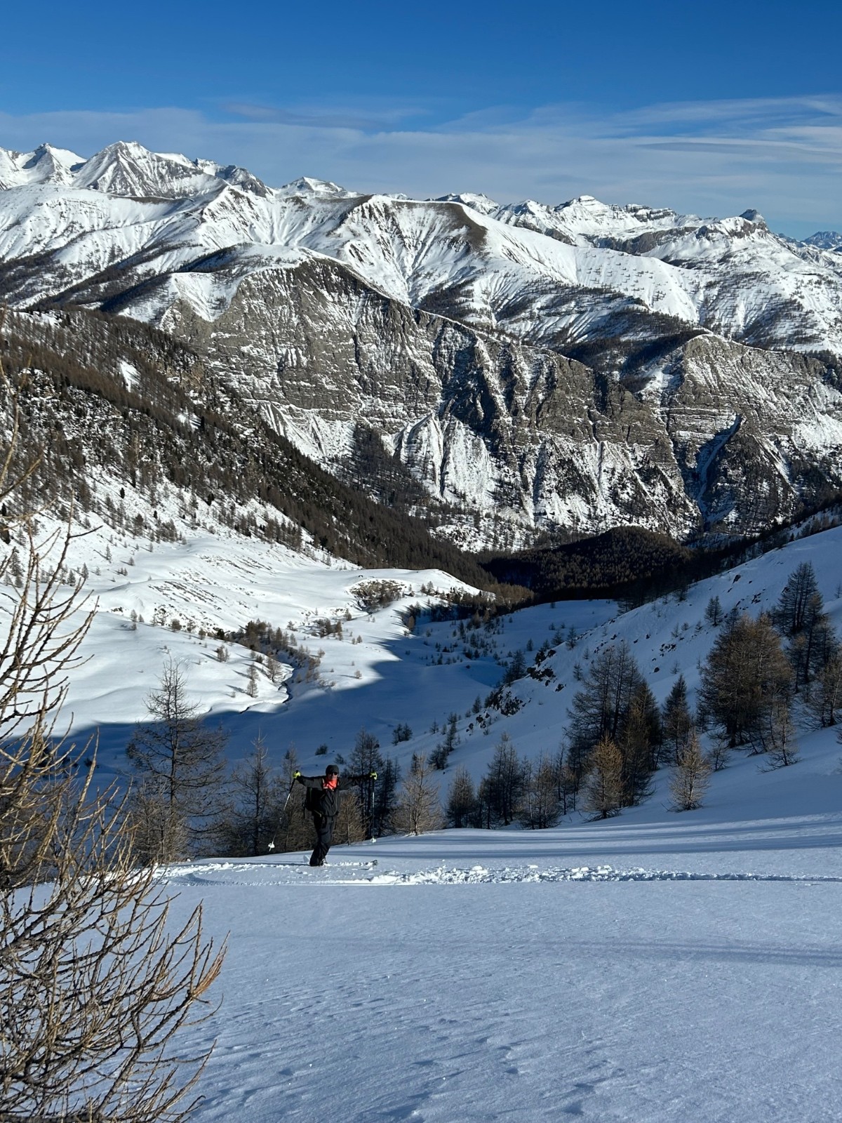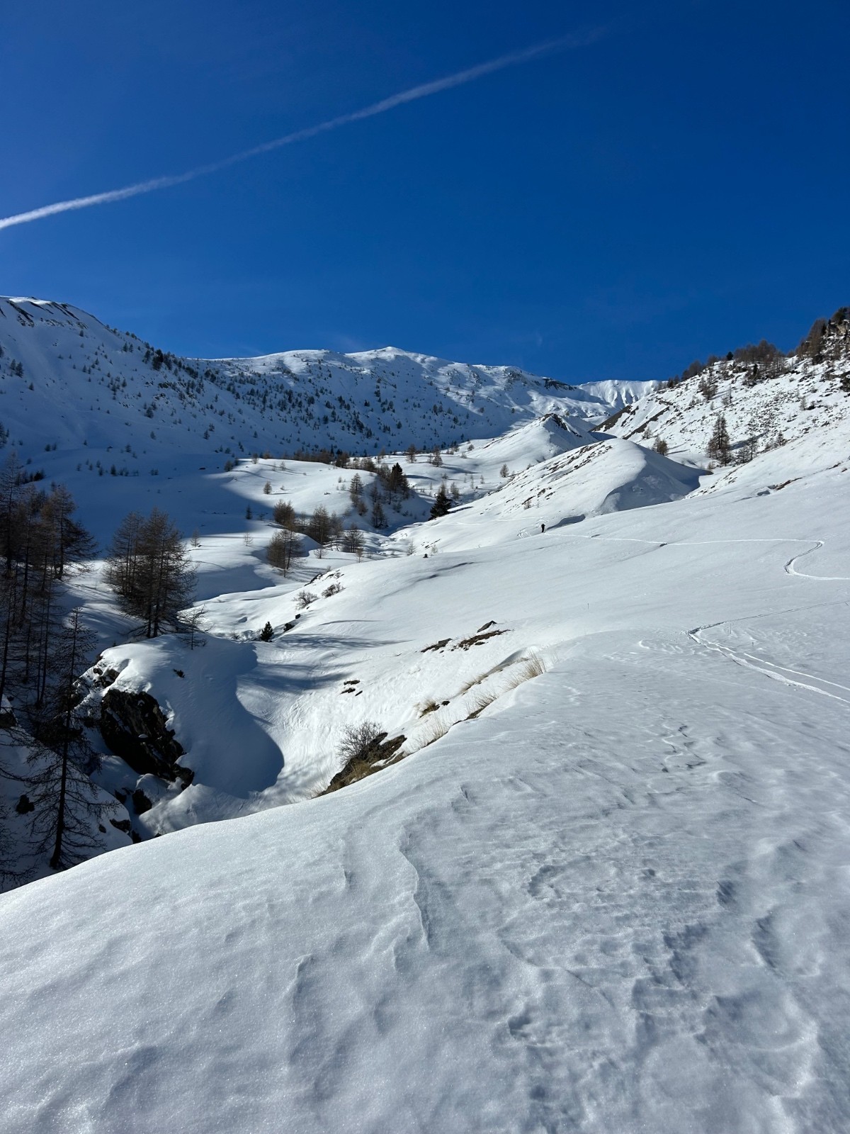 Itinéraire suivi : montée par le vallon Chabaud déjà avec des températures printanières et une neige tout juste transformée ( humidifiée) et une descente en versant Est et Nord-Est vers le vallon Joyeux avec une neige poudreuse sur les 400 premiers mètres et ensuite du carton dans la foret humidifiée qui regèle car toujours à l'ombre.