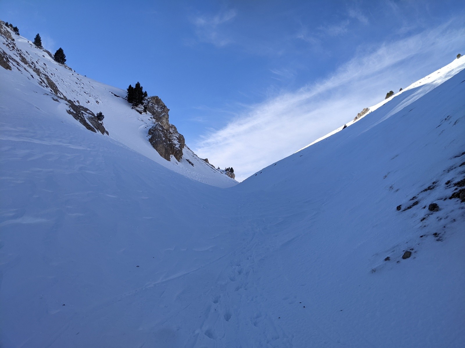 La trace dans le ravin est dure et très glissante, on passe vite sur le côté. Un peu de vent là-haut mais pas très méchant.