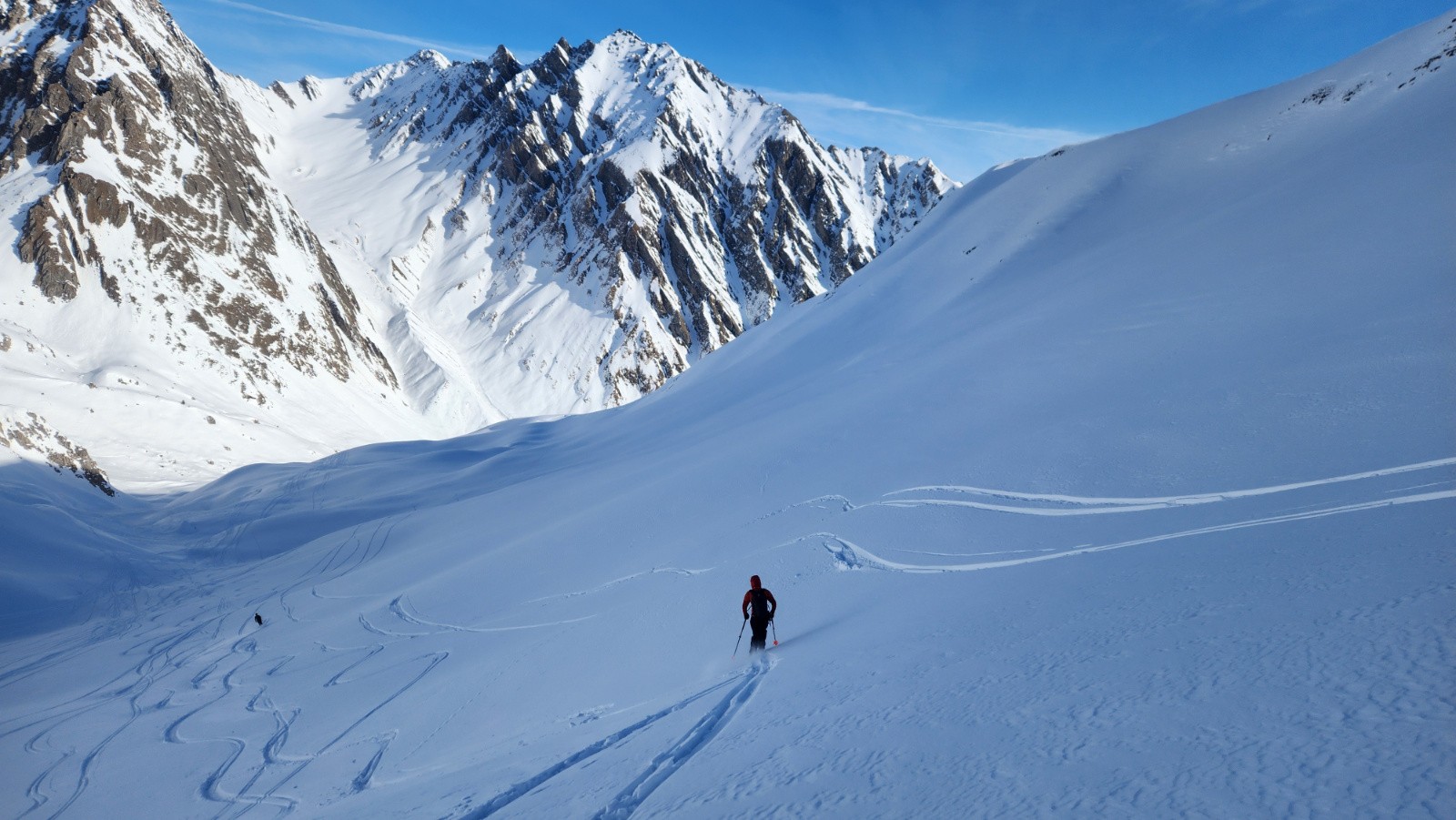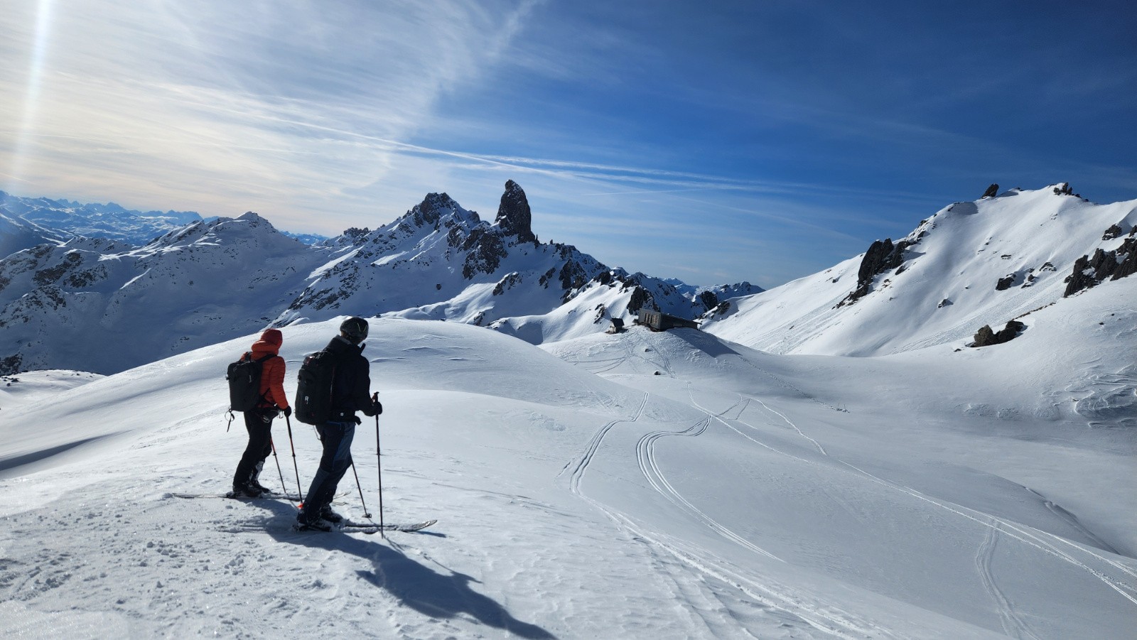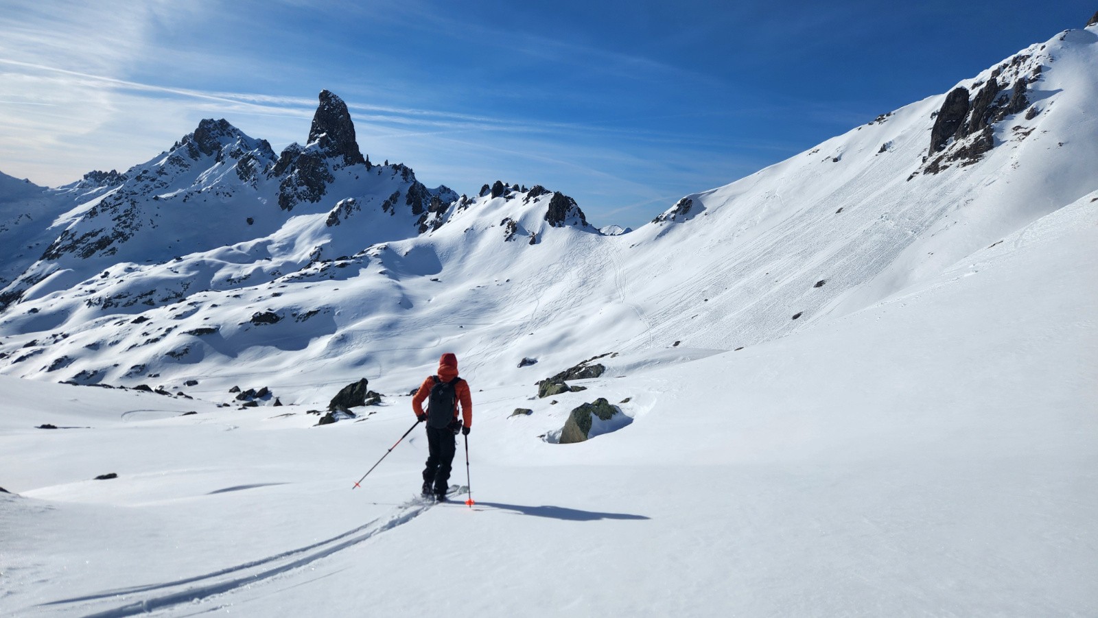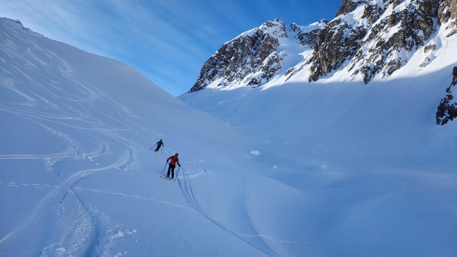 Conditions pour le ski : Neige poudreuse légère à l'ombre, en altitude neige poudreuse au soleil, plus bas, la croute de regel s'était décomposée, du coup du bon ski