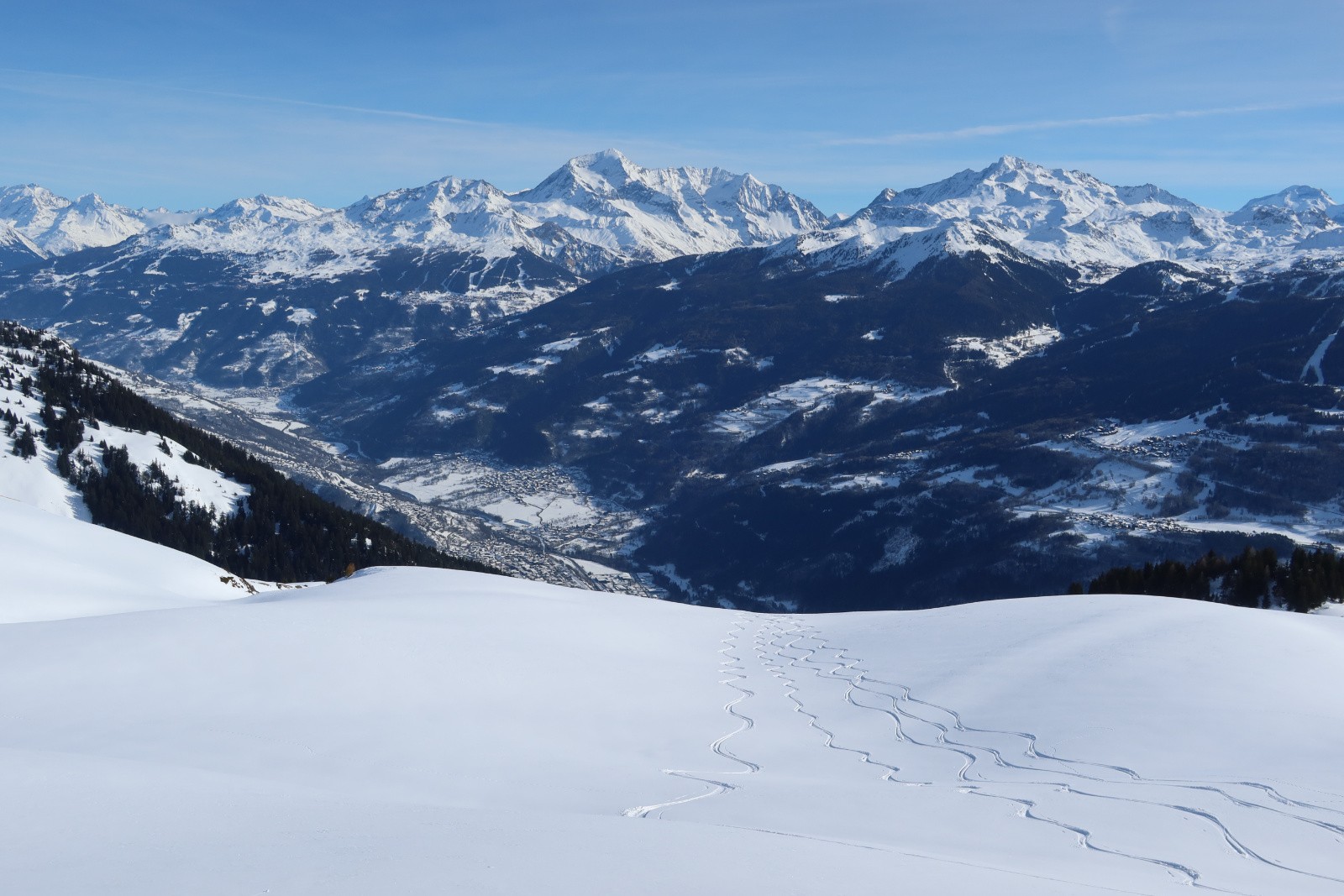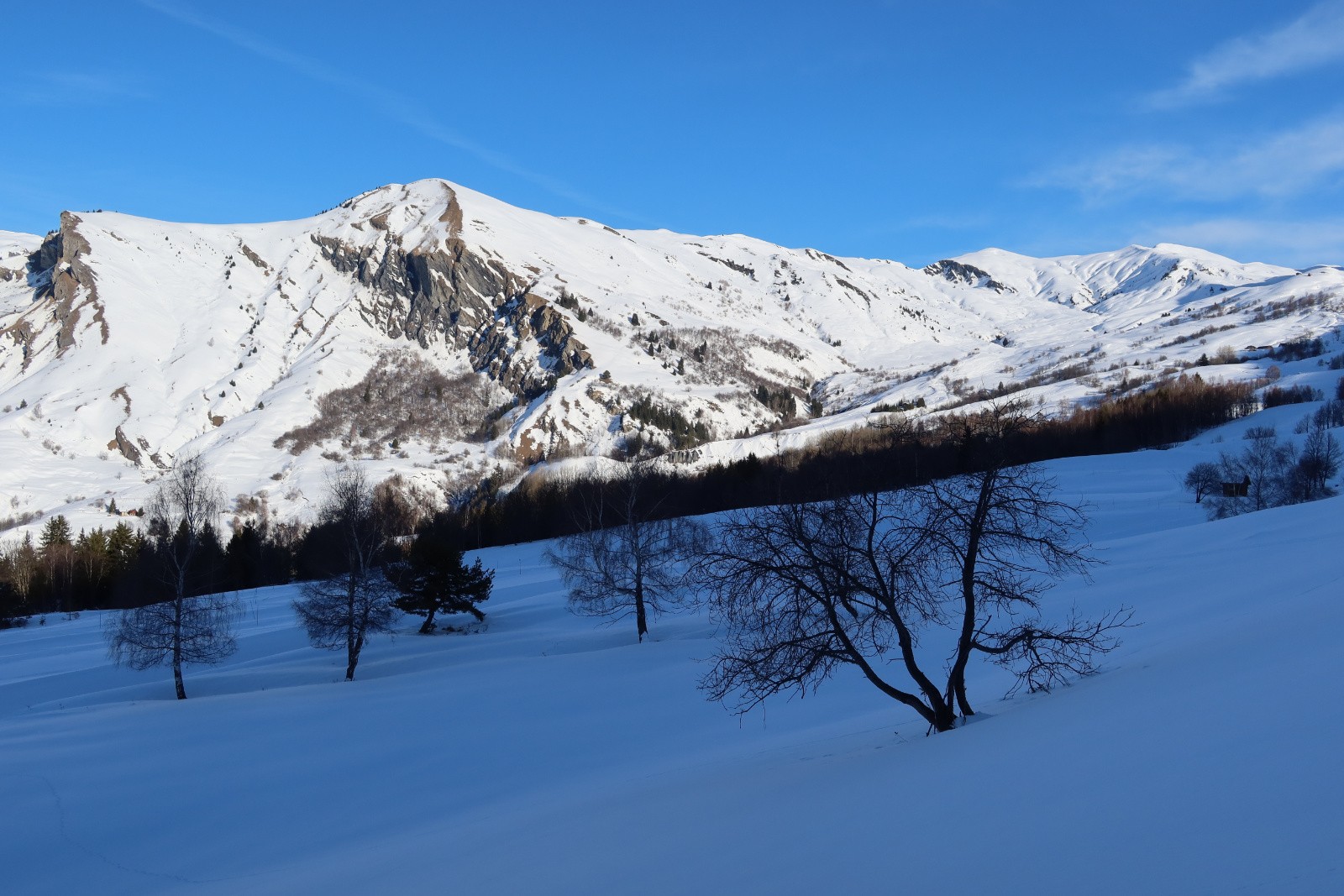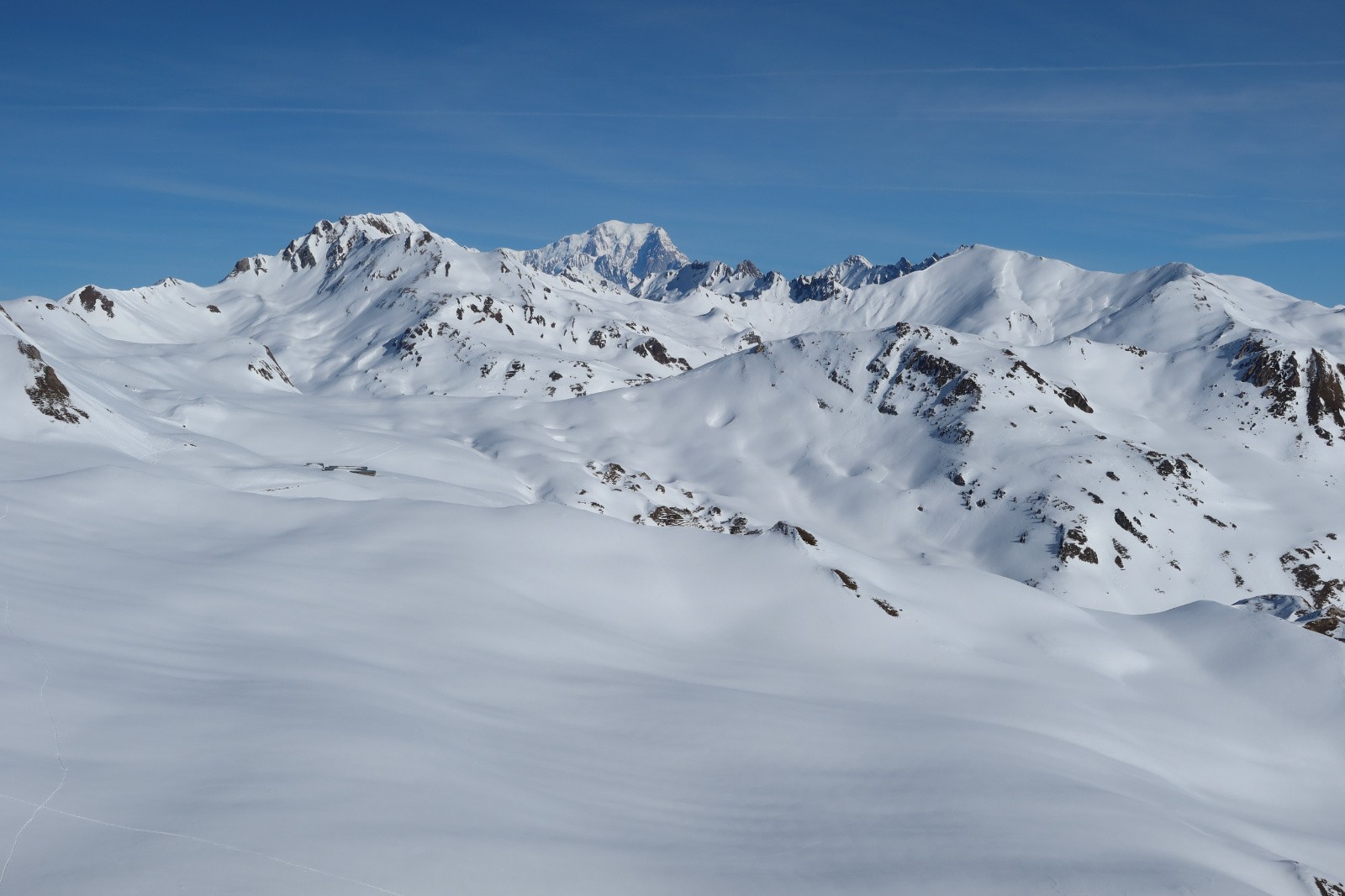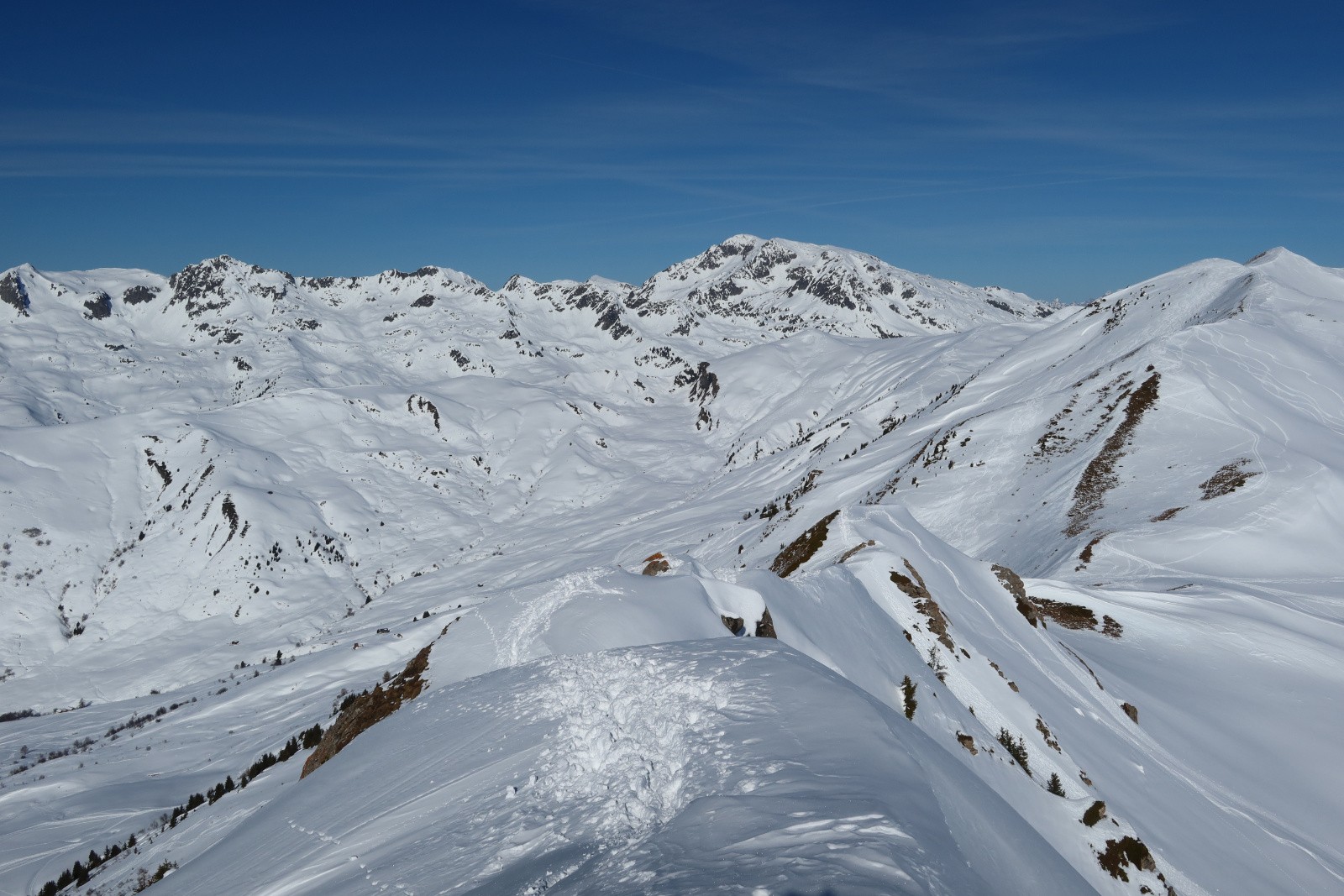 Conditions pour le ski : Neige en cours de tassement mais encore très agréable à skier sauf dans les orientations sud où ça a chauffé et sur les crêtes où c'est pelé (fond dur). Quelques zones un peu croûtées/cartonnées sur les bombements. Neige lourde sous 1500.