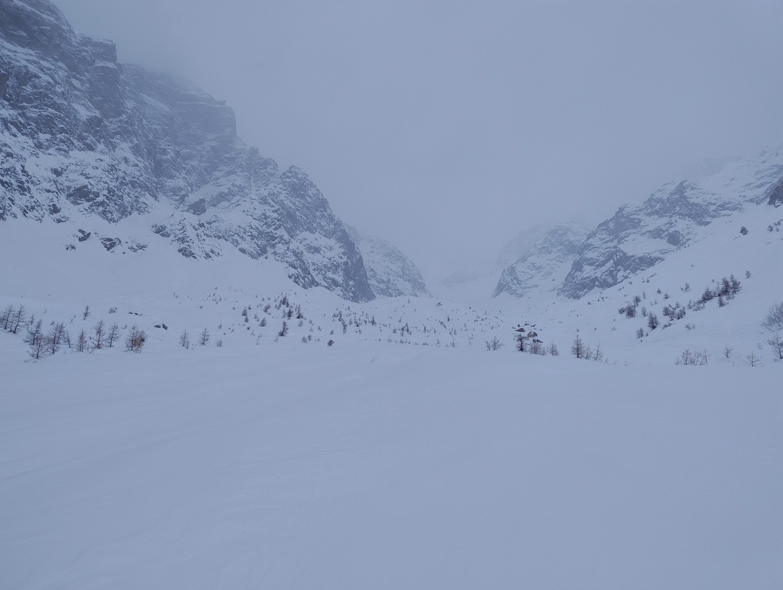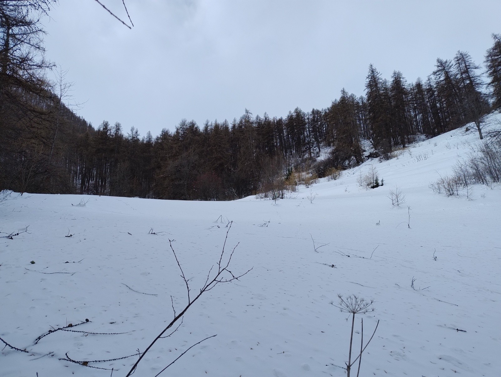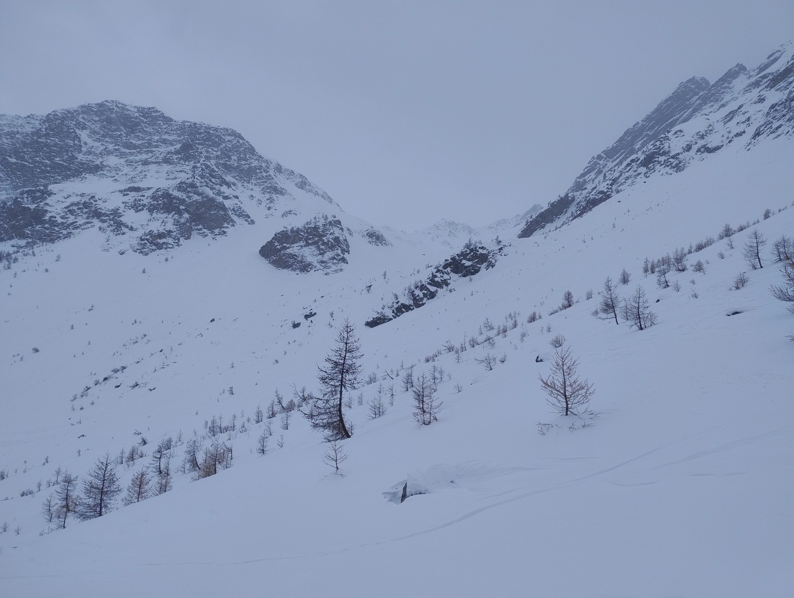 Dans la montée, on remarque plusieurs plaques anciennes parties sur les pentes sud à sud-est du vallon. La plupart font environ 20 m de large, mais l'une d'entre elles a une largeur d'environ 100 m, dans une zone d'arbres clairsemés. Pas de signes d'instabilité observés ce jour pendant la montée (pas de woumfs, pas de fissures).