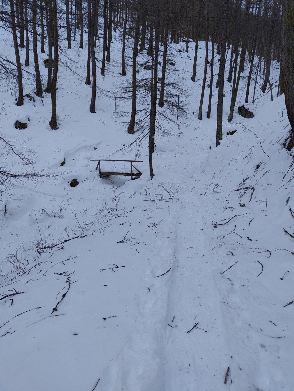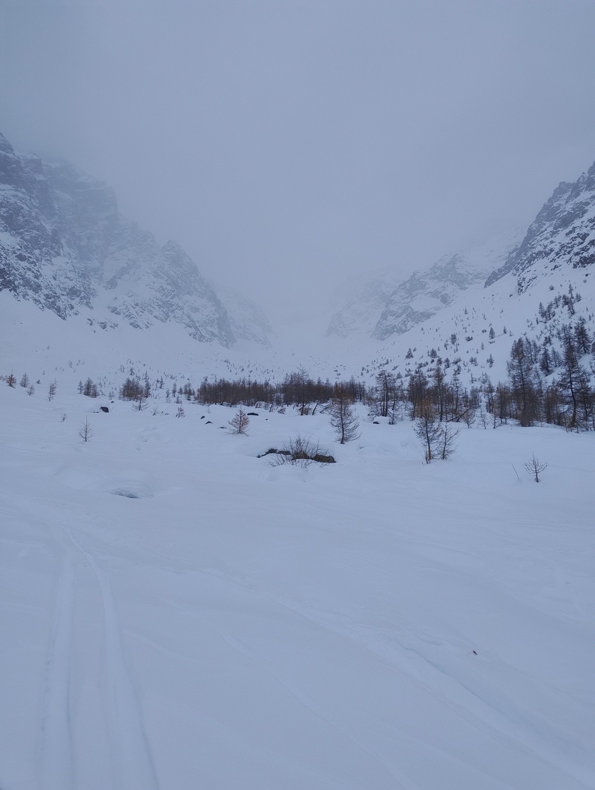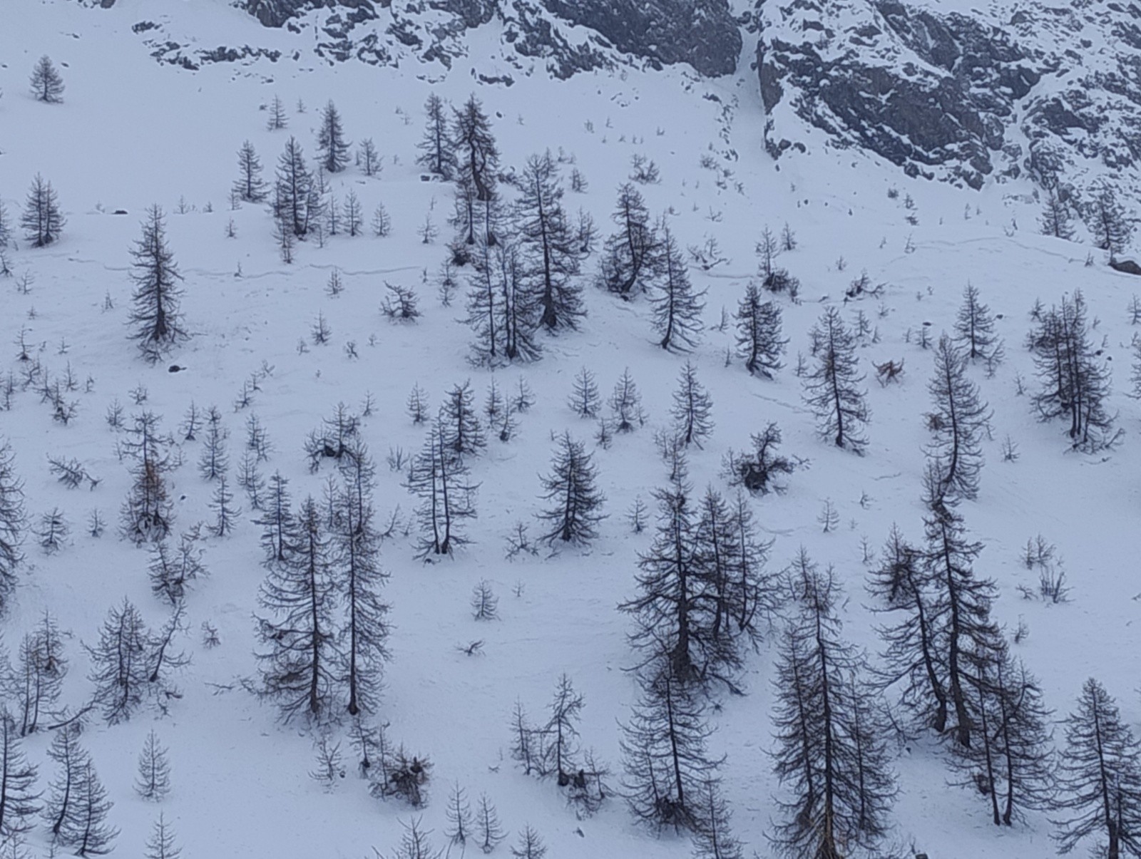Dans la montée, on remarque plusieurs plaques anciennes parties sur les pentes sud à sud-est du vallon. La plupart font environ 20 m de large, mais l'une d'entre elles a une largeur d'environ 100 m, dans une zone d'arbres clairsemés. Pas de signes d'instabilité observés ce jour pendant la montée (pas de woumfs, pas de fissures).