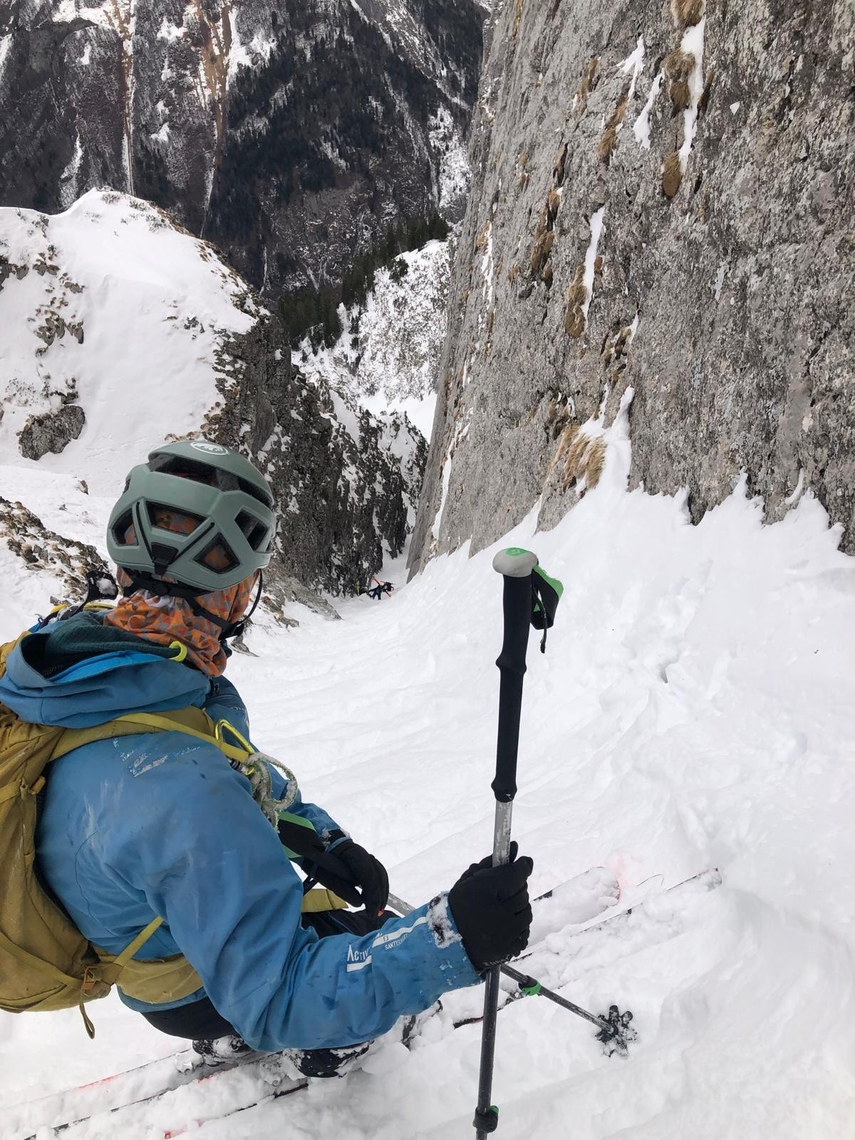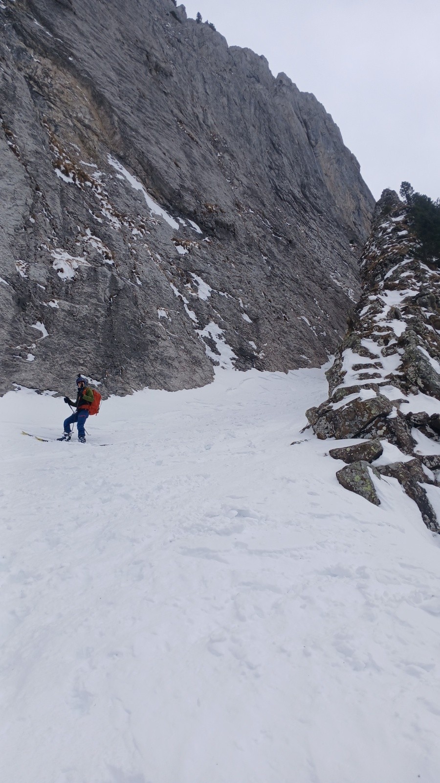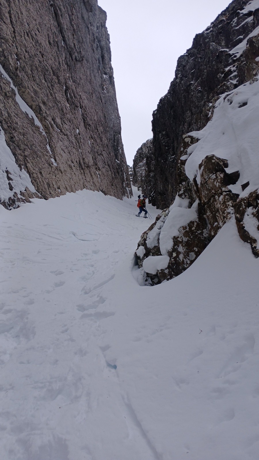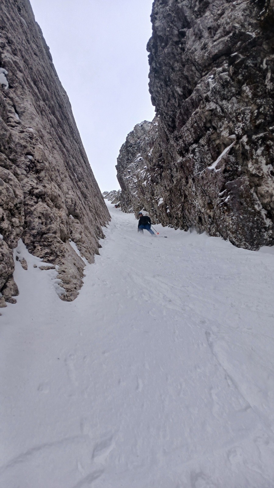 Dans la faille, la neige est tassée avec beaucoup de grip ce qui rend la descente bien sécurisante. Même si, entre les anciennes traces et l'étroiture du couloir, c'est pas toujours évident de faire des virages!