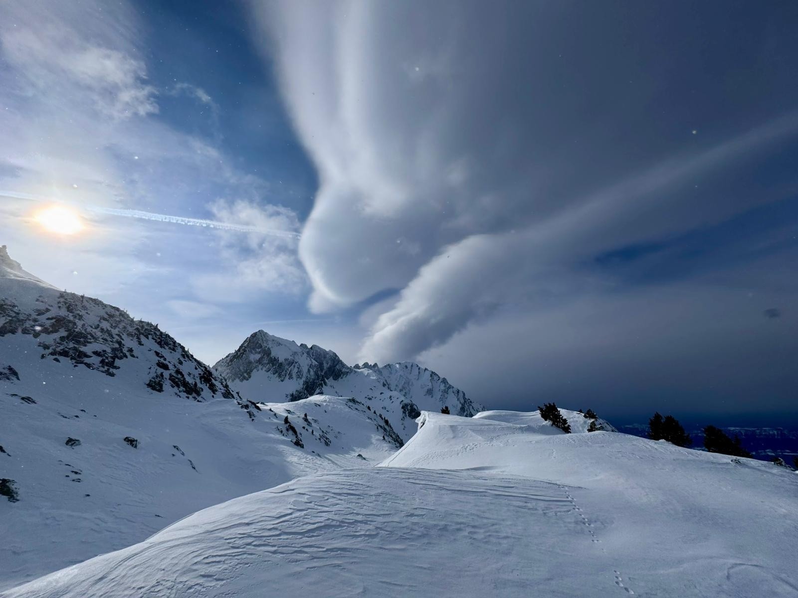 Itinéraire suivi : montée au pas du gargoton en suivant les traces d'illustres prédécesseurs. Ça a tellement soufflé qu'on monte sur le négatif de la trace initiale par moment. Ça se calme progressivement en arrivant vers le pas et on a l'impression de profiter d'un des rares coins du secteur à l'abri du vent et avec une vue dégagée.