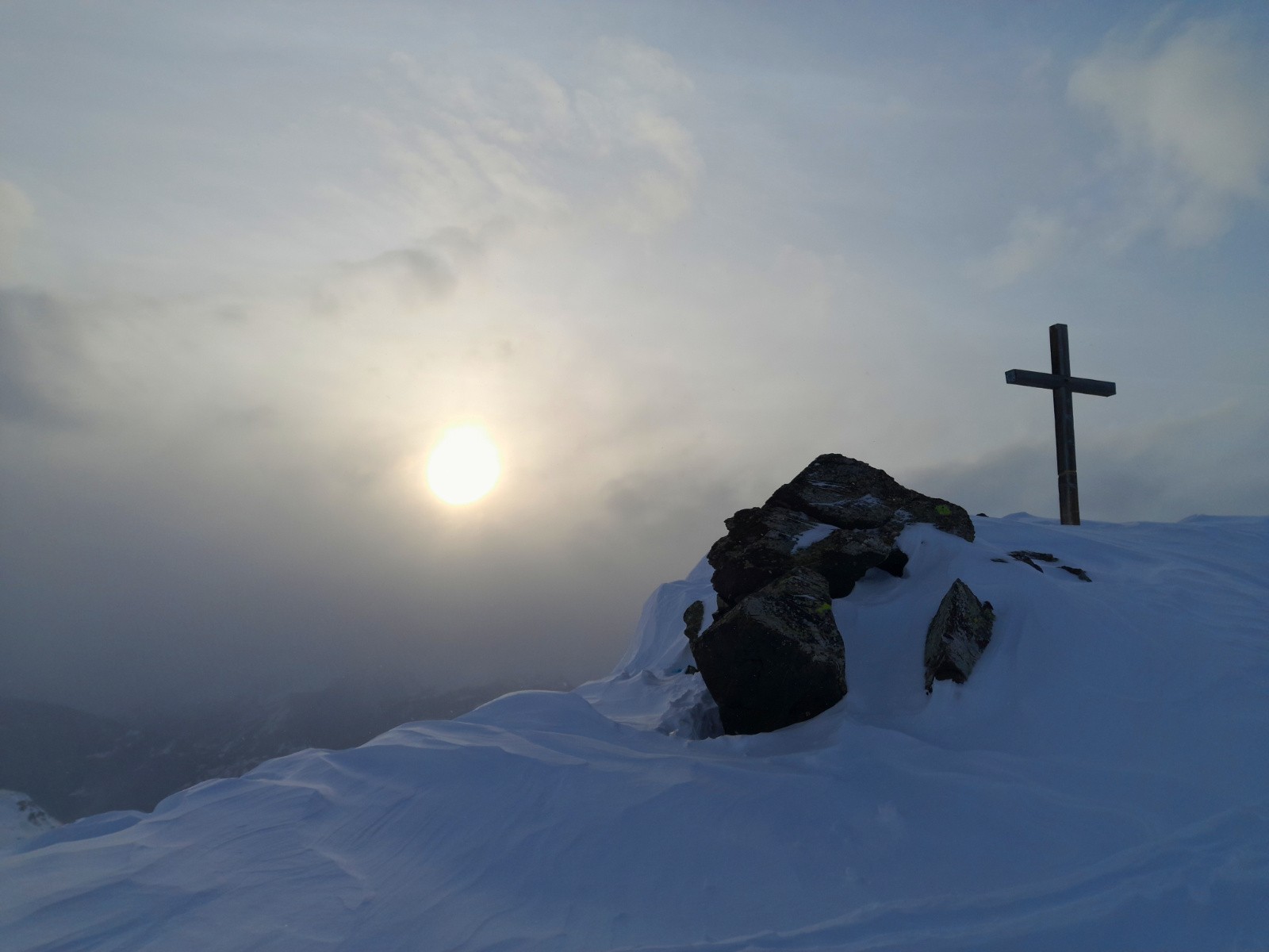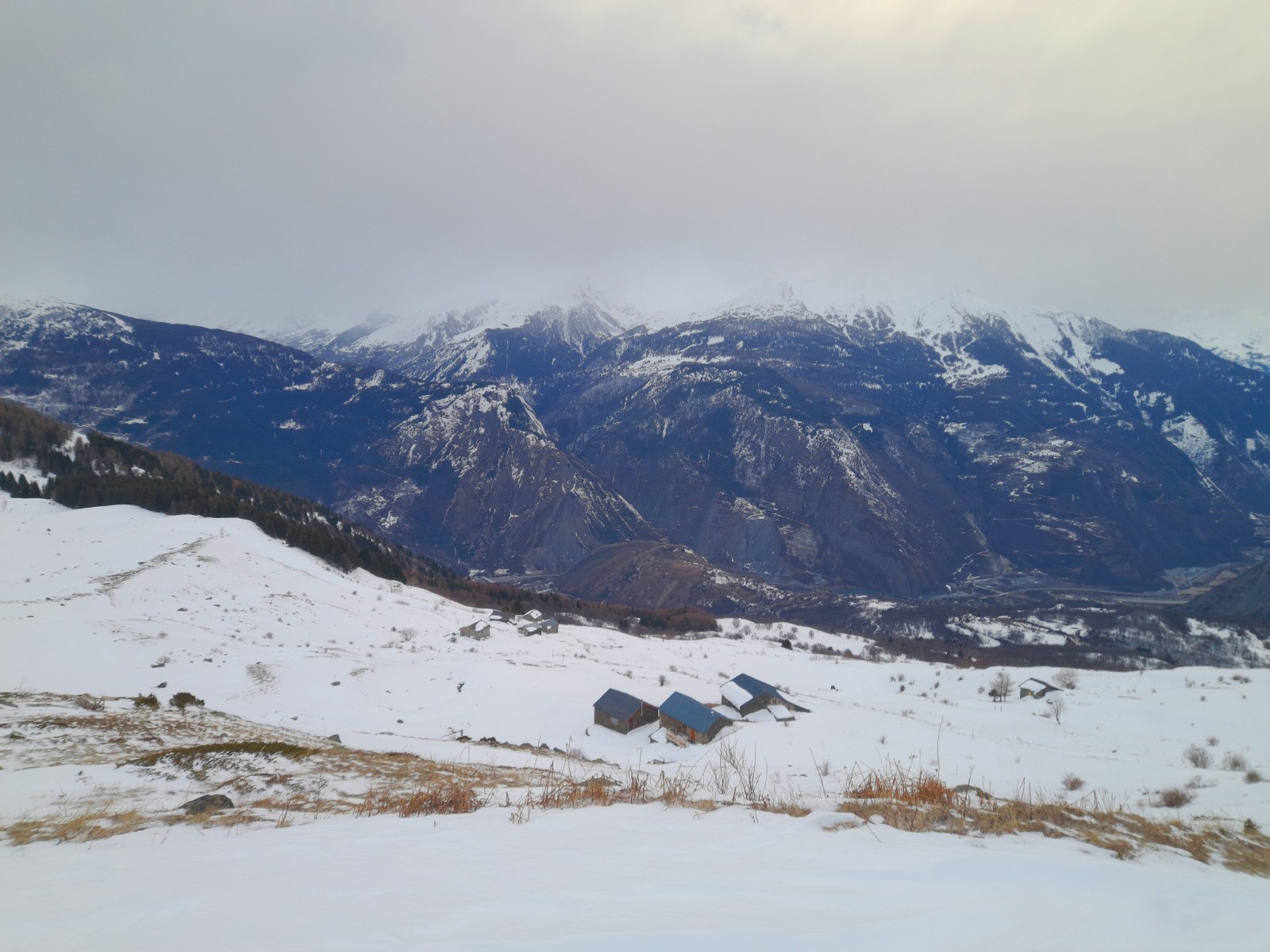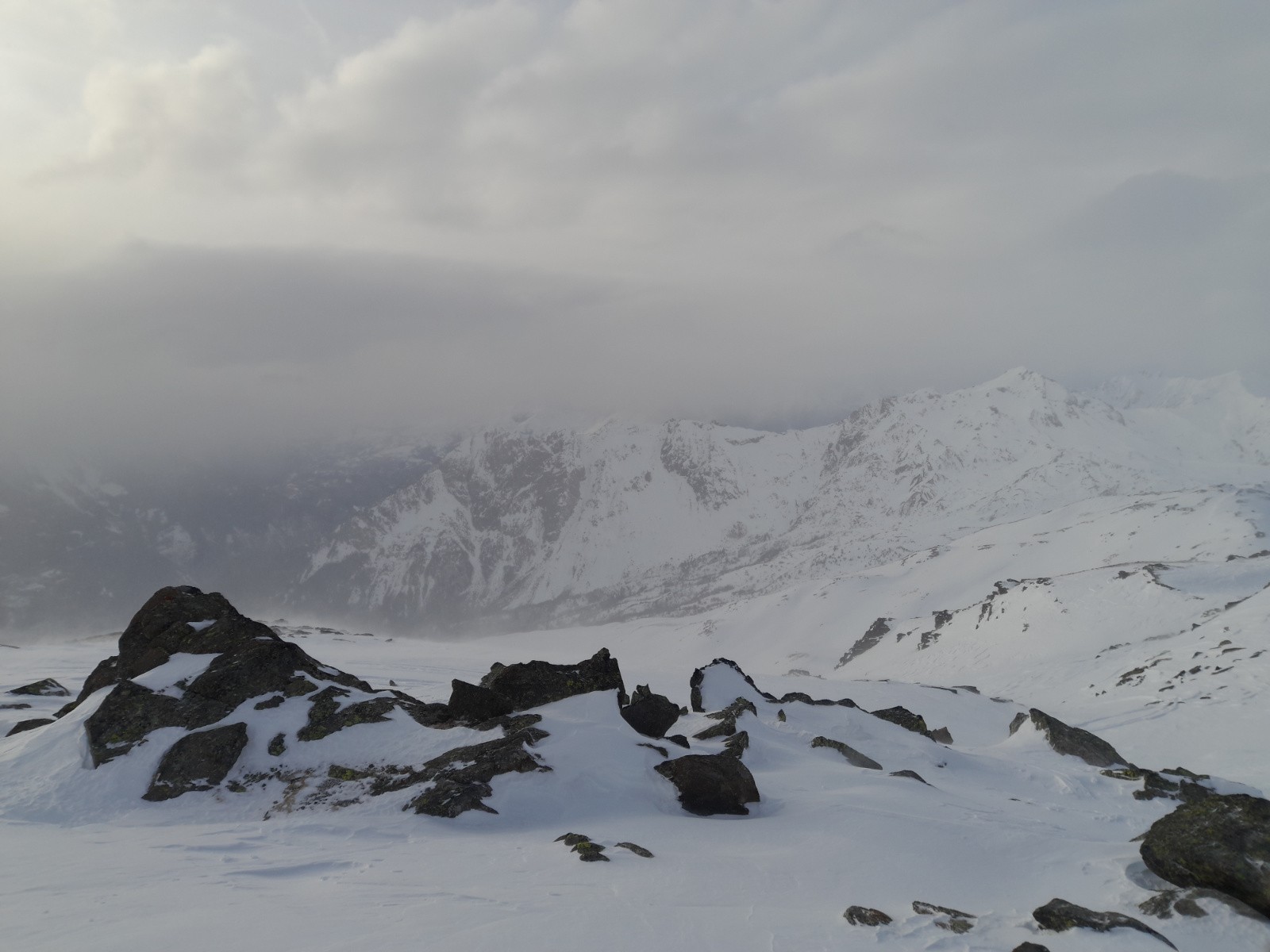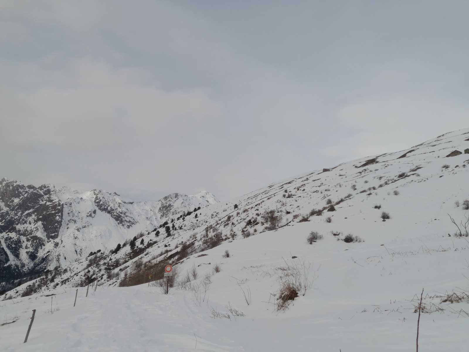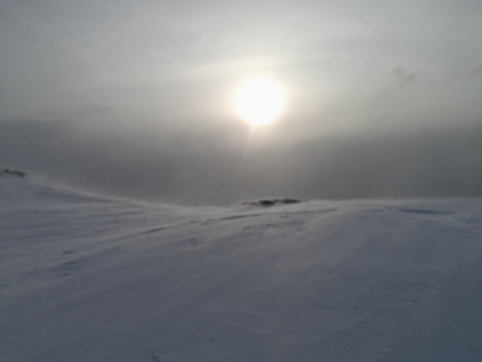 Météo/températures : Températures positives au départ à 1.450m, ressenti négatif au Col de Pierre Blanche du au vent d'est fort, Ciel voilé avec quelques flocons à l'horizontal, une éclaircie sur la crête, sinon conditions jour blanc