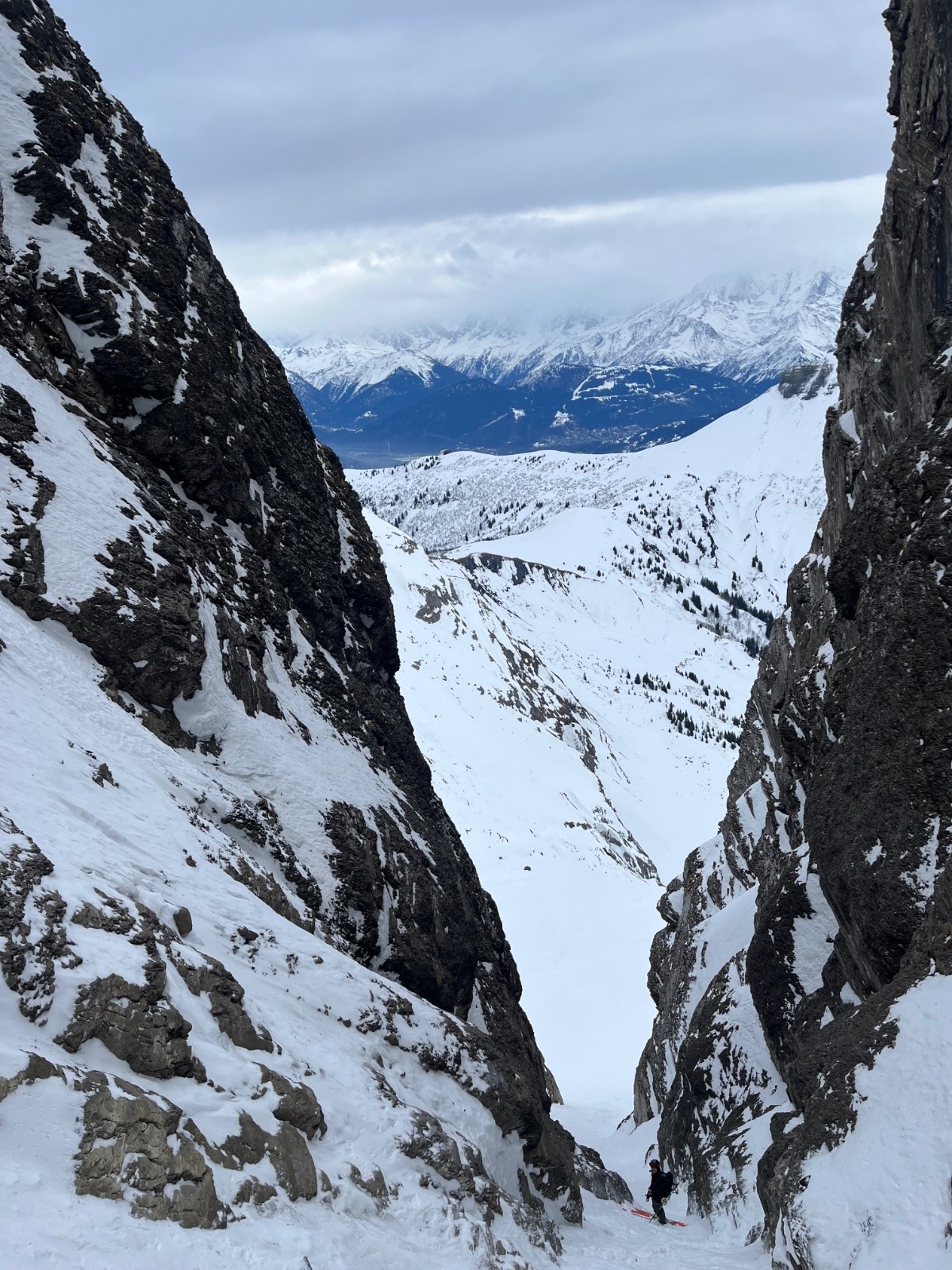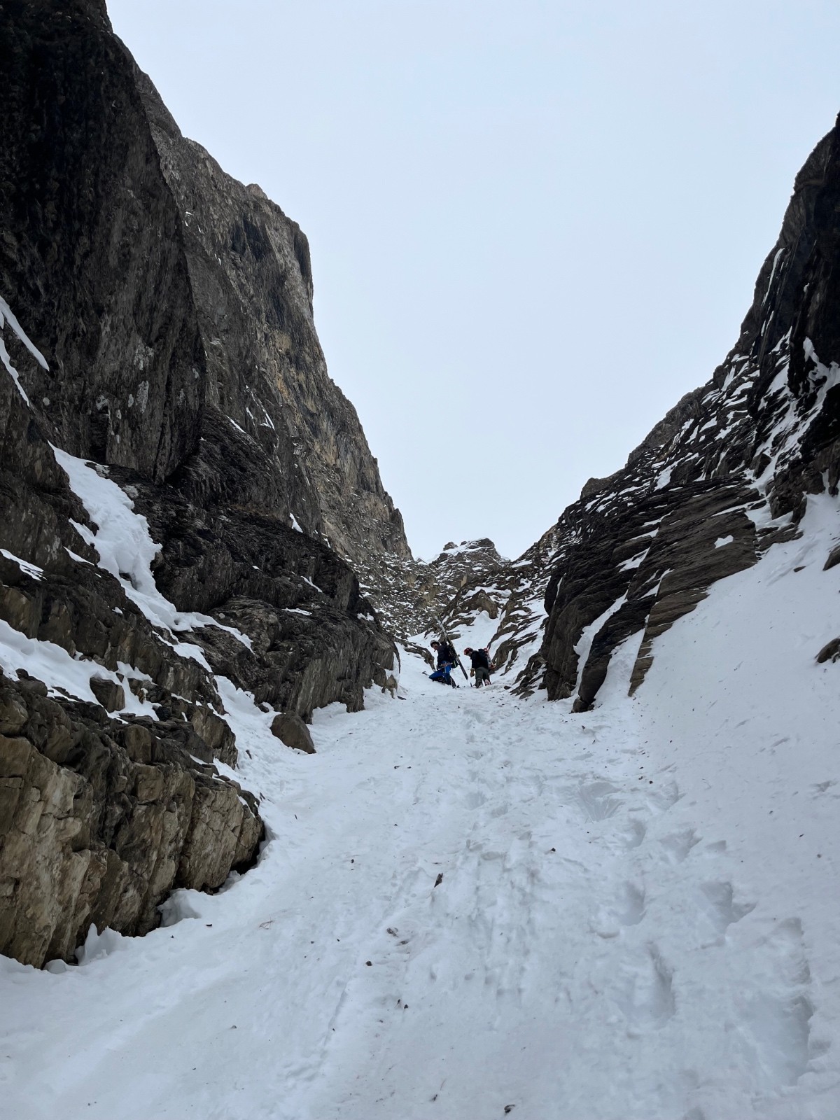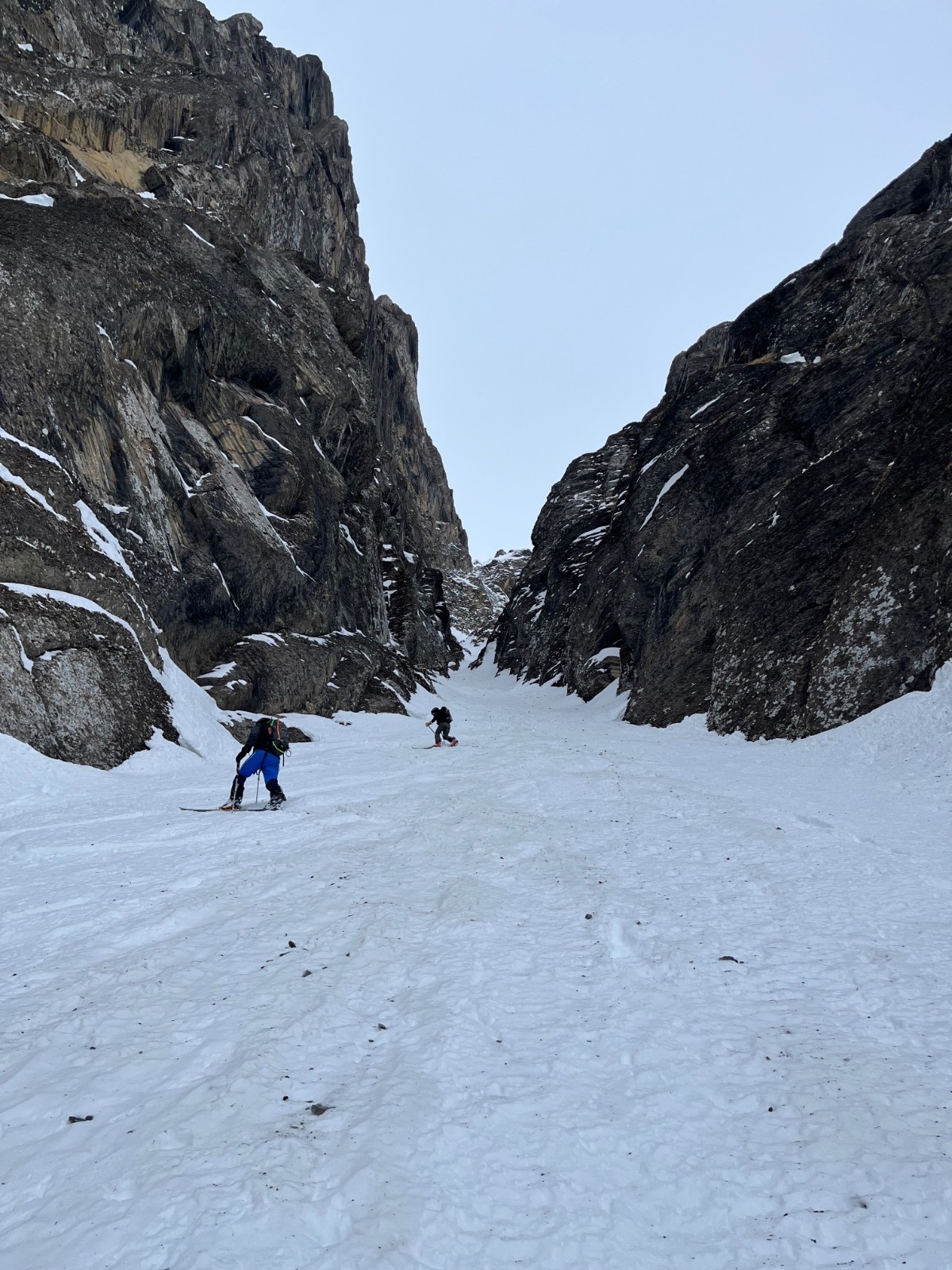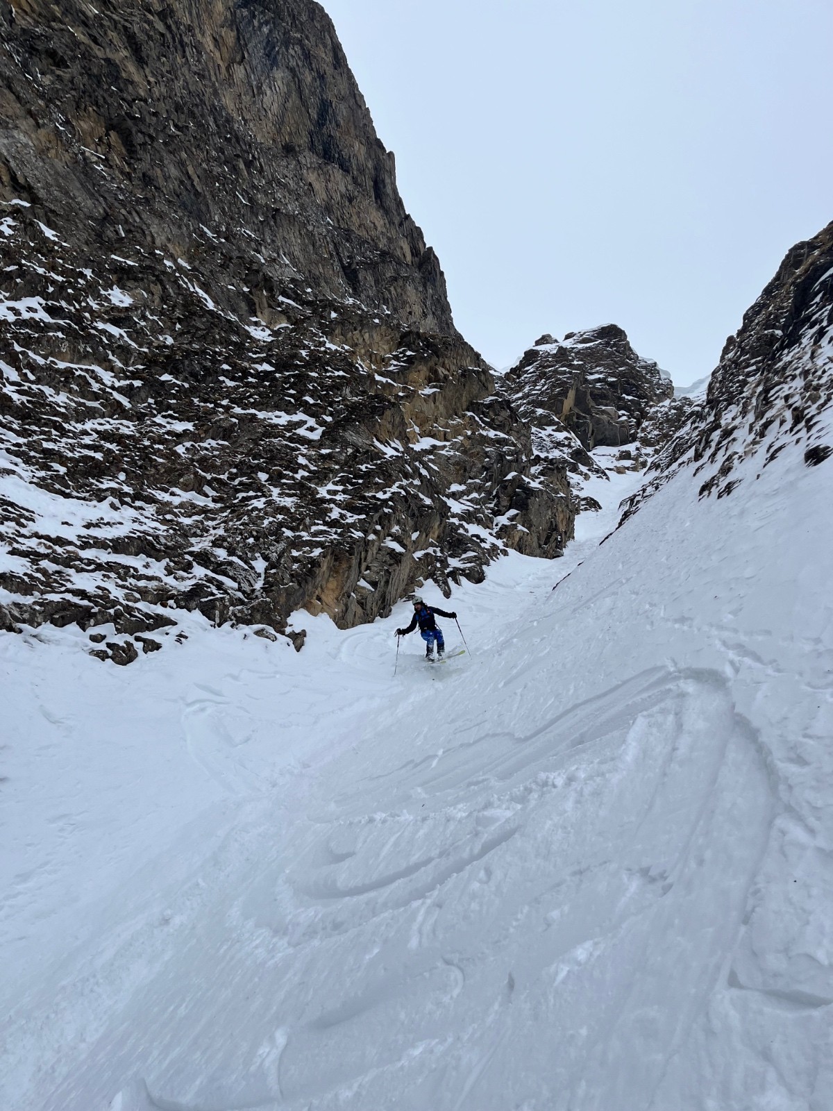On a jeté notre devoluy sur le couloir du chien, qu’on s’imaginait moins sec. Mais bon, une fois au pied, on va voir en haut si on y est. Couloir assez étroit au vu de la sechitude, rendant le ski technique. Ambiance très devoluarde avec ce rocher stratispherique vraiment esthétique. Revers de la médaille, on se fait parfois asperger de petits cailloux. Mais pas tant. Descente pas tant simple donc, avec un passage plus étroit que la longueur des skis de Marian. Déchaussage ou improvisation, au choix.