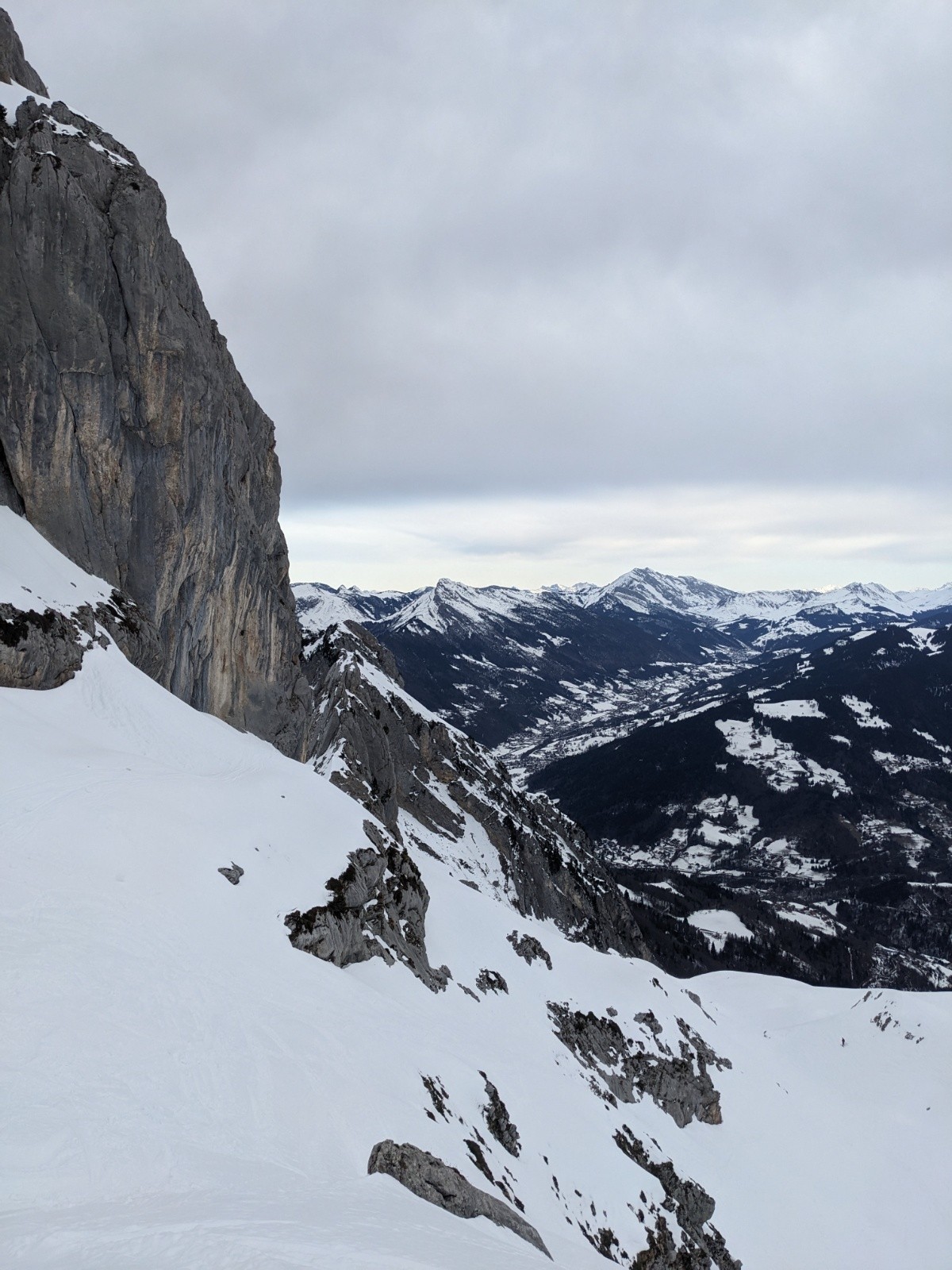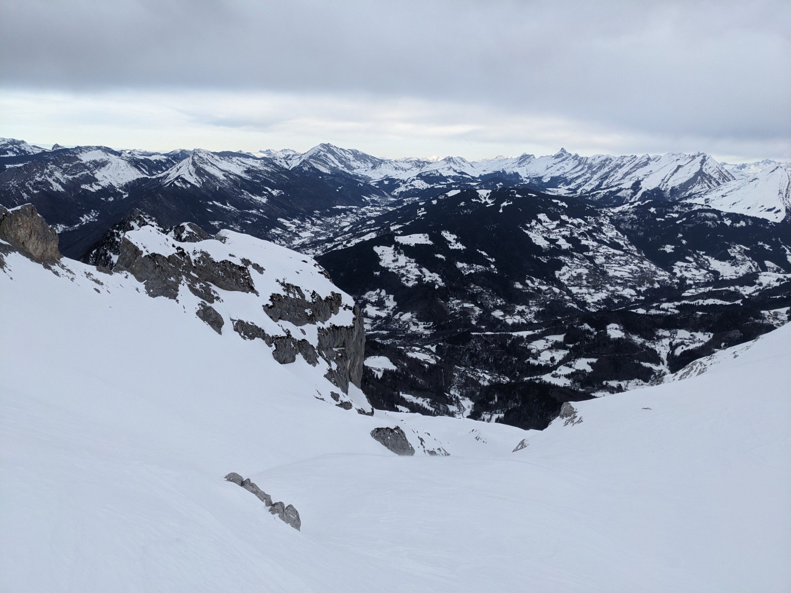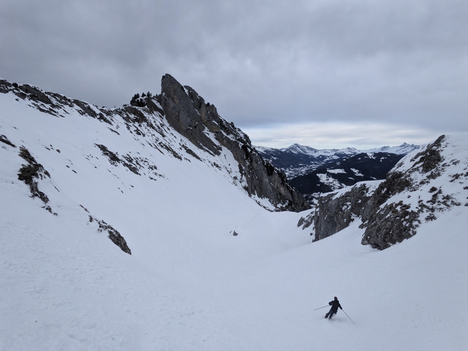 Descente plutôt moyenne dans une neige changeante et jour blanc.