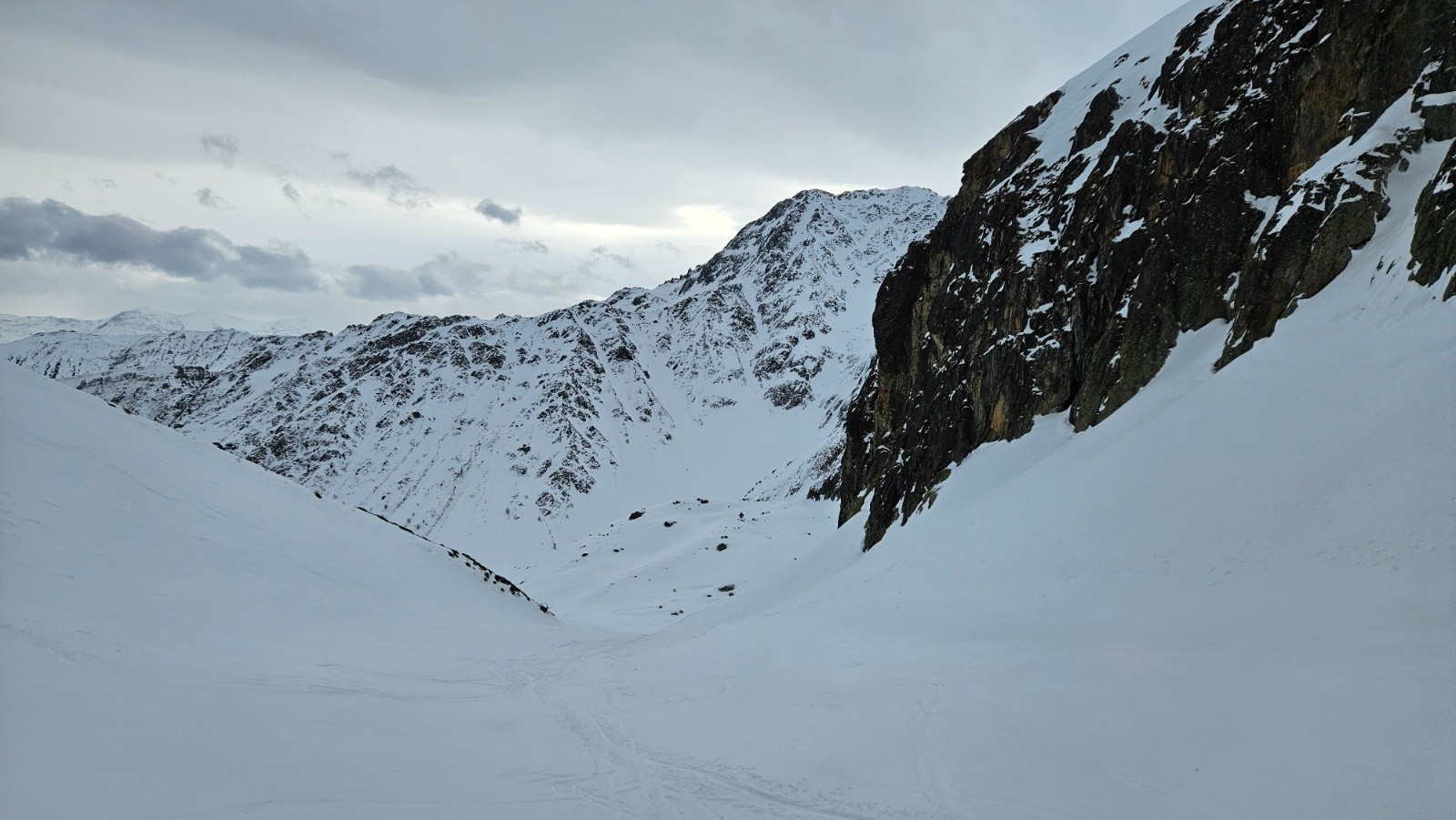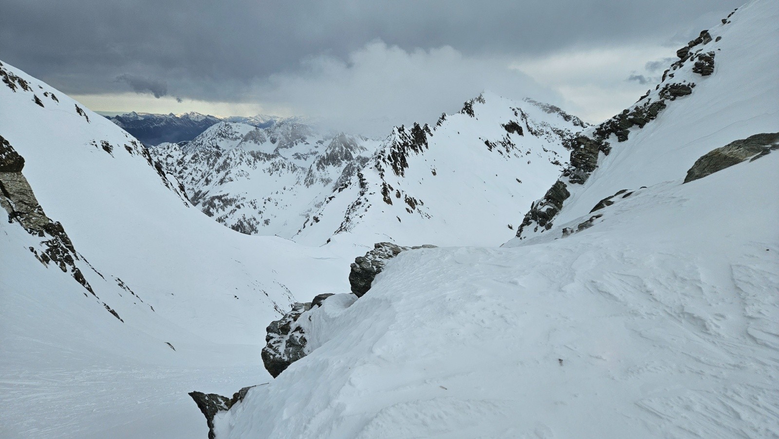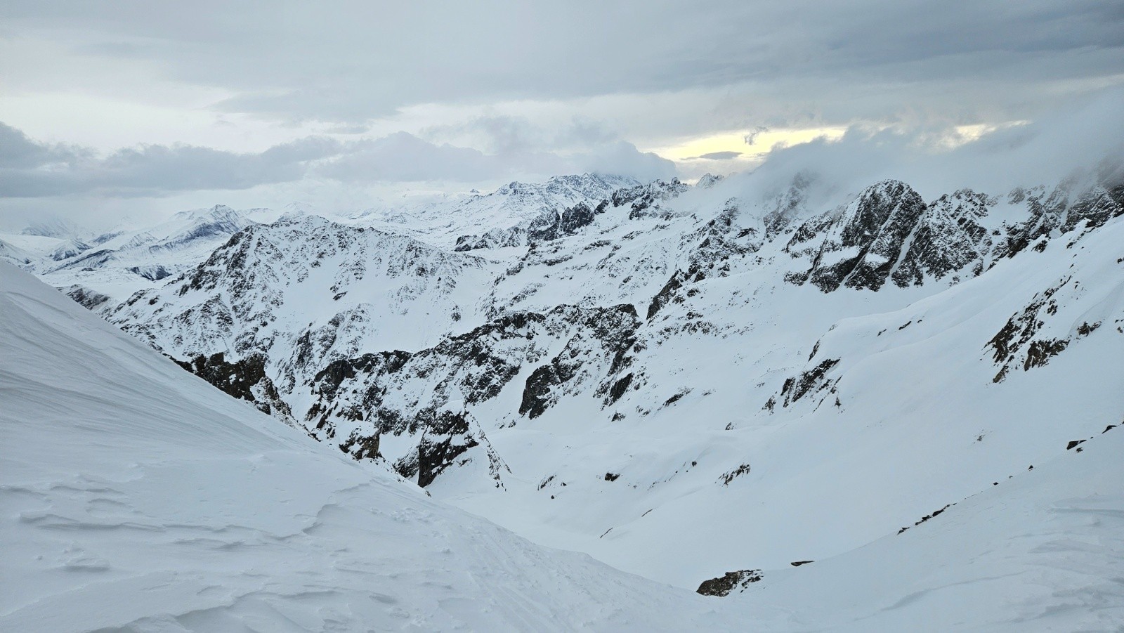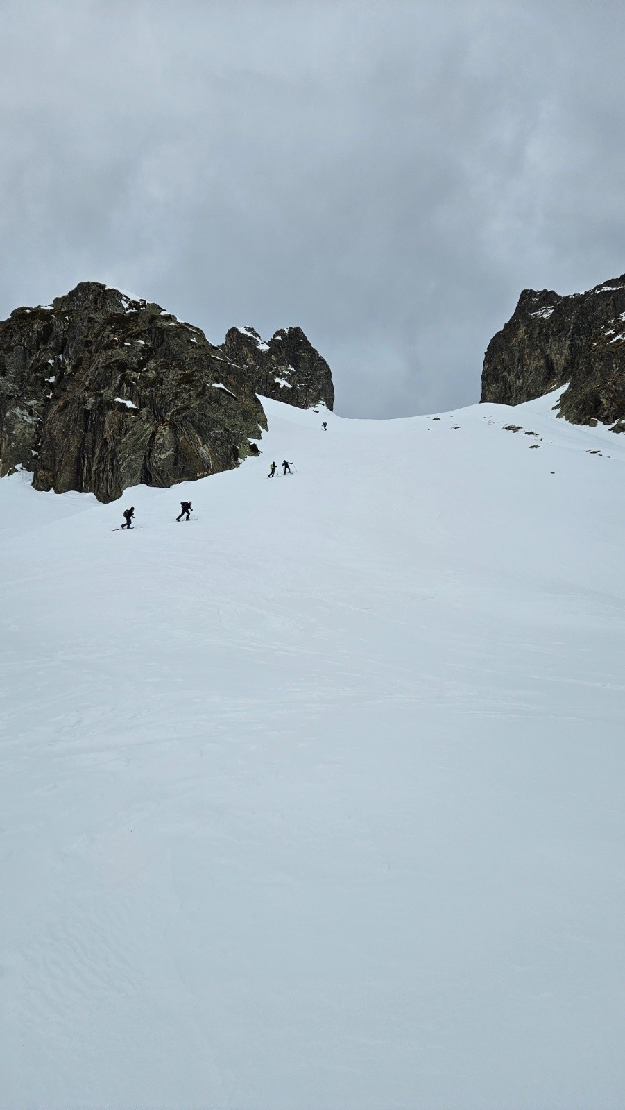 On a failli abandonner vers 2500m à cause du vent et du froid, mais l'espoir de trouver de meilleures conditions dans le vallon des Roches nous a motivés à tenir jusqu'au col, après avoir revêtu toutes nos 4 couches. Heureusement qu'on était bien équipés.