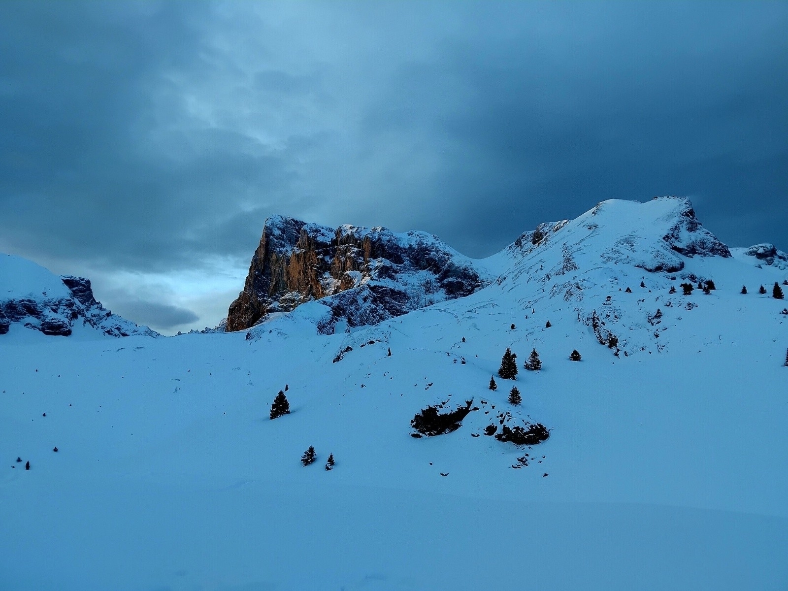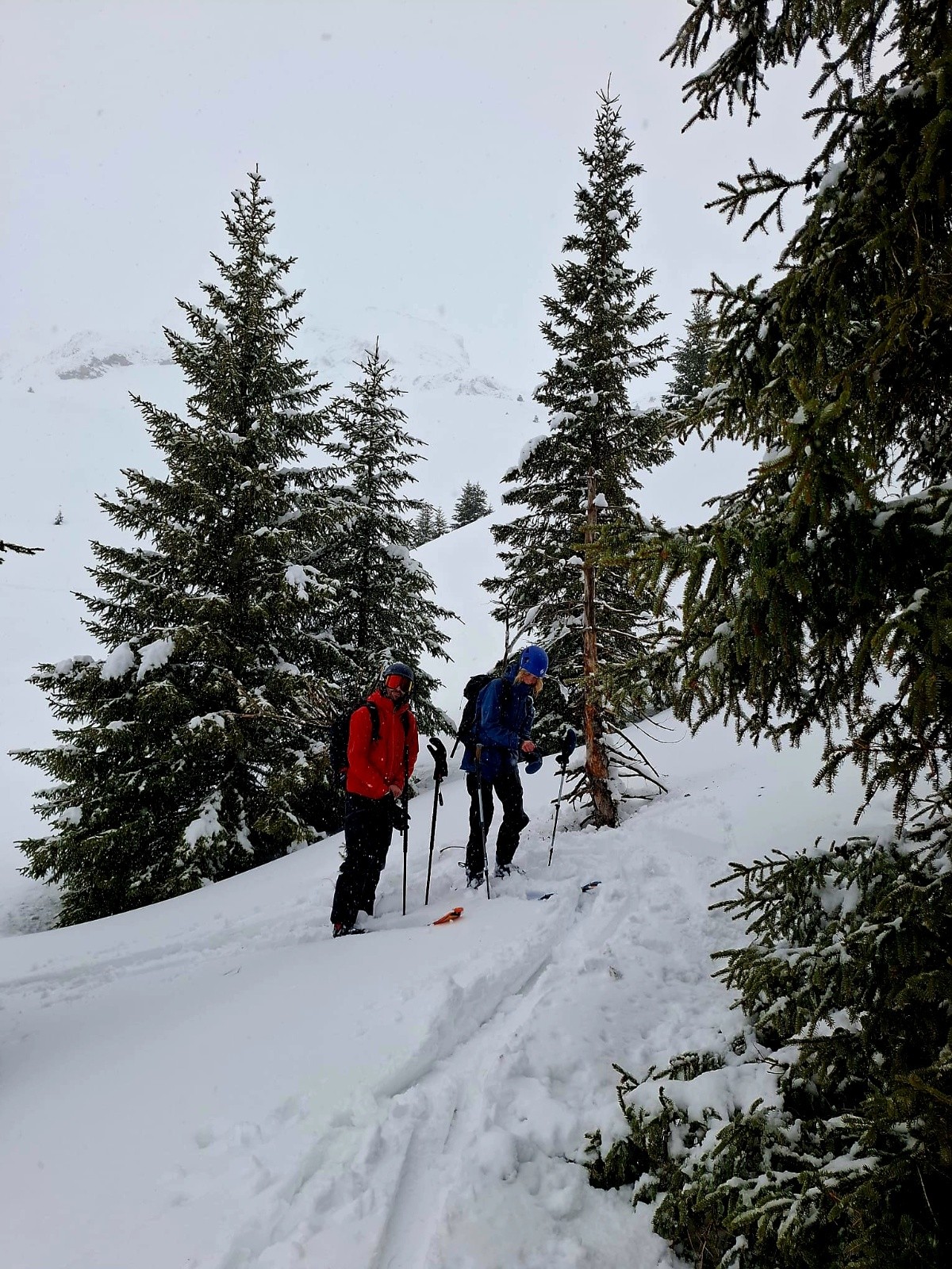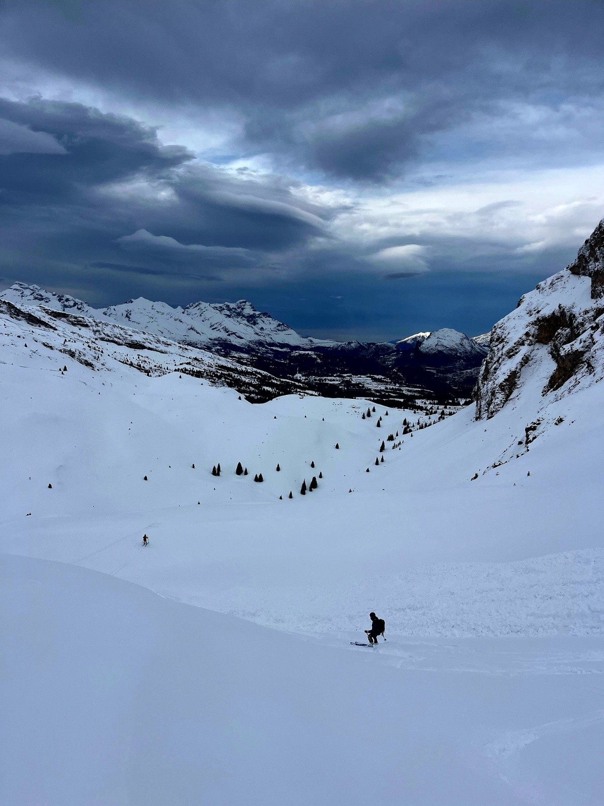 Le dimanche, on part sens horaire on remonte le vallon froid. Belle neige fraîche.au col on voit des coulées.