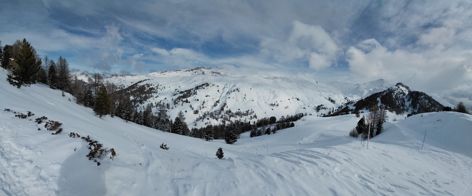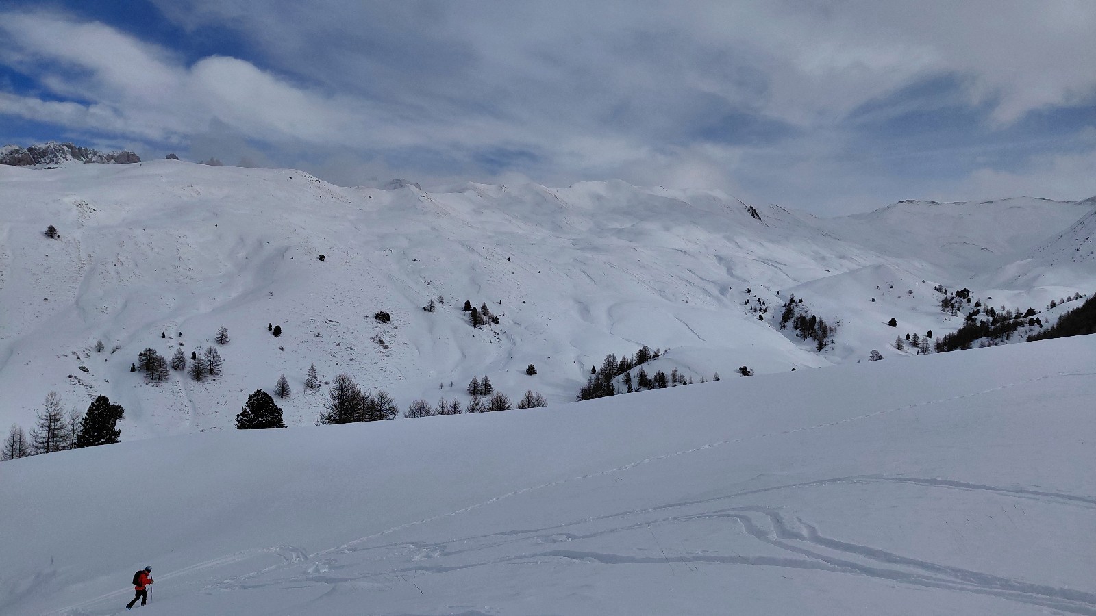 Itinéraire suivi : Au départ de Vars Ste Marie, pris est vers la déchetterie, puis le sentier piéton, puis rapidement remonté les pentes en rive droite en direction du ravin de Bialet que l'on traverse. Il y a 2 barbelés à franchir, avant de retrouver le sentier balisé venant de Ste Catherine suivi jusqu'au point 2093, puis le sentier d'été à gauche vers le point 2195. On est remonté vers les crêtes de la Selle (je me suis arrêté 70m en dessous), puis redescente vers la cabane du Vallon dans le creux des combes bien bon, la neige y a été bien rapporté. Par contre en ouest, c'est assez déneigé. Pris ensuite le cheminement piéton (légèrement descendant) puis repeauté pour aller au sommet de Peynier, avant de prendre la piste rouge de descente.