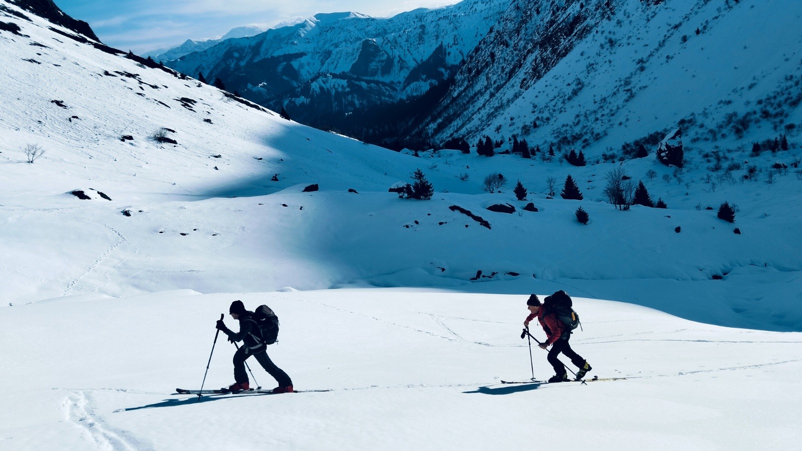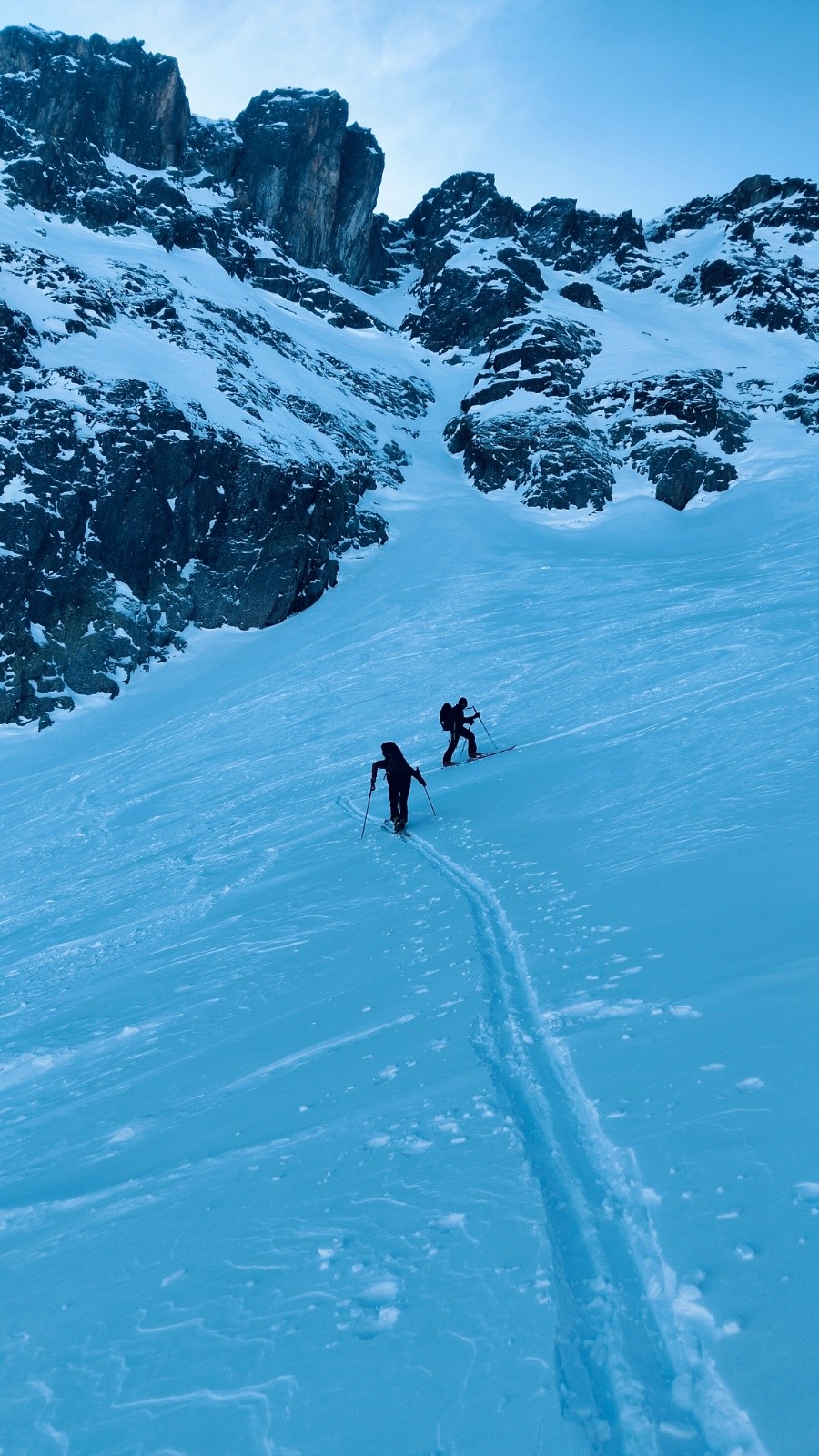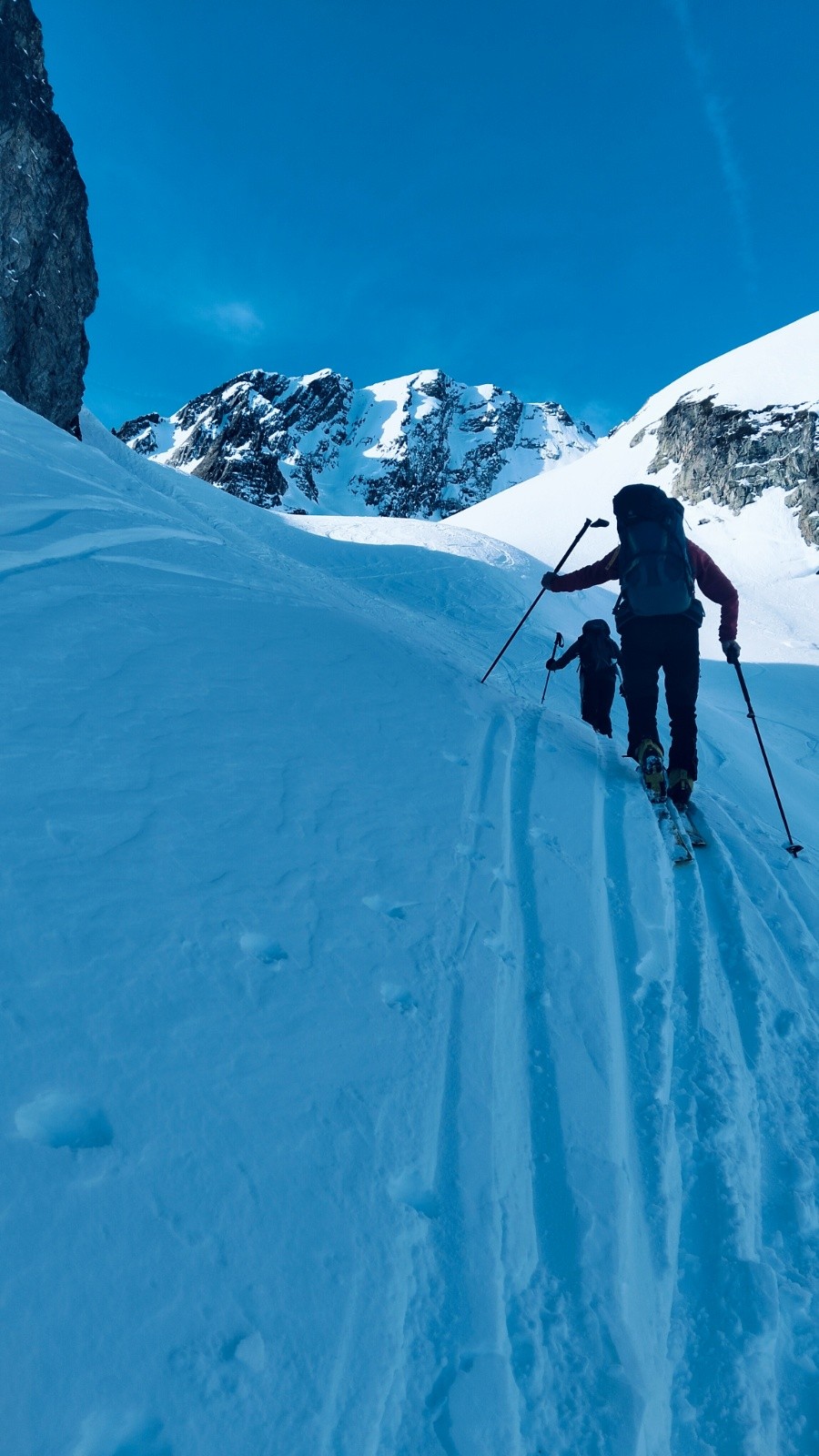 Du coup retour en boucle par la face sud de boucherin. Neige froide dans le fond du vallon, jusqu'à rejoindre nos traces de montée.